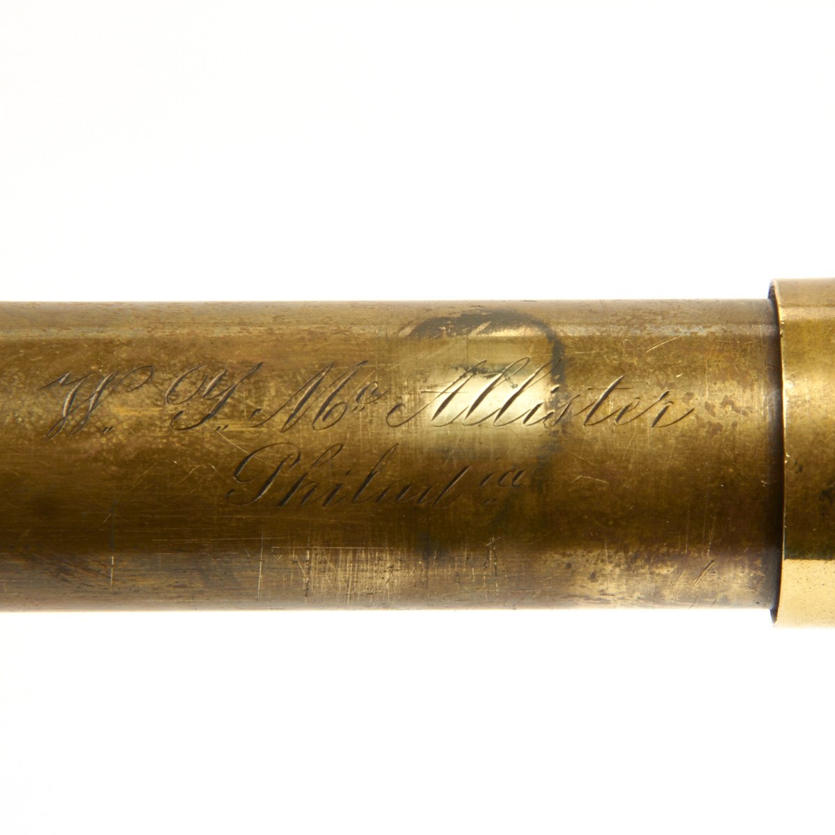 Original Item: One-of-a-kind. A fine Philadelphia made three draw brass telescope manufactured by W.S. MC.ALLISTER of PHILADELPHIA. Sheathed in wood, the telescope measures 10" when closed and 27 when fully drawn. Then rear brass band engraved but now extremely faint, reads: