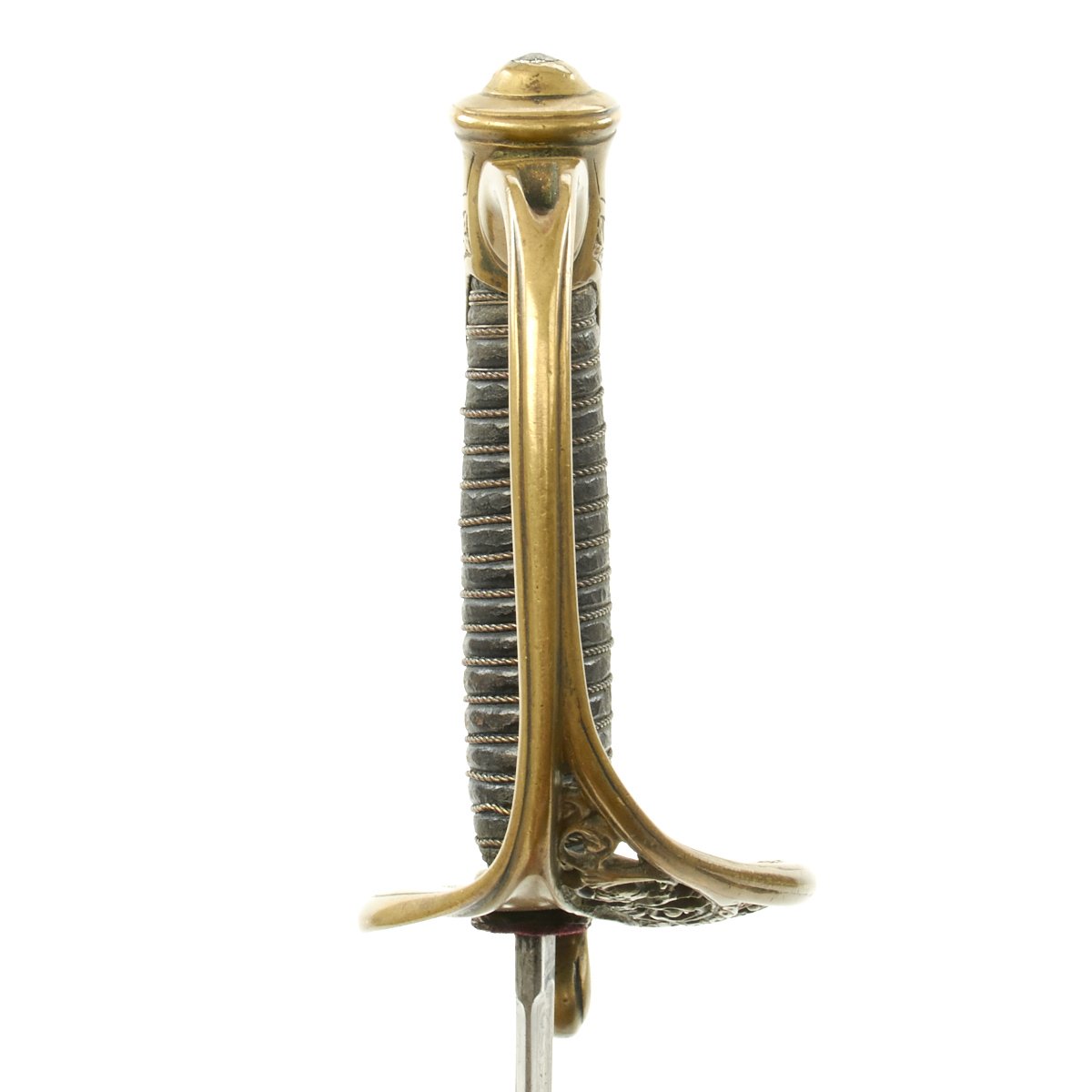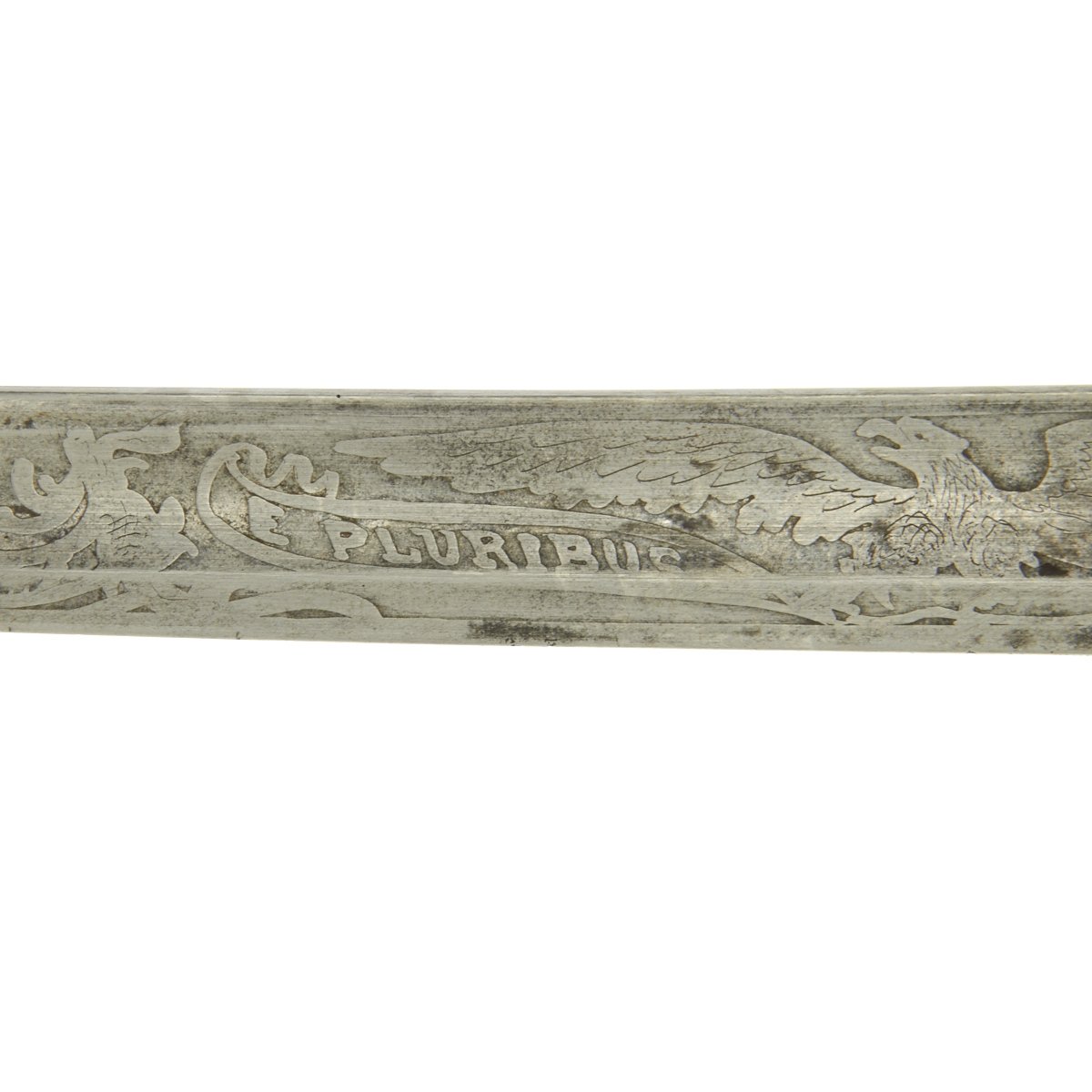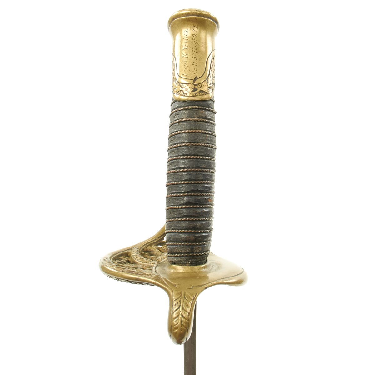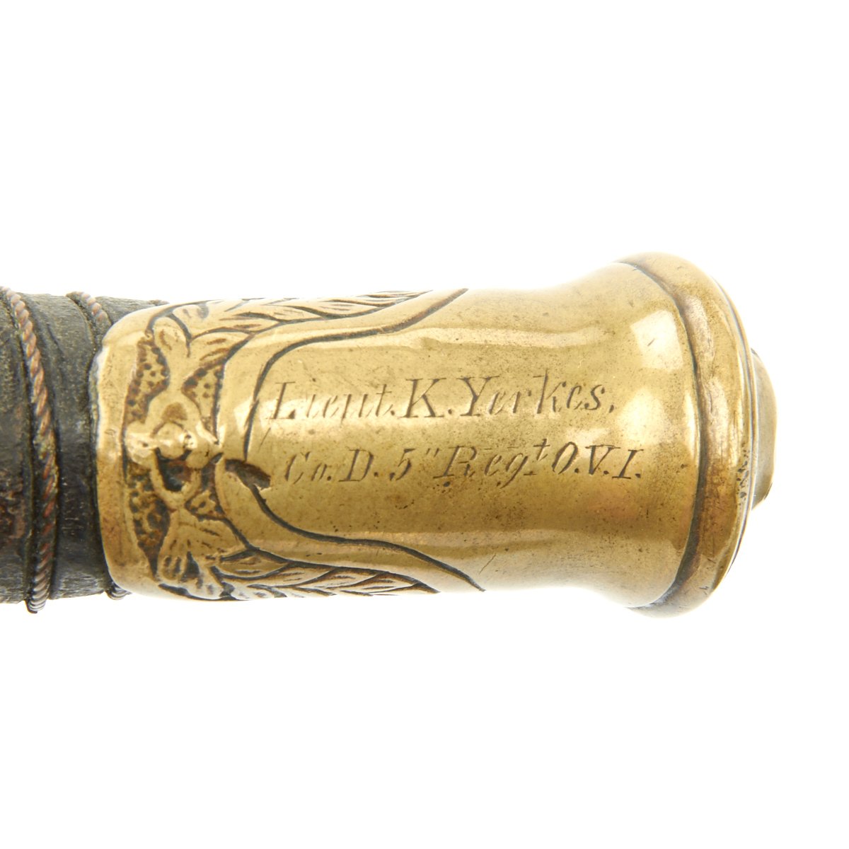 Yerkes's officer sword has a 29 3/8" blade with unusual etching, E. Pluribus Unum 1862 on left side, right side with large U.S. Brass hilt of standard form. Copper wire wrapped leather grip. Leather scabbard with three mounts. Pommel period inscribed: