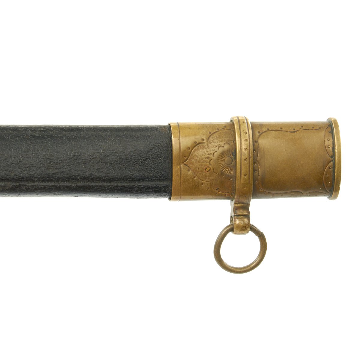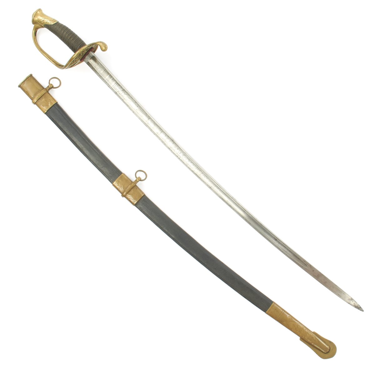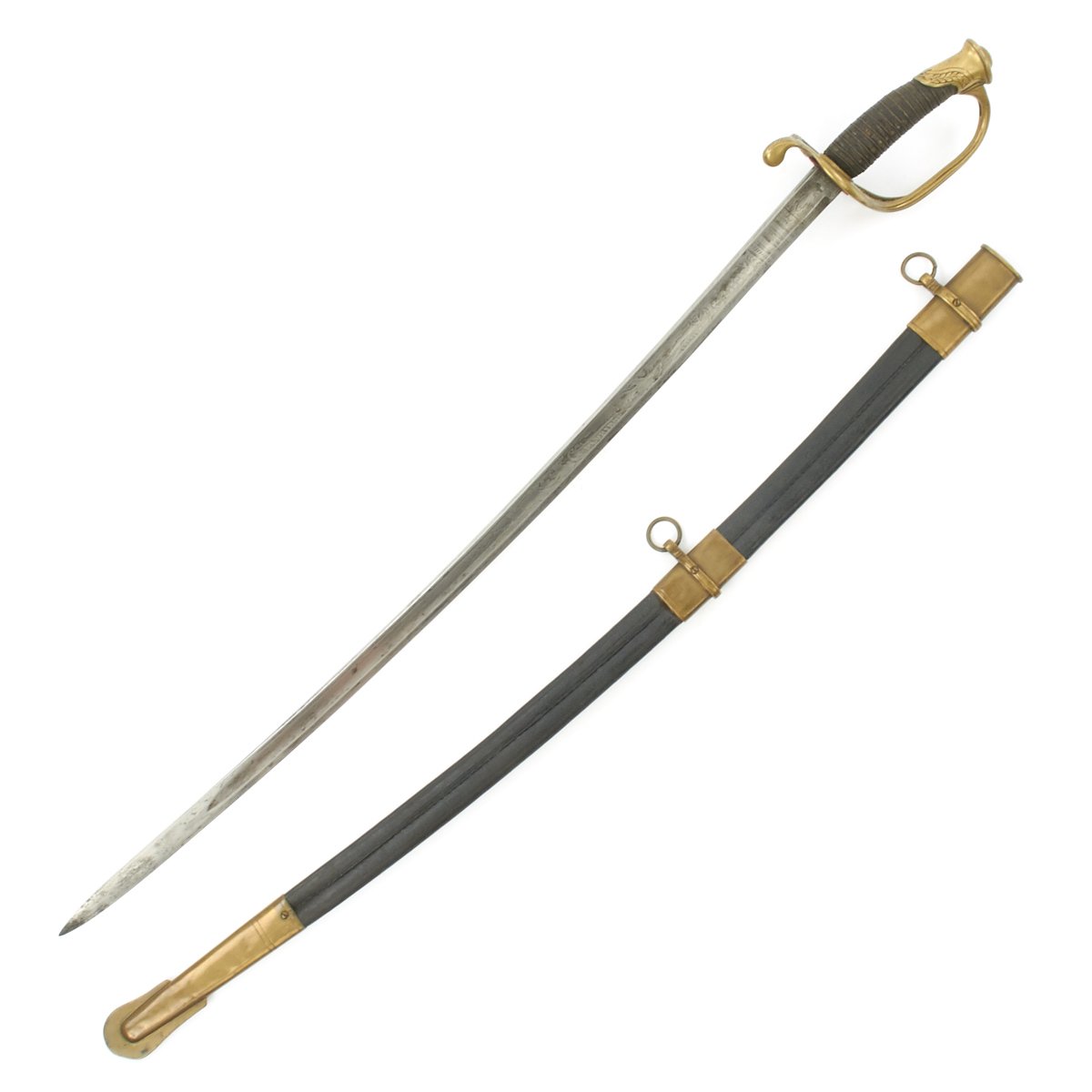 Blade is worn but all etching visible, including the extremely rare 1862 date. Brass pommel with deep age brass, inscription with some wear but clearly visible. Leather grip intact. Leather scabbard would rate very good with none of the usual floppiness normally associated with this style. Brass mounts with no finish but deep even age color. Drag has a few door pinches as to be expected.