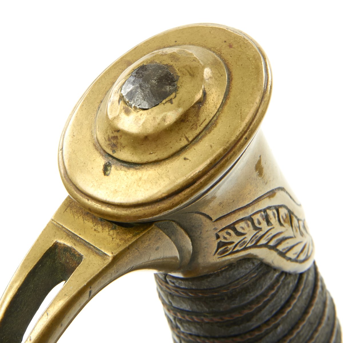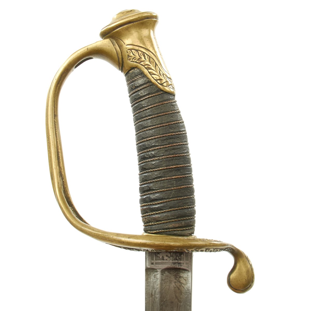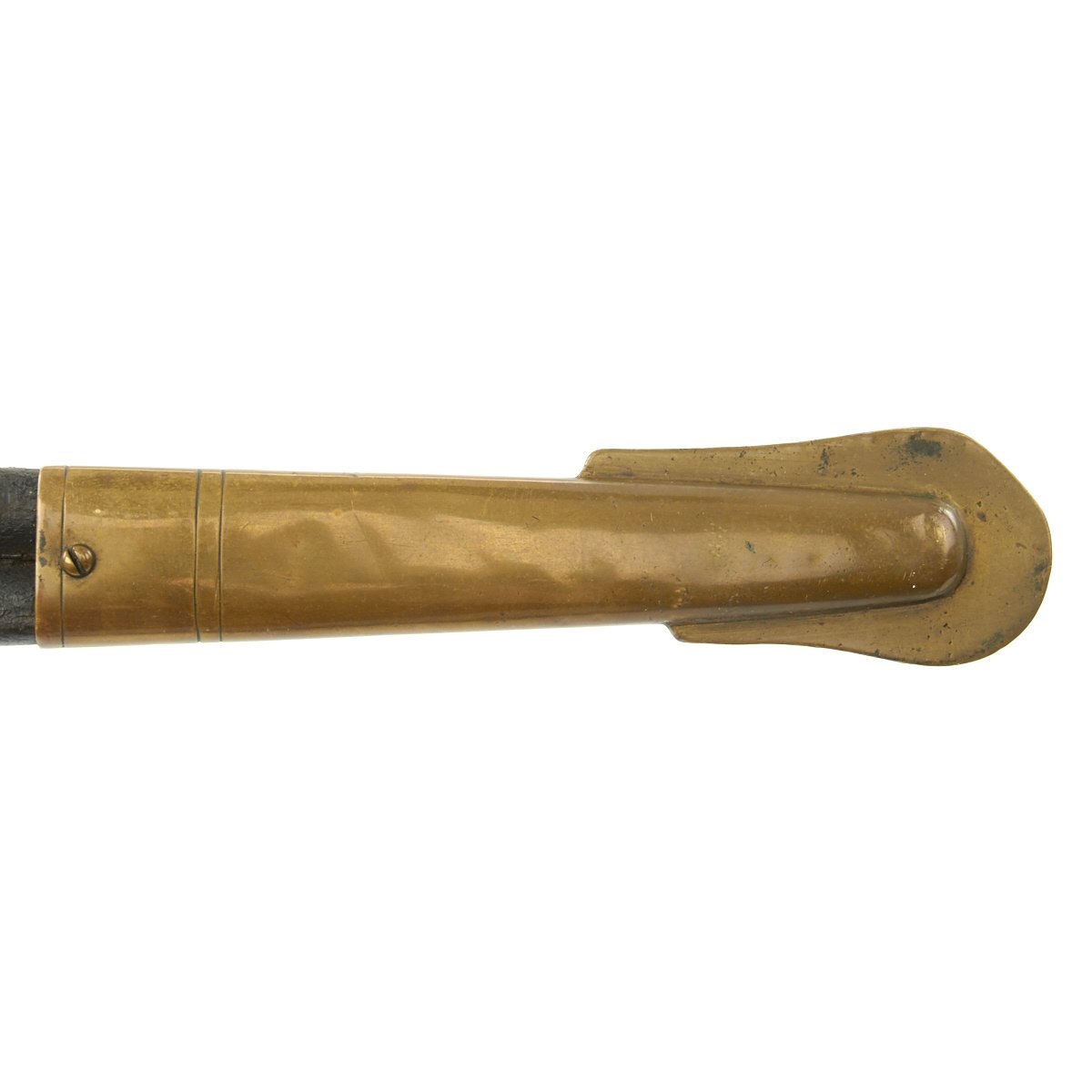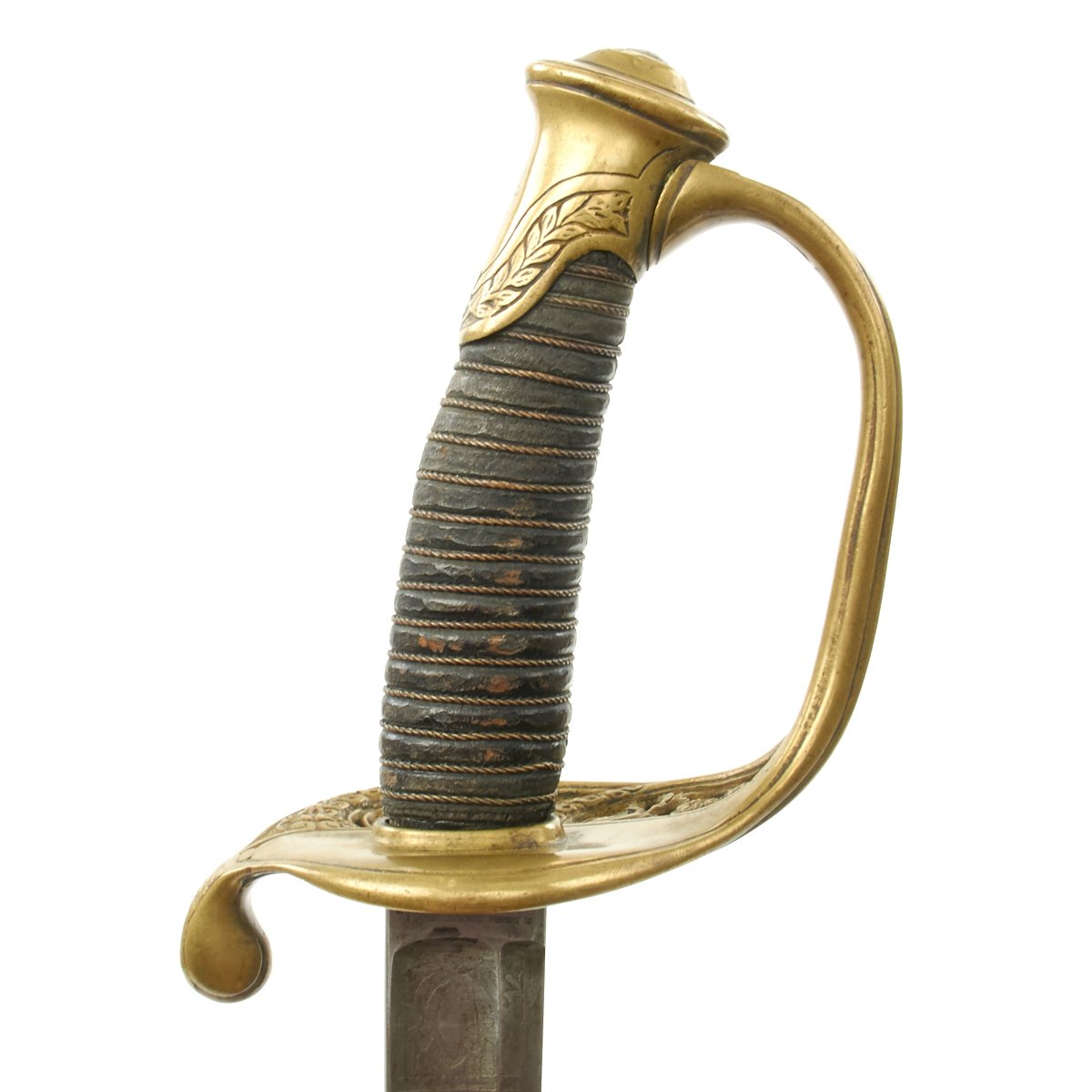 Blade is worn but all etching visible, including the extremely rare 1862 date. Brass pommel with deep age brass, inscription with some wear but clearly visible. Leather grip intact. Leather scabbard would rate very good with none of the usual floppiness normally associated with this style. Brass mounts with no finish but deep even age color. Drag has a few door pinches as to be expected.