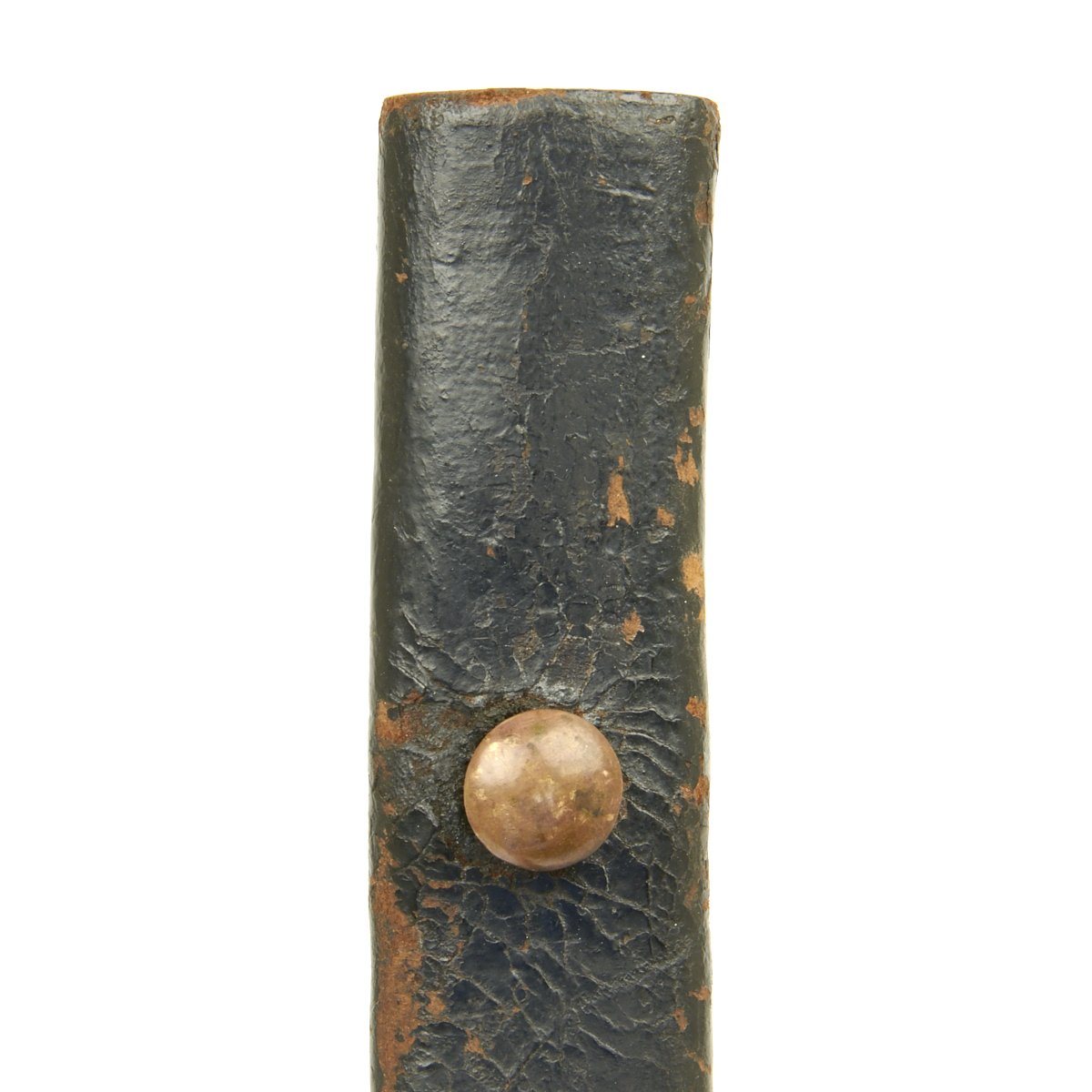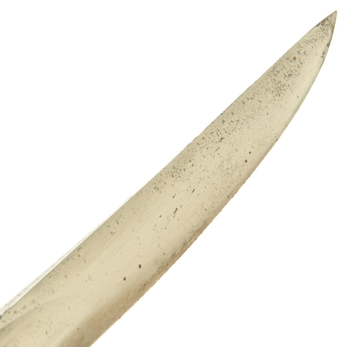 This classic cutlass comes complete with it's original early style heavy leather scabbard secured at rear by a series of brass/copper washered rivets covering it's full length. There never were bottom or throat mounts to these scabbards. Only a brass stud mounted in the leather about 3" down from the top of the scabbard which was intended for use with a large leather belt frog also of leather.