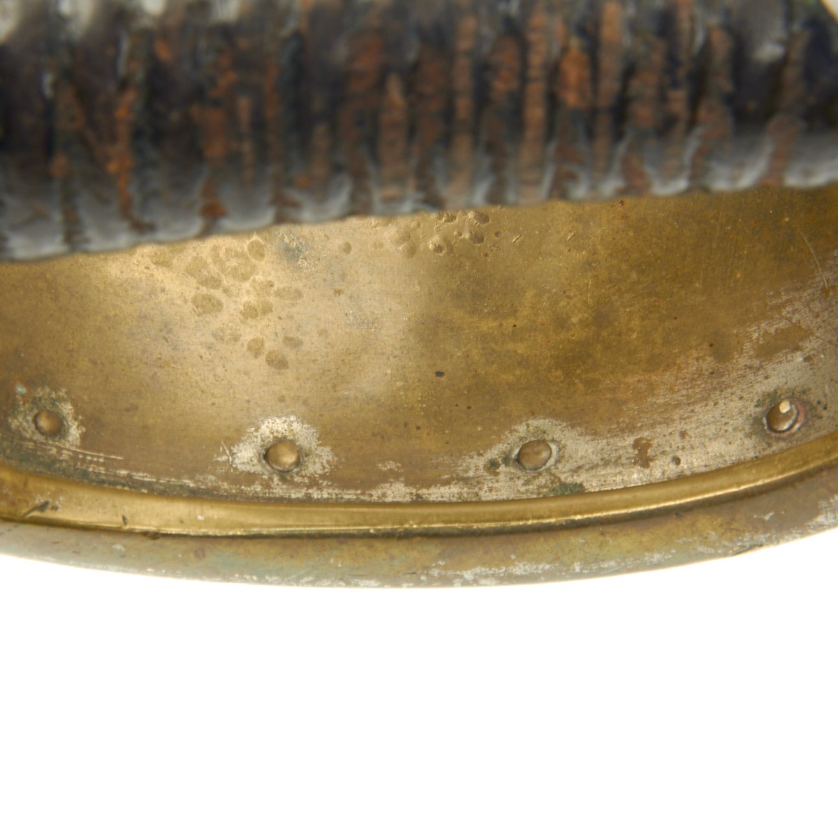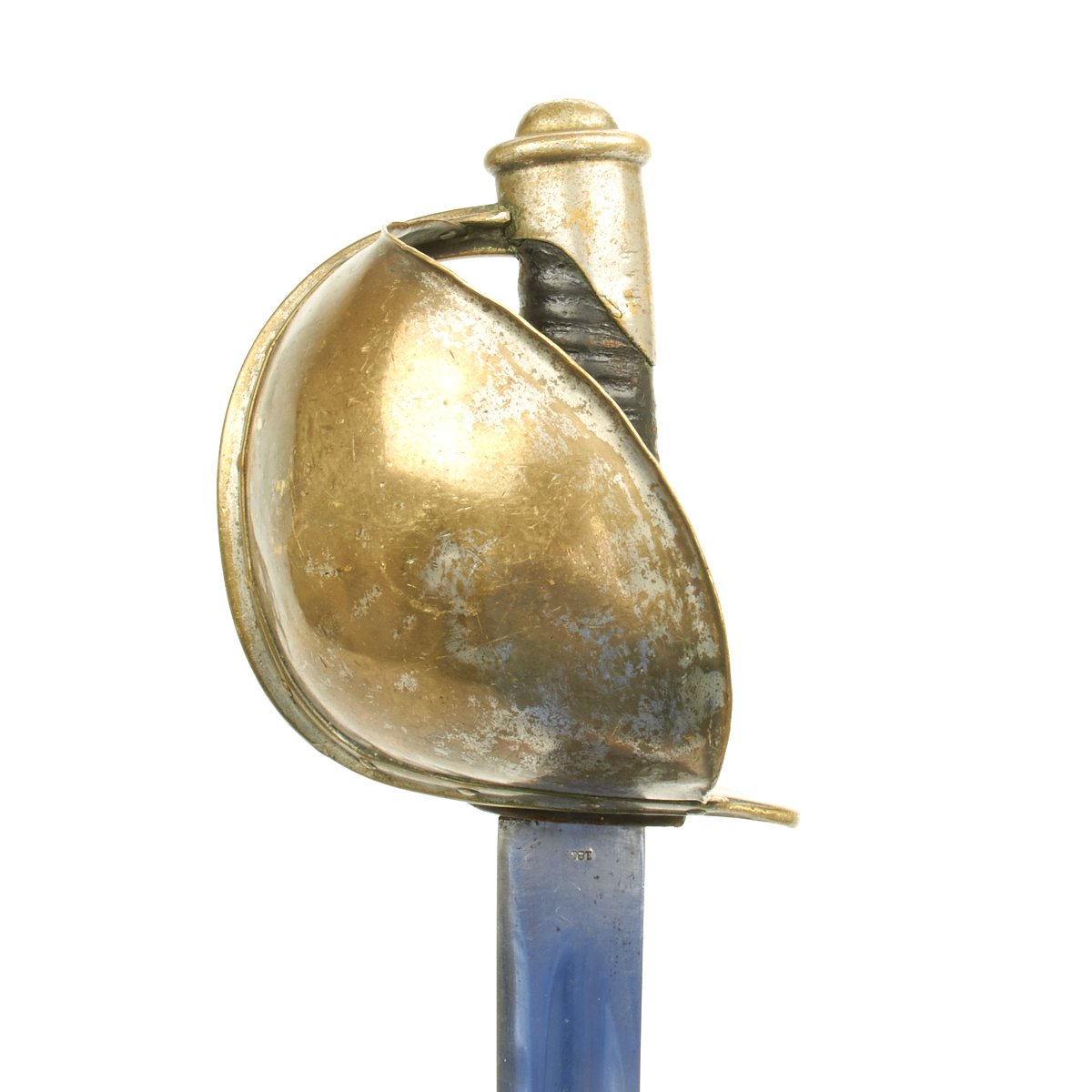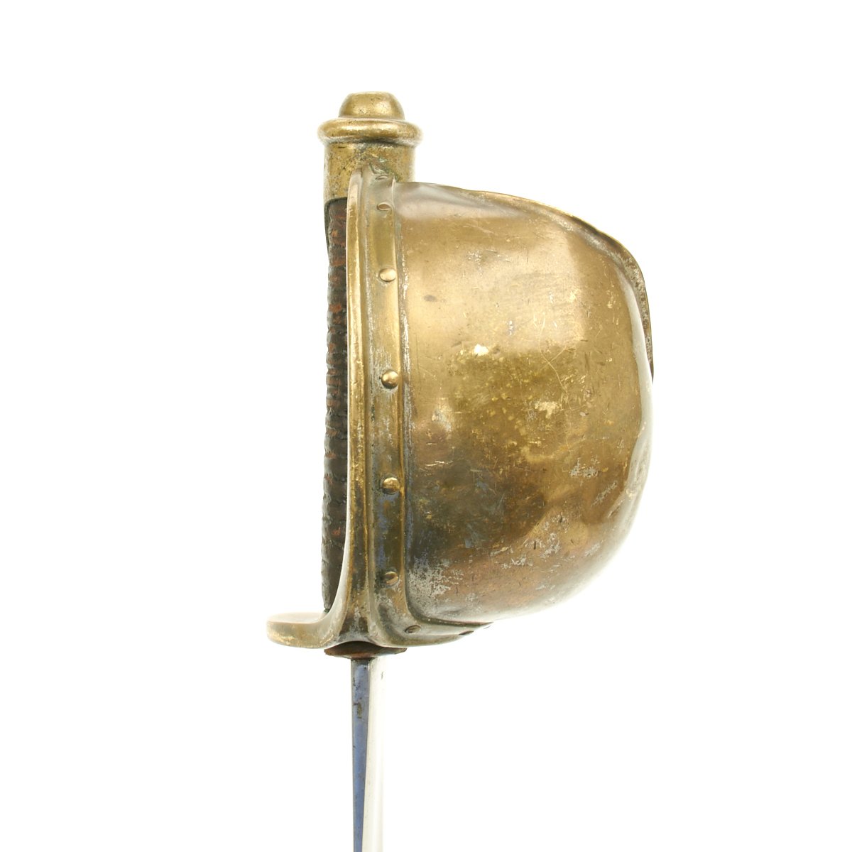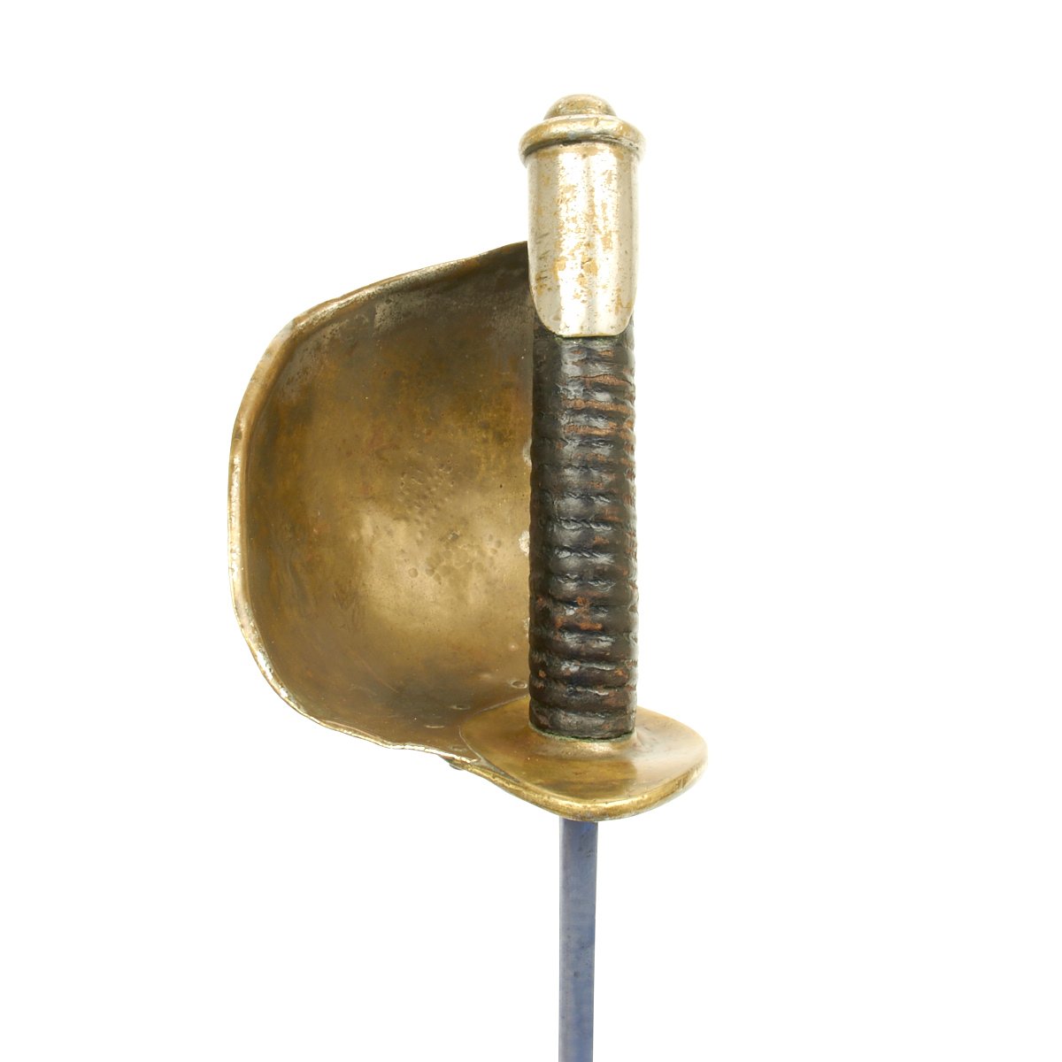 The 26 inch blade is in very good condition, with a bright finish with just a bit of oxidation staining in places. The edge is a bit rough do to some light denting. Brass bowl hand guard showing signs of it's very rare ORIGINAL tin plating, surrounding a very nice grooved wooden grip. These were NEVER bound in brass wire, and a lot of the original paint is present. Cutlass measures 32" in overall length.