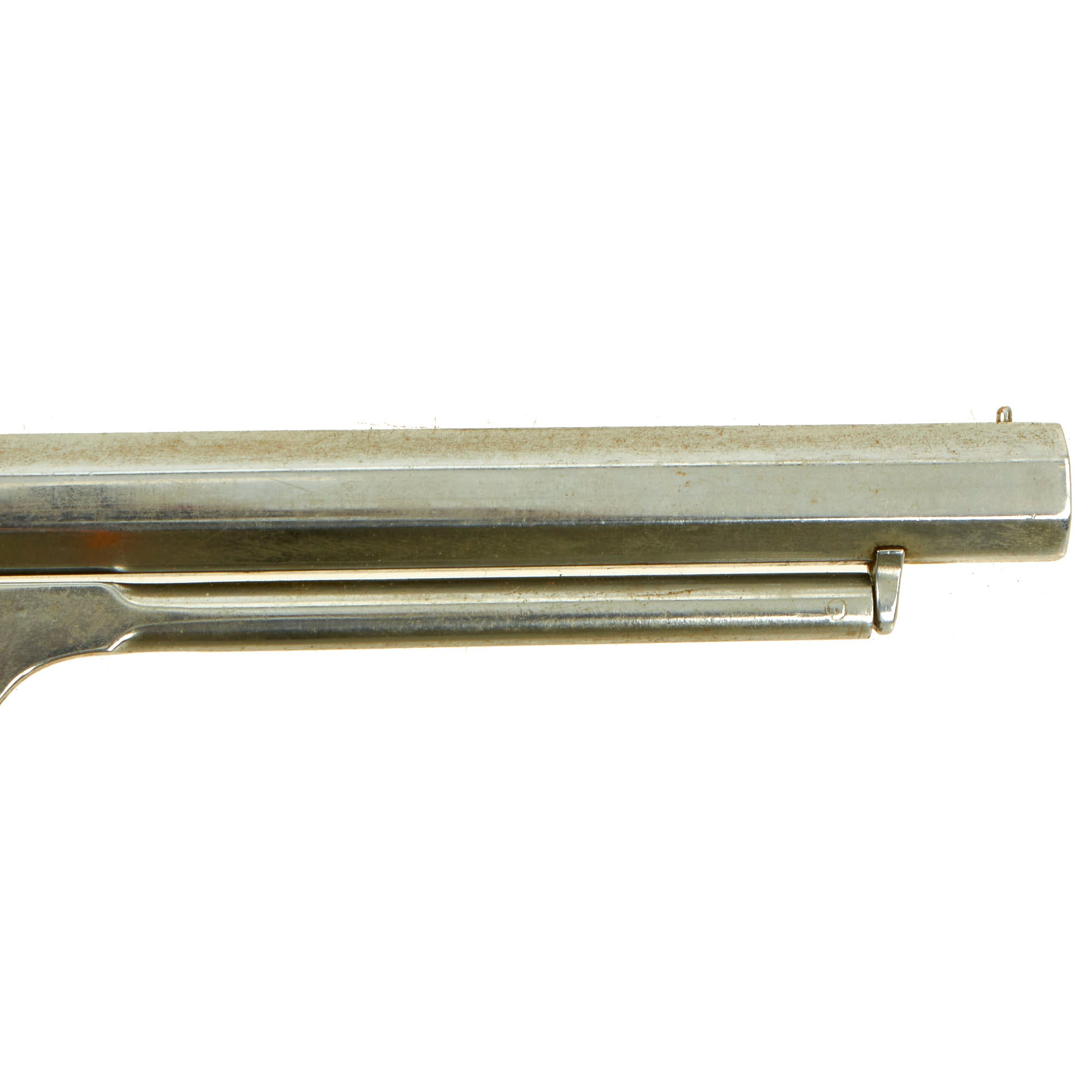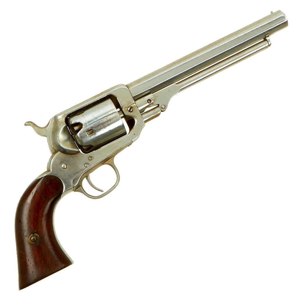 Original Item: Only One Available. Here is a very nice nickel plated .31 caliber percussion revolver with a fluted five shot cylinder made by the famous Eli Whitney company in New Haven, Connecticut. Designated the Whitney Pocket Model Revolver, this type revolver is a 31 caliber sidearm of which a total of 32,500 such handguns were produced at the Whitneyville Armory manufacturing center in the Whitneyville section of New Haven, Connecticut from 1859 through the early 1860s. These revolvers were great favorites with Union Officers, who purchased these as a personal second revolver to take into battle. They were easily concealed and most effective, giving the officer an additional 5 shots when needed.