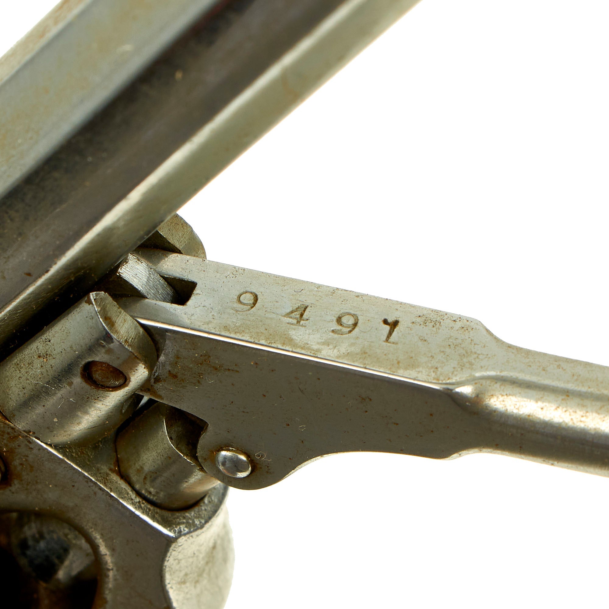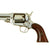 In good refinished condition, this Second Model, 2nd Type Whitney sidearm has the correct three-screw model frame with a 5-shot unrebated cylinder. It is 11 inches in overall length, mated to a 6” long octagonal barrel and ball type latch on the loading lever. The revolver has matching serial number 9491marked on the loading rammer, and on the inside of both grip scales. As far as we can tell, this revolver is matching, and has not had any parts swapped out during its service life, however the Nickel plating removed the serial number under the barrel, and has made the other markings a bit faint. It looks like it definitely had seen a good amount of service prior to being refinished.