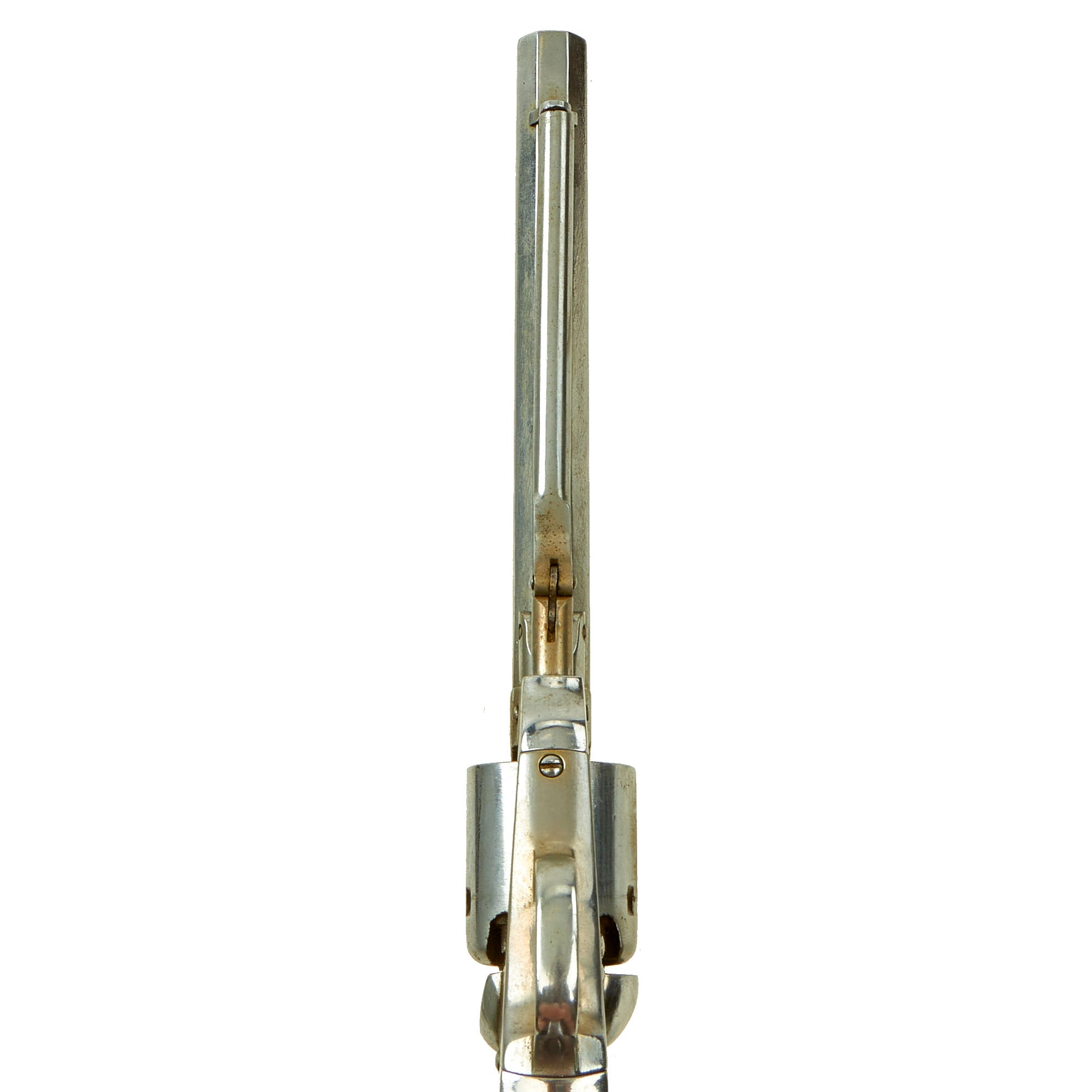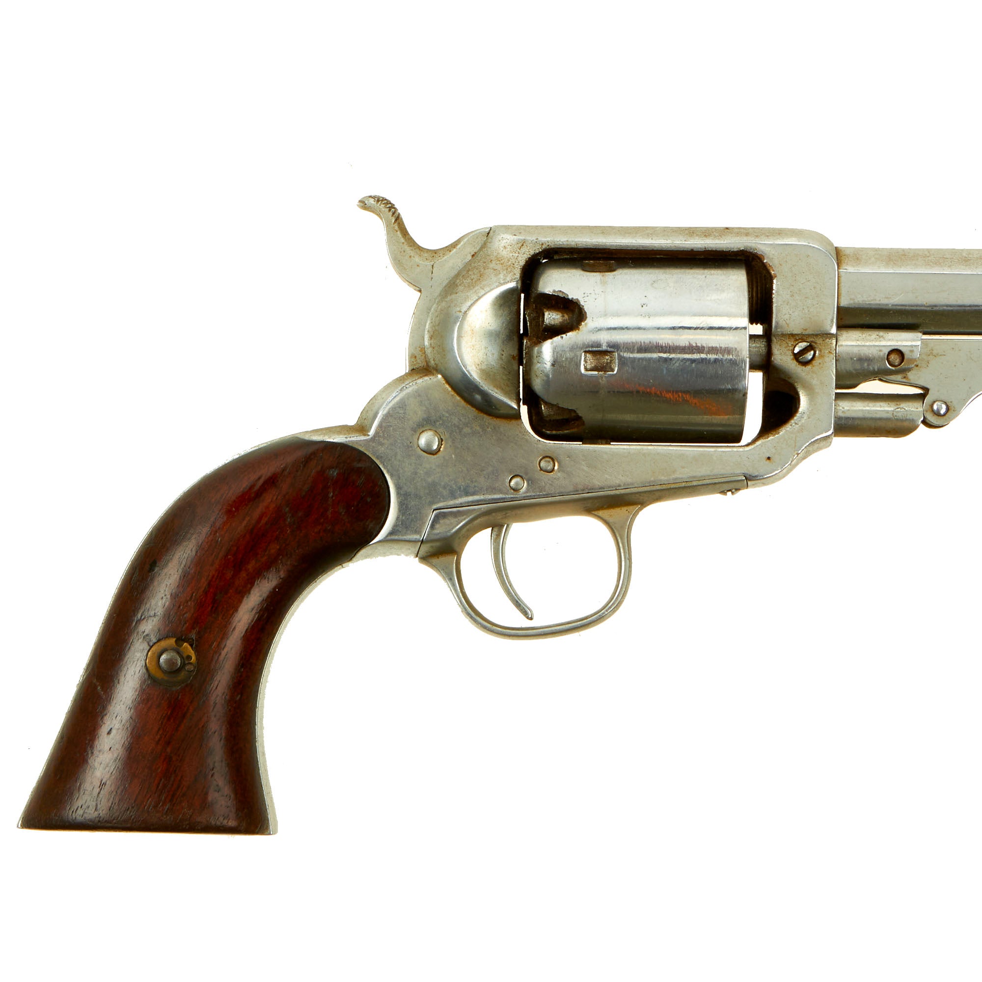 Overall the revolver looks great, with the Nickel-plating well retained, with just a bit of oxidation and wear. The cylinder has no traces of the original markings due to the wear and refinishing. The original grips still retain almost all of their original "Piano Varnish" finish, with wear at the bottom. There is also some chipping on the bottom of the left side grip scale.