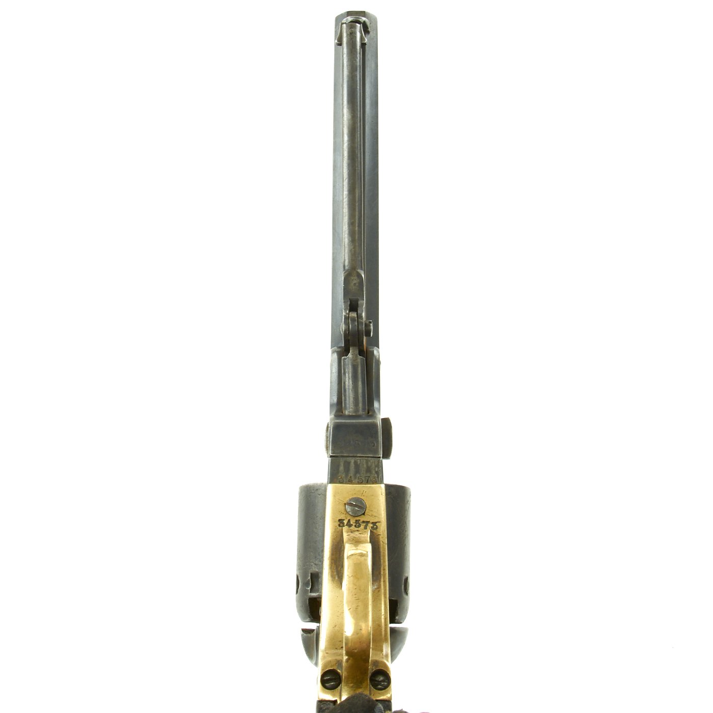 This very nice example features the standard 6½" barrel and fully matching serial number 34573, which is found on the barrel, frame, trigger guard, cylinder axis rod, and the bottom of the grip. The loading lever, barrel wedge, and cylinder are all marked 4573, so this really is a "fully matching" revolver. There is also a good portion of the original cylinder engraving present.