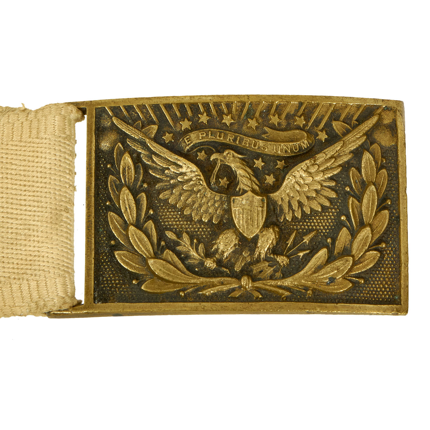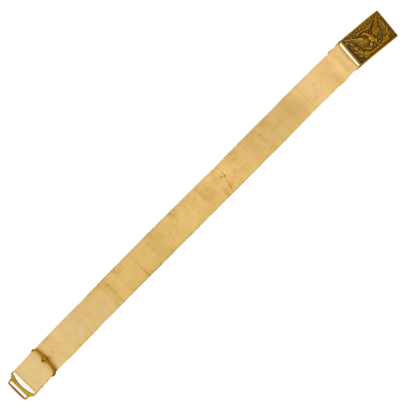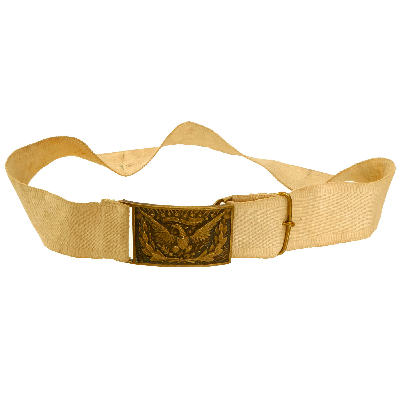 Original Item: Only One Available. This belt is a fine example of the early, original white cloth Model 1851 belt worn by Federal Officers prior to and during the Civil War. It remains in overall good condition, with its original, bench numbered, regulation 1851 pattern, brass eagle belt plate, with its matching keeper. Constructed of strong white canvas, the belt measures 31″ long, 1 ⅞” wide and exhibits staining and age toning.