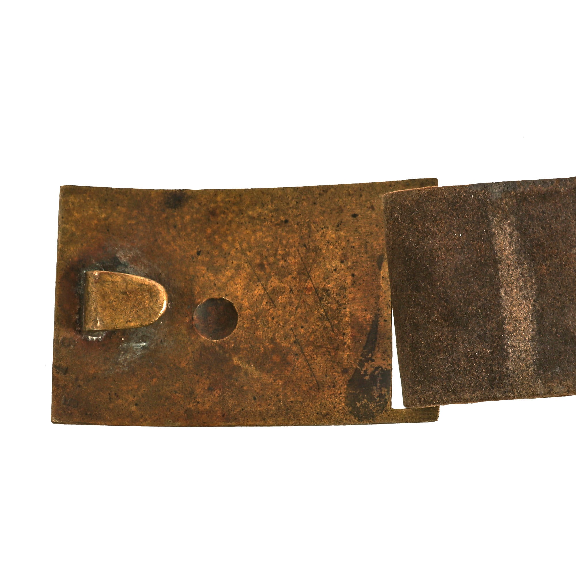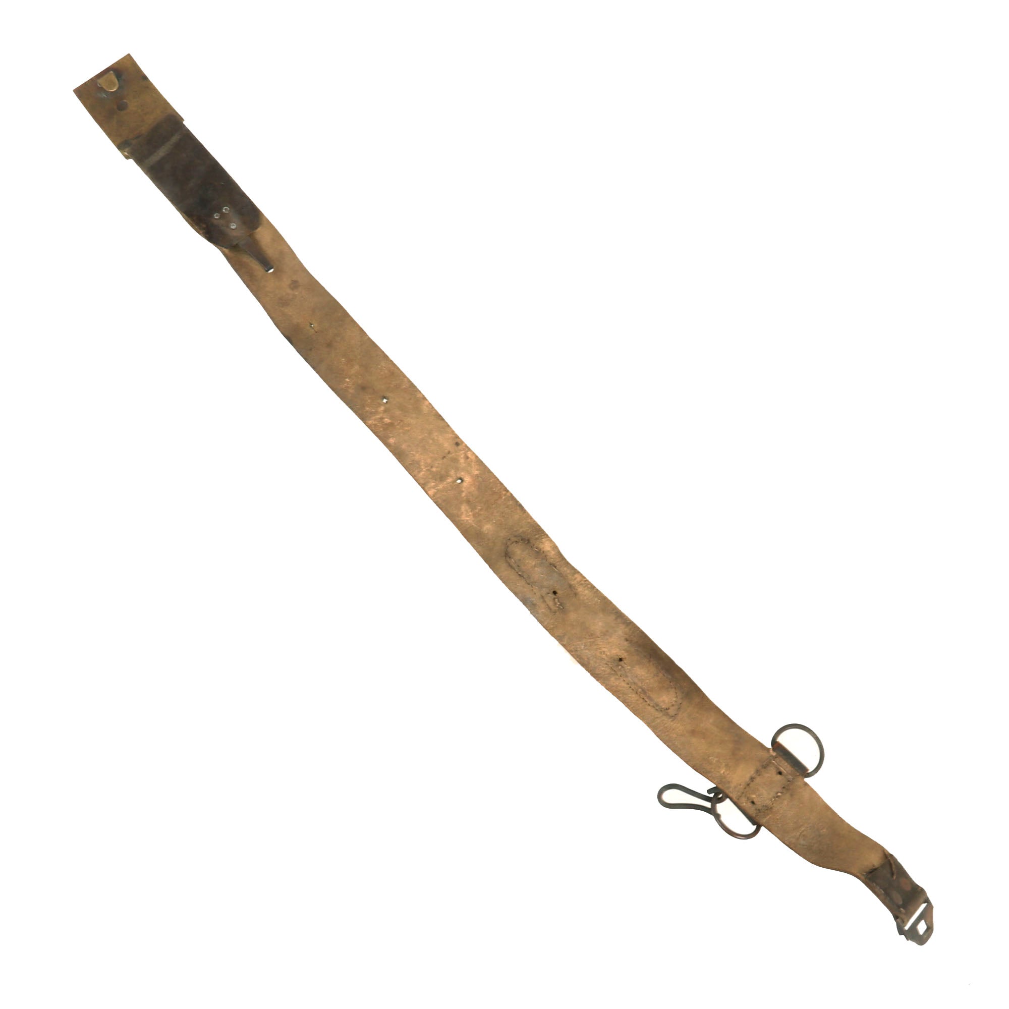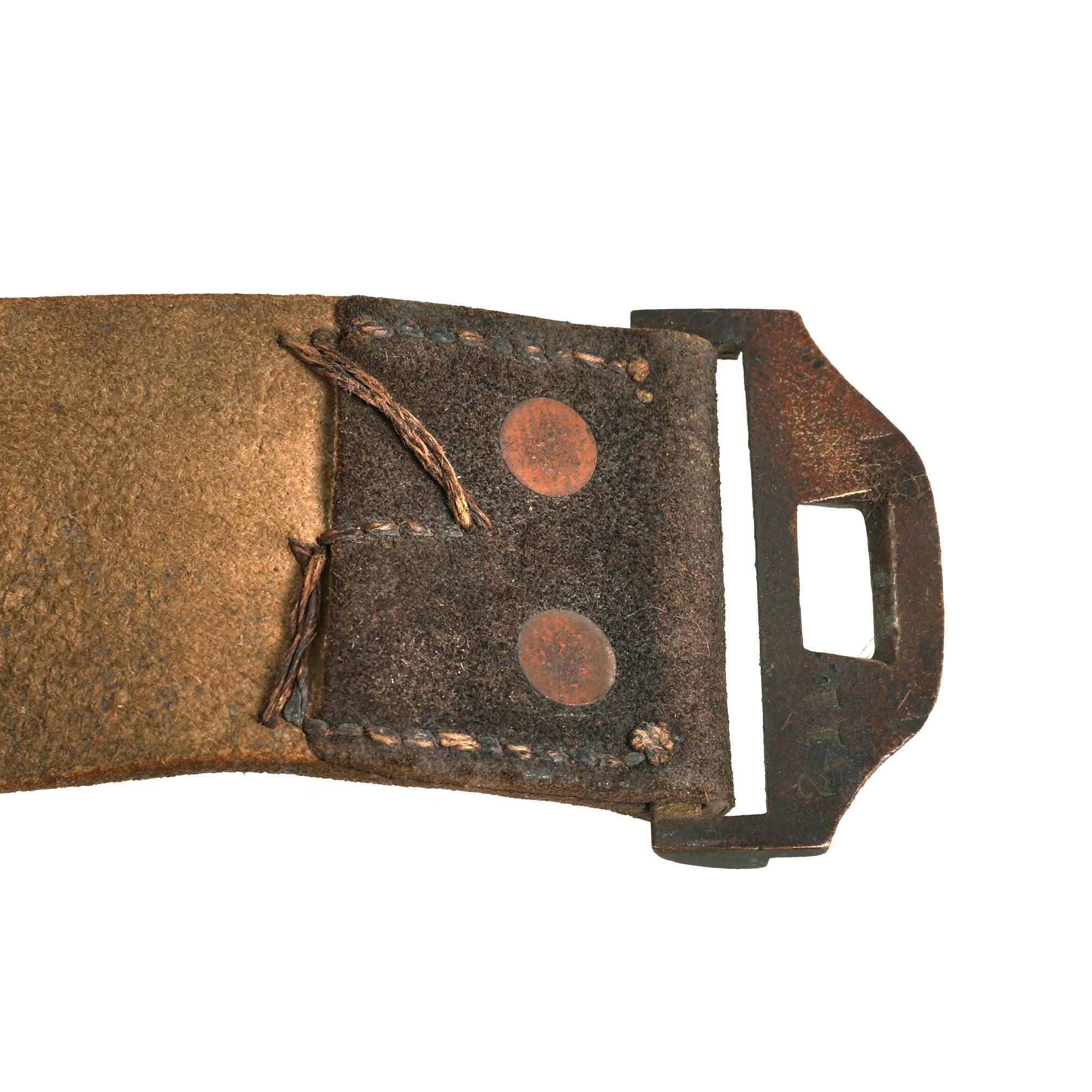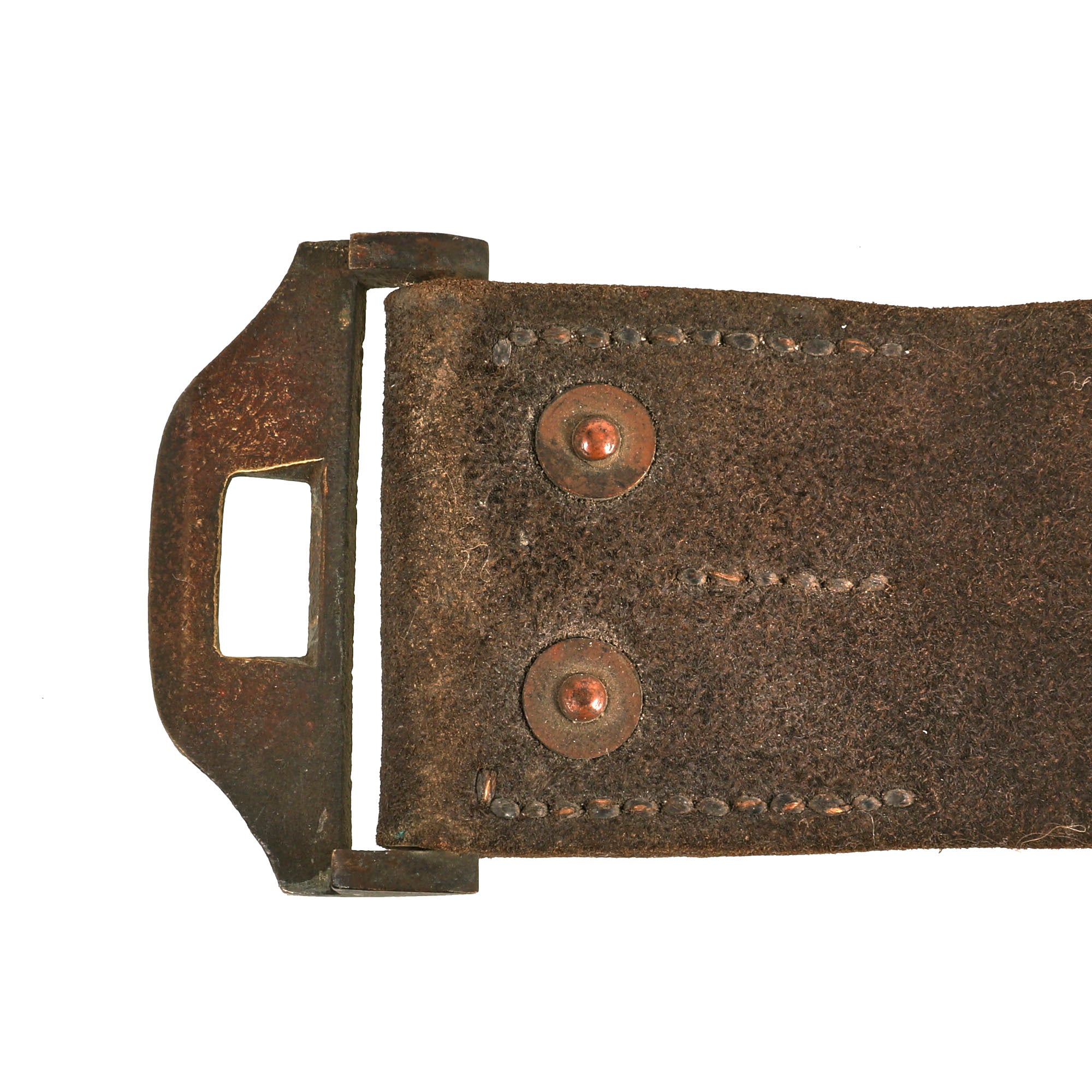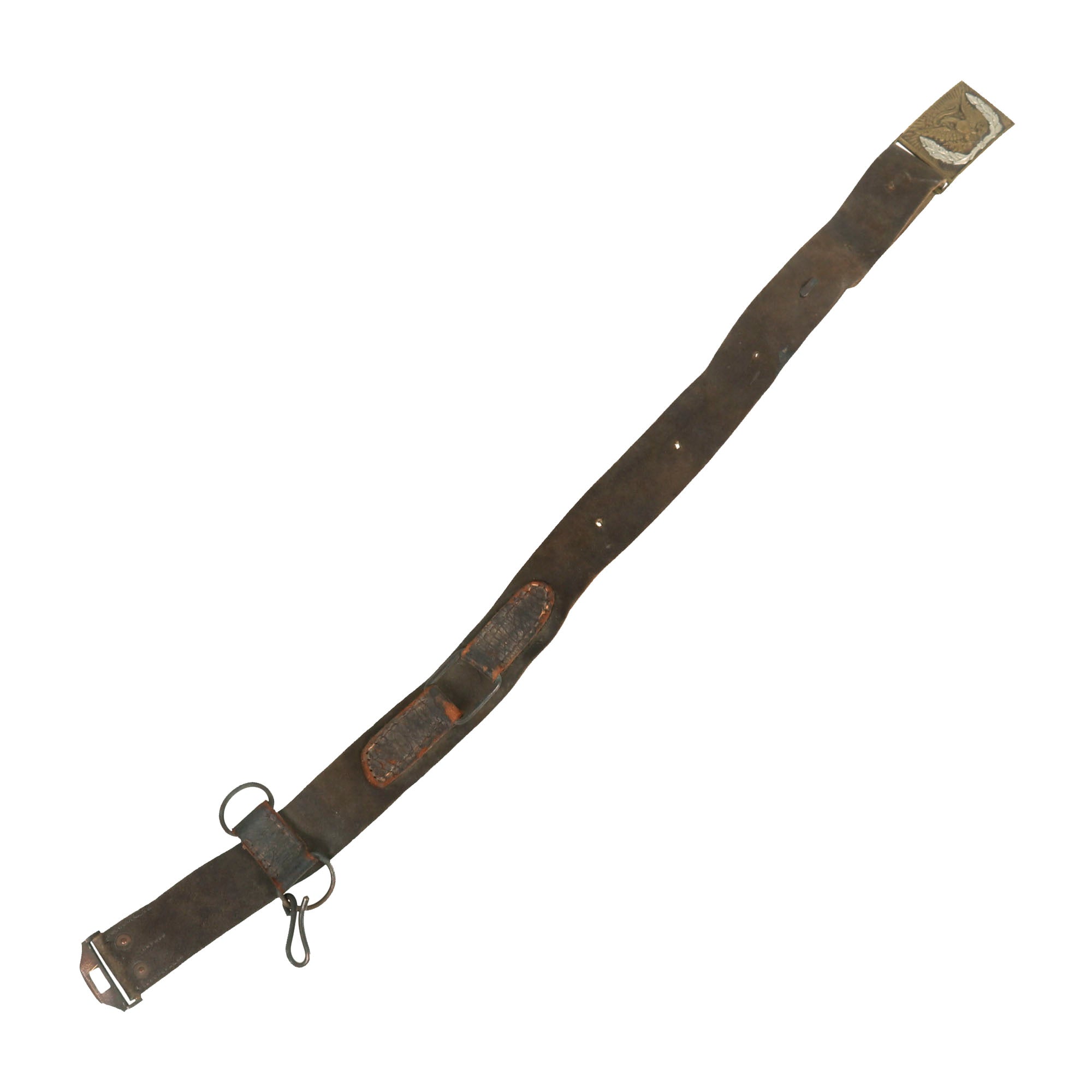 The end of the belt is run through the rectangular M1851 brass sword belt plate loop and stitched together A separate leather adjuster loop secures the connection. The brass keeper is sewn to the opposite end of the belt. This example retains its hanger.