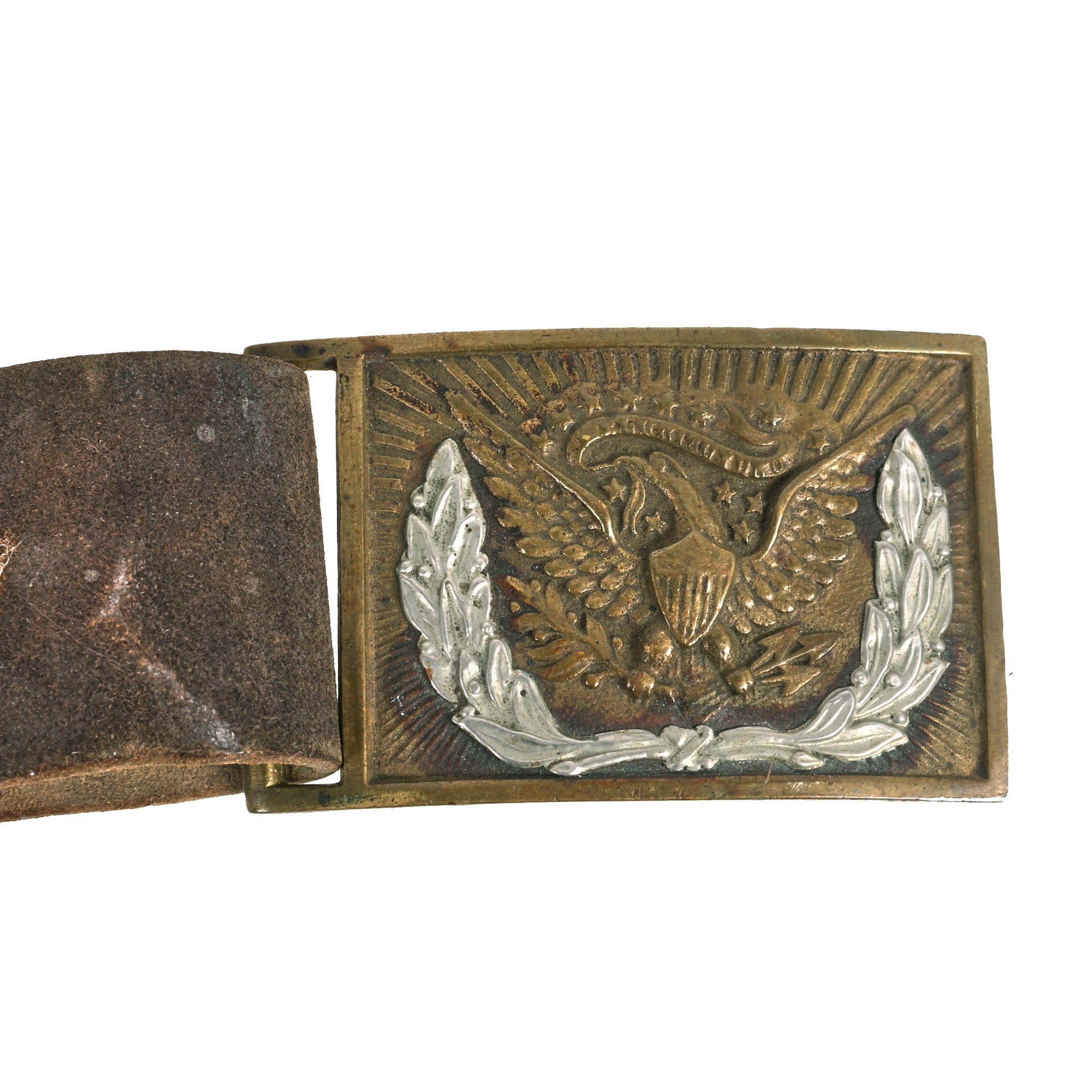 The regulation 1851 pattern, brass, eagle waist belt plate is the rectangular, concave, detailed plate that measures approximately 83 mm long x 53 mm high,the cast brass plate has an integral tongue on the reverse and the one-piece, nickel-silver wreath terminating beneath the eagle’s wings. The wreath remains strongly secured to the front face. The plate face has an even patina and exhibits well-defined edges. All the brass hardware retains a nice, aged patina.