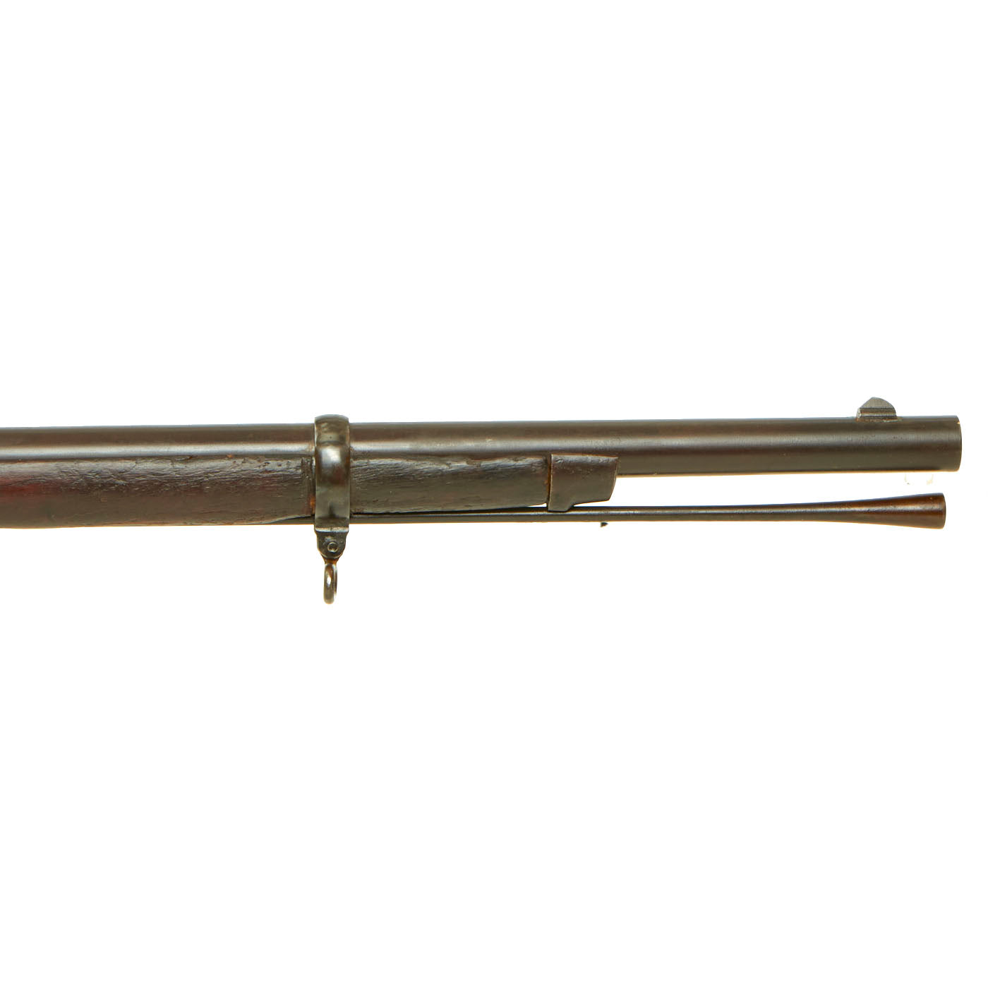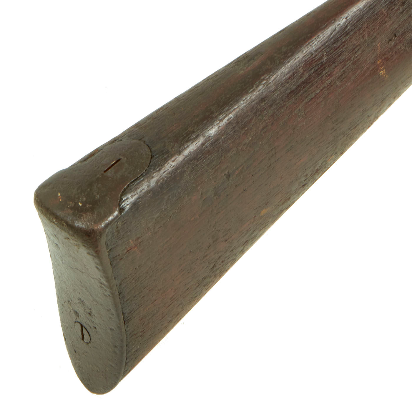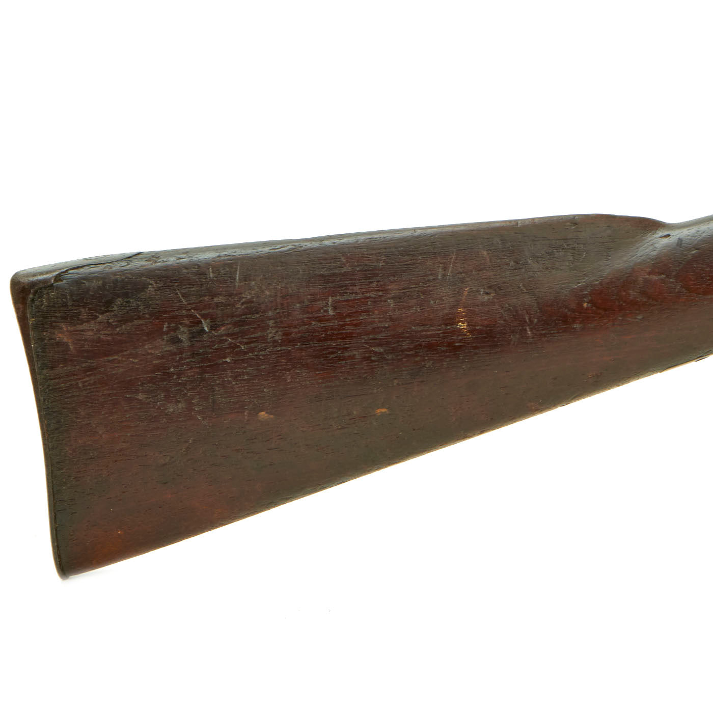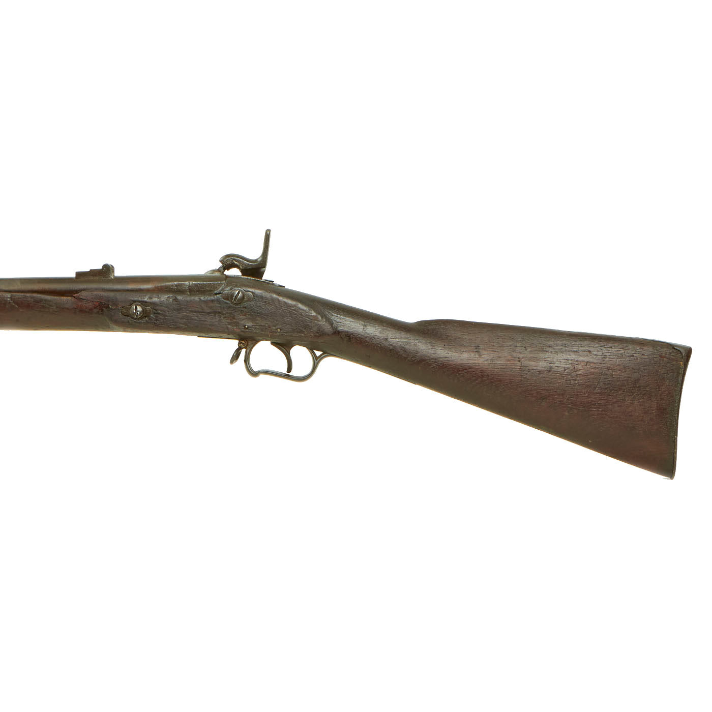 As a result, P.S. Justice contract rifles of any type are rare, and we have only had a few over the years. This is what we believe to be an early "Type I" P.S. Justice contract short rifled musket, and it is the first of its type that we have had. It has all iron furniture, and features the distinctively shaped justice trigger guard, which was fitted to all of the contract muskets, both in iron and brass versions. The lock, as mentioned previously, is an obsolete Springfield M1842 Percussion lock dated 1852, most likely salvaged from a damaged musket. Instead of a side plate, there are two small iron escutcheons on the left side of the stock.