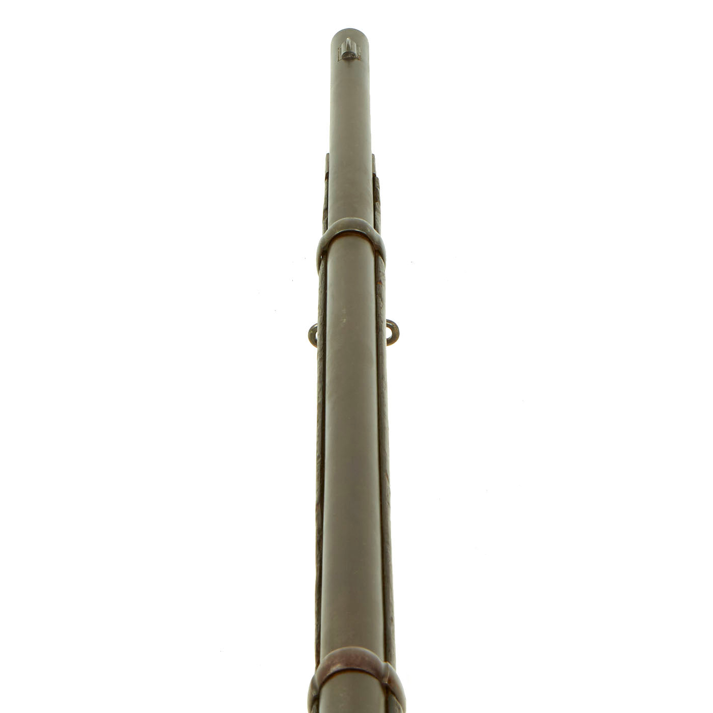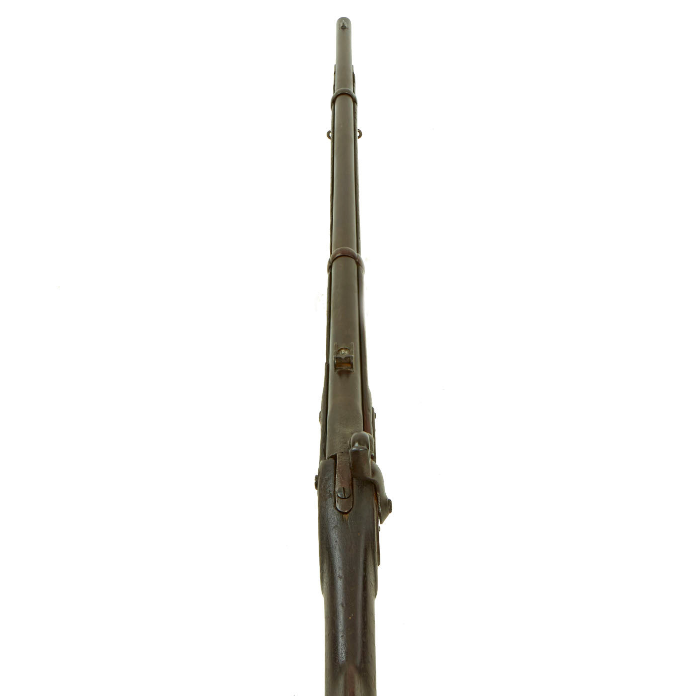We checked the bore of the rifle, and it is actually in very good condition, with a mostly bright finish showing clear lands and grooves and just a bit of oxidation. It would appear that it did not see much use, or possibly the forward portion of the barrel was replaced when the musket was assembled, which explains why the breech area exterior has powder burn and oxidation but the bore does not show much use. The top of the barrel has the standard justice two leaf sight, though the second longer leaf is broken off just above the lower sight notch.
