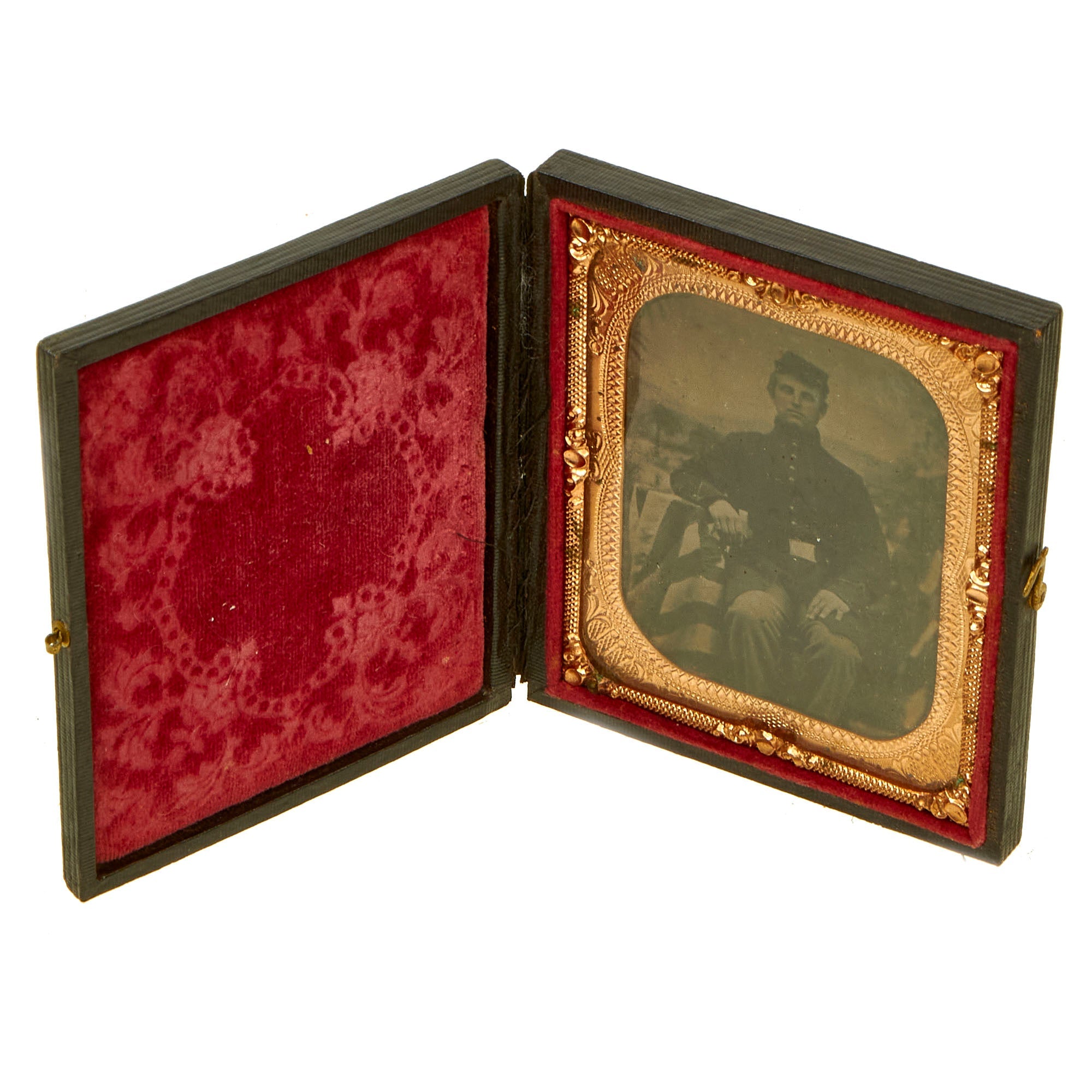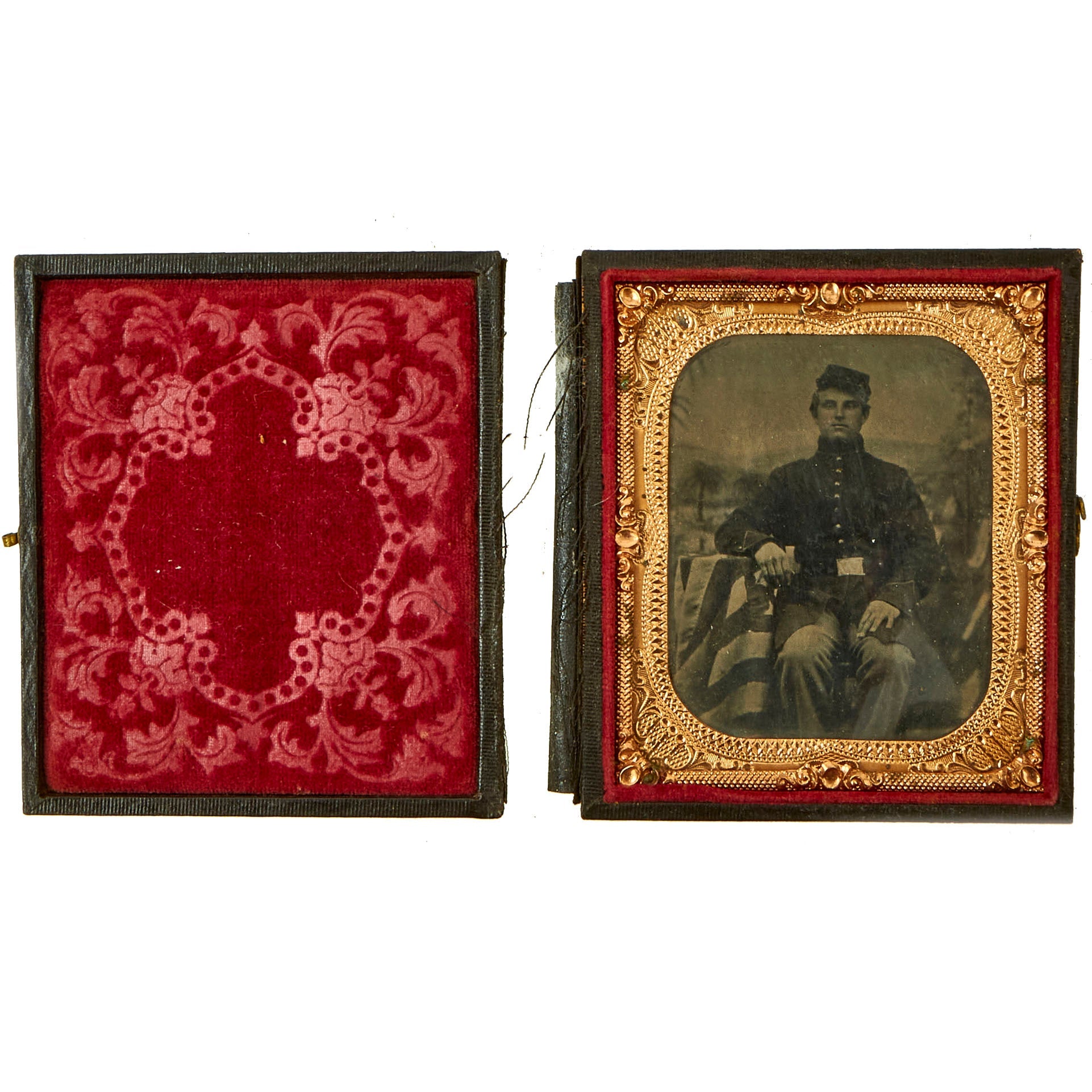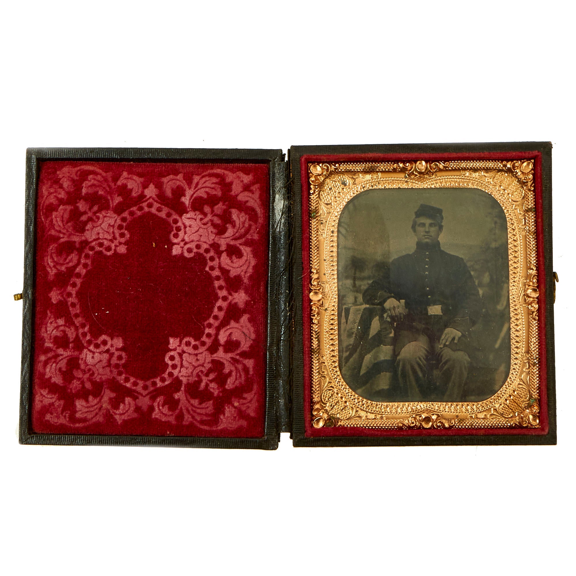 Original Item: Only One Available. Everything about this image, including its presentation, makes it a splendid memento of the Civil War. This Civil War cased "Sixth Plate" (2.75 x 3.25 inch) tintype portrait shows an unidentified soldier. He wears a bummer hat or kepi and a standard nine-button frock coat of northern Federal or Union issue posed next to an American flag. He is not armed and is sitting relaxed with his hands together resting on his stomach.