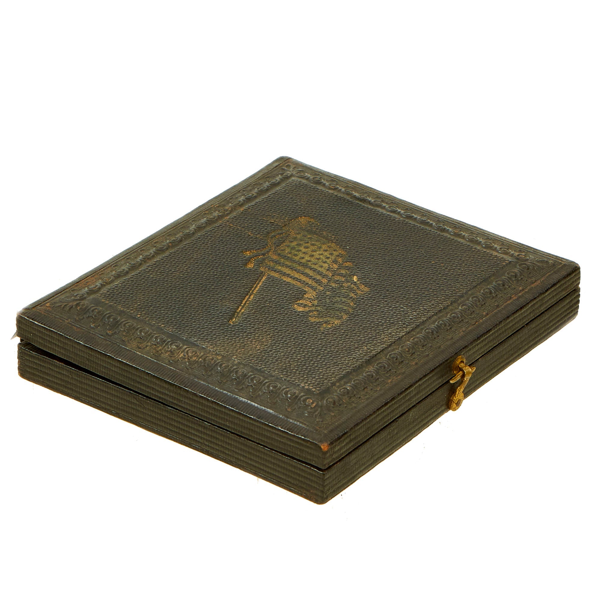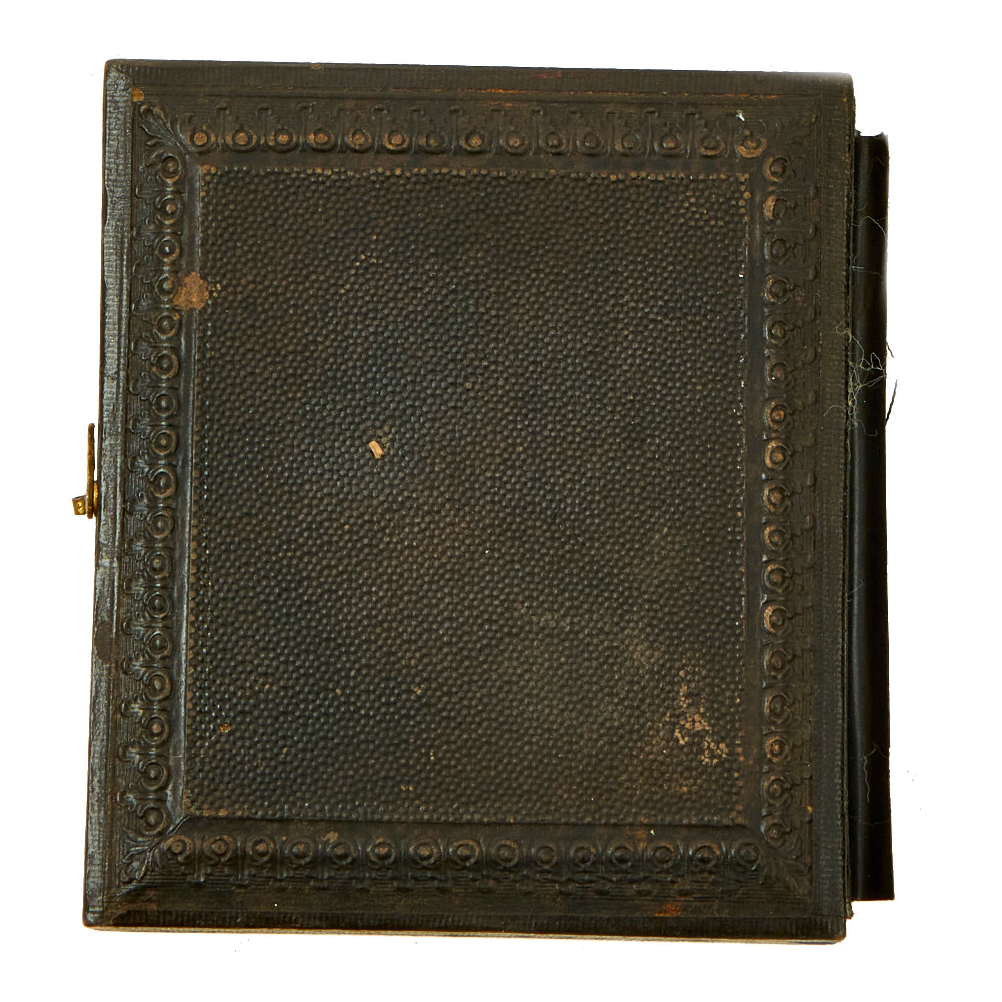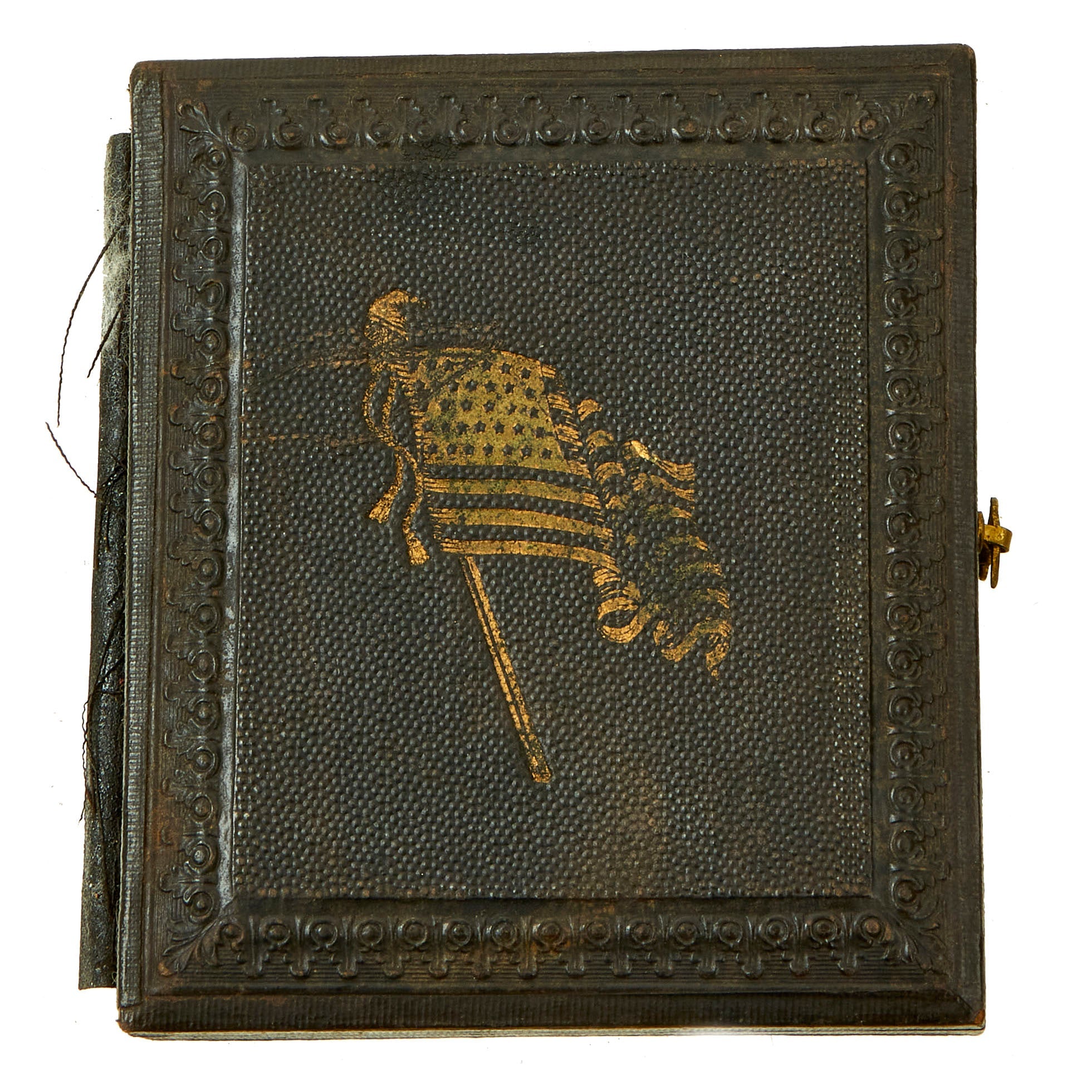 Original Item: Only One Available. Everything about this image, including its presentation, makes it a splendid memento of the Civil War. This Civil War cased "Sixth Plate" (2.75 x 3.25 inch) tintype portrait shows an unidentified soldier. He wears a bummer hat or kepi and a standard nine-button frock coat of northern Federal or Union issue posed next to an American flag. He is not armed and is sitting relaxed with his hands together resting on his stomach.