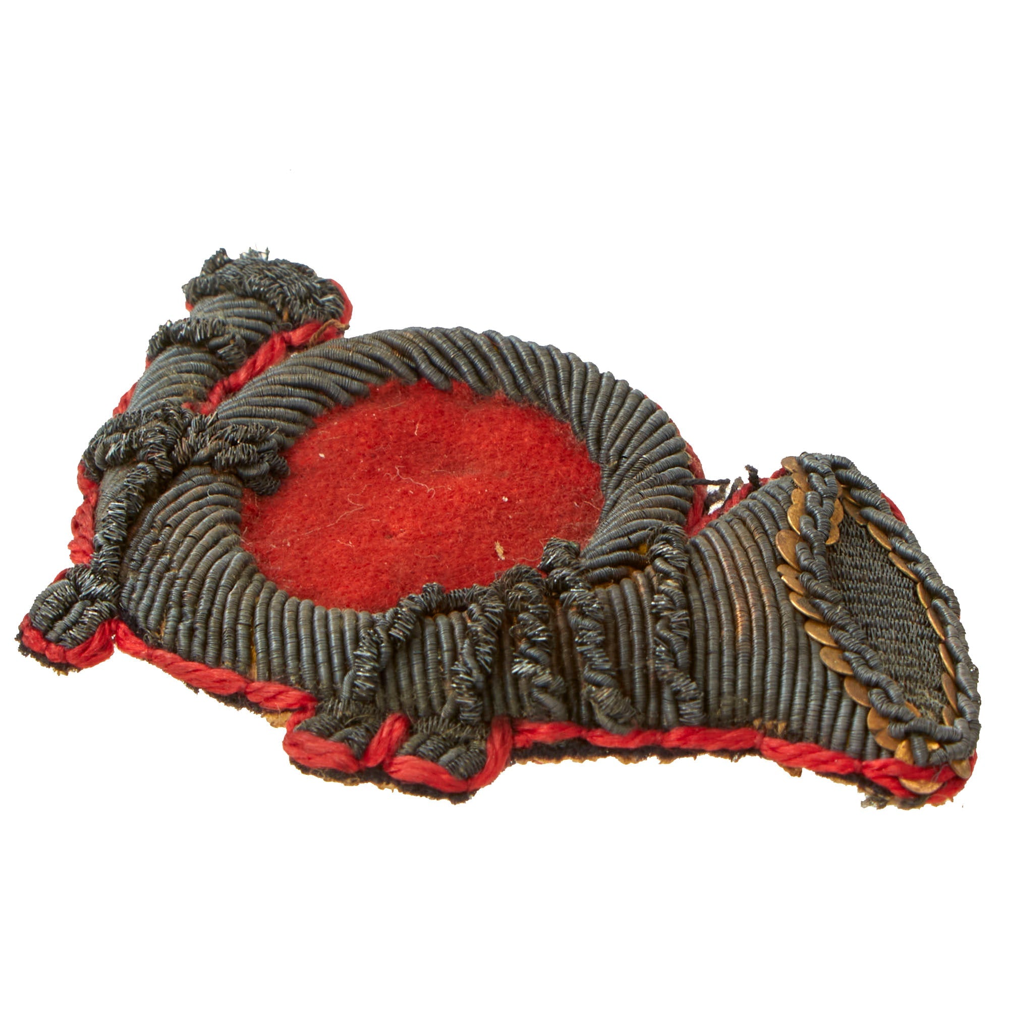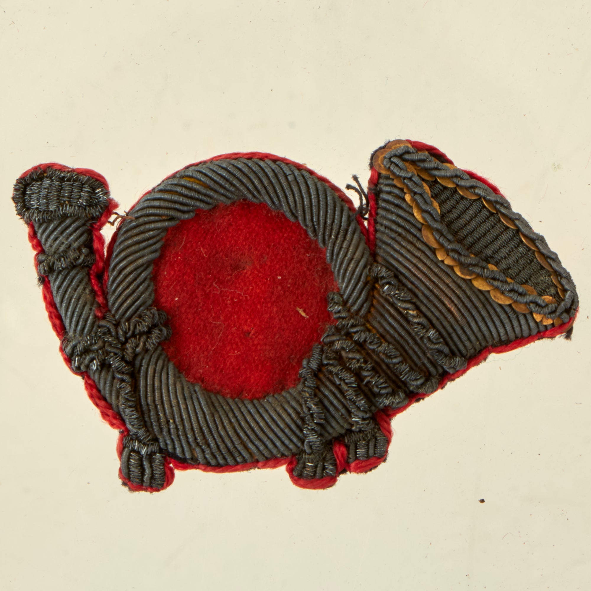 This is an extremely scarce example of a Civil War Marine Corps Officers cap insignia. This insignia is near perfect besides missing the M, which is the most easily replaceable part of the badge. The badge measures 2 ½" x 1 ⅞”. The badge has a great red felt border with the hunting horns being made from bullion with small gold roundels at the mouth. This is one of the most well-preserved officer’s badge we have seen.