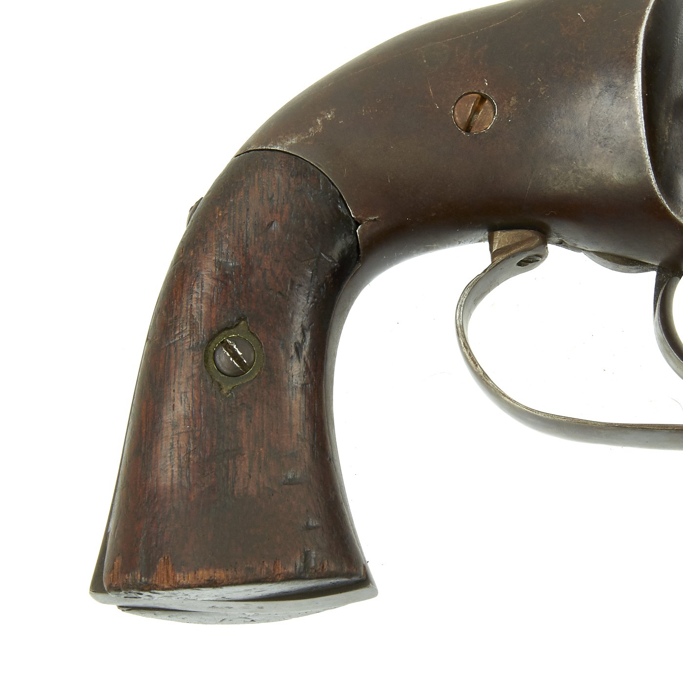 Here we have a typical .44 cal Army model, marked with serial number serial number 3247 on the cylinder and the bottom of the grip frame. The revolver features the standard internal hammer and a cylinder in .44 caliber with 6 shots. The barrel is 7 1/2 " long Overall 14" in length. The left wood grip still shows the ghost of the U.S. Inspector's cartouche.