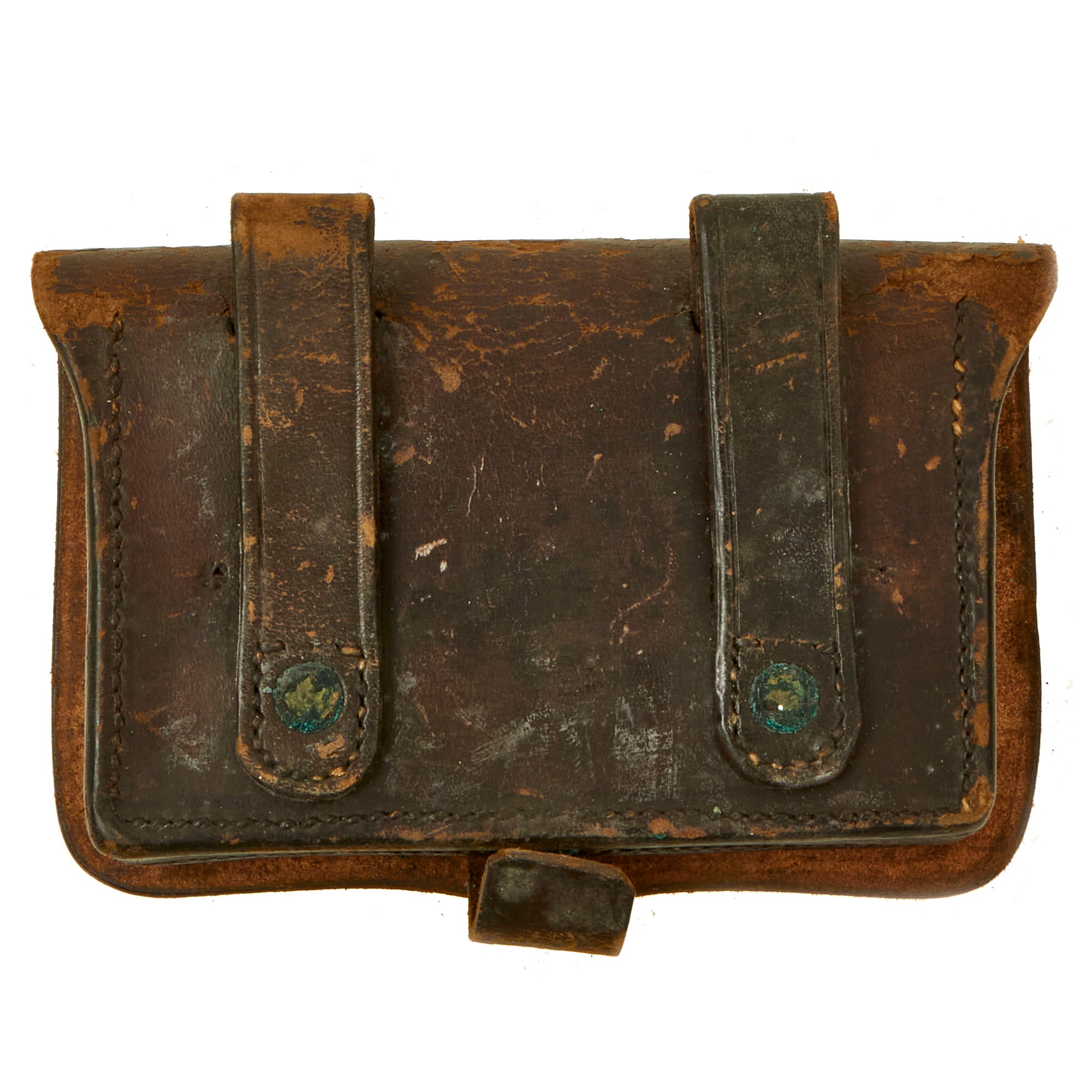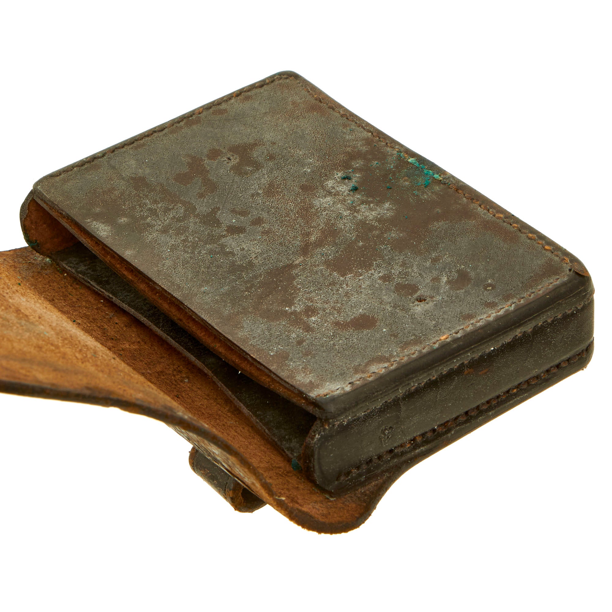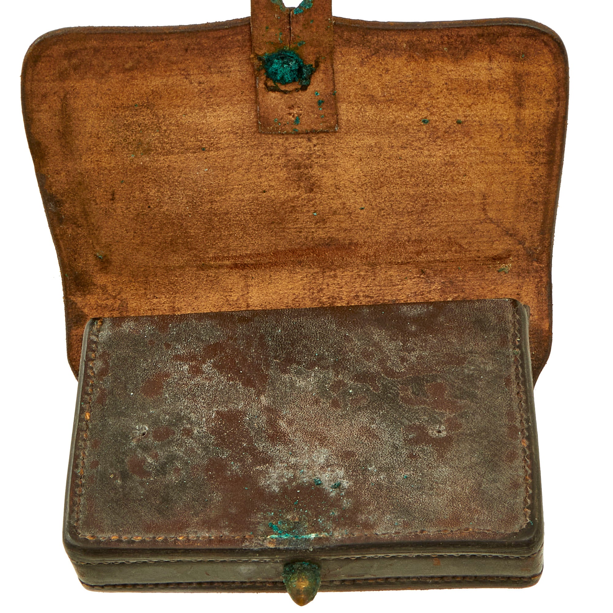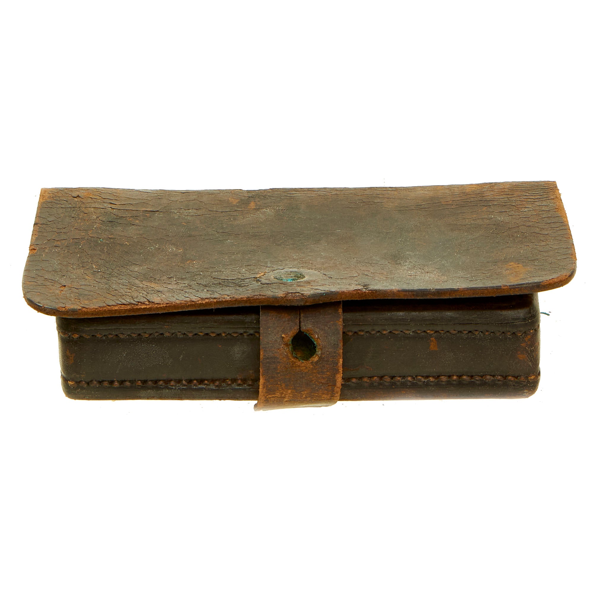 Original Item: Only One Available. This is a wonderful example of an early war pistol cartridge box, which even appears to be named or maker marked on the front! The box appears to be complete and without any extensive damage, though there are evident signs of use, wear and storage wear. US Infantry accouterments from 1839-1851, specifically Frogs on Bayonet Scabbards, Waist Belts and Cartridge Box Slings, were made from White Buff Leather. Buff leather is leather that has been whitened through a complex, expensive and time consuming chemical process. In 1851, the US Ordnance Dept. changed the leather used in these items to "Buff Leather, Blacked." Hence, all existing accouterments in the US Arsenals made with White Buff Leather were blackened and all new accouterments were made with buff leather that was processed without the whitening elements and was blackened. White and black buff leather will have a rough appearance on both sides.