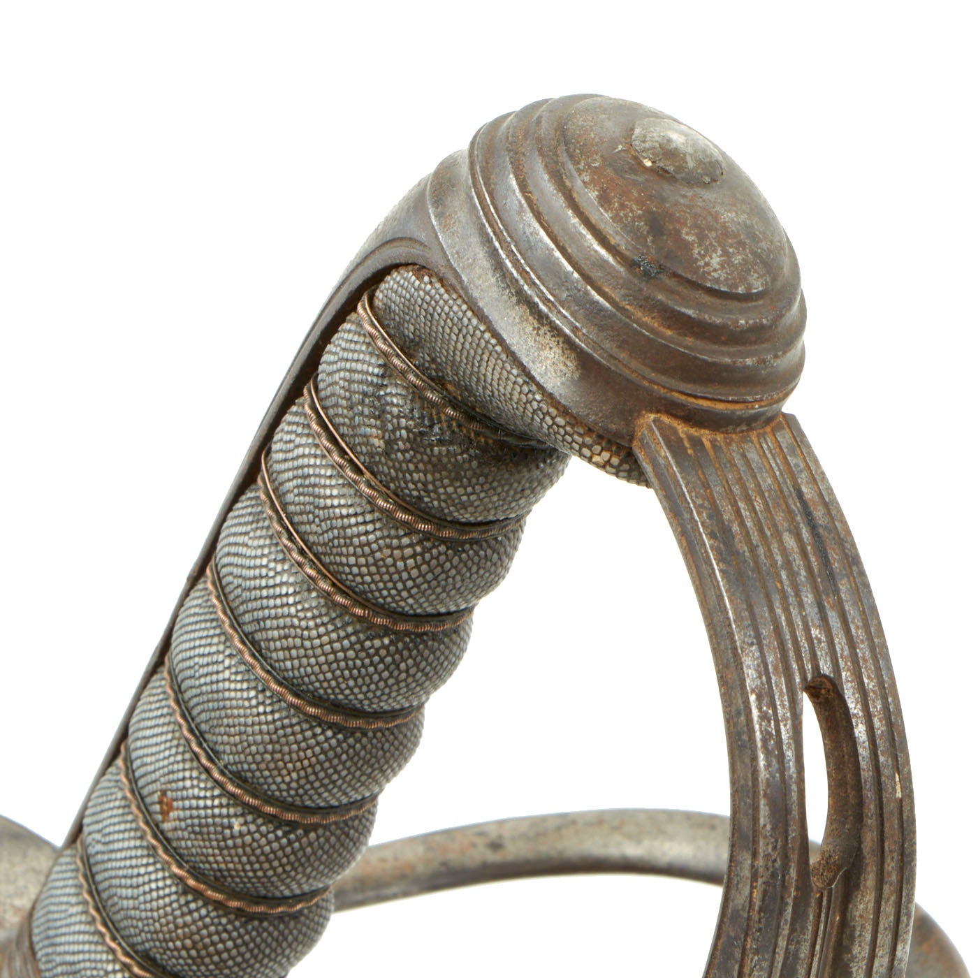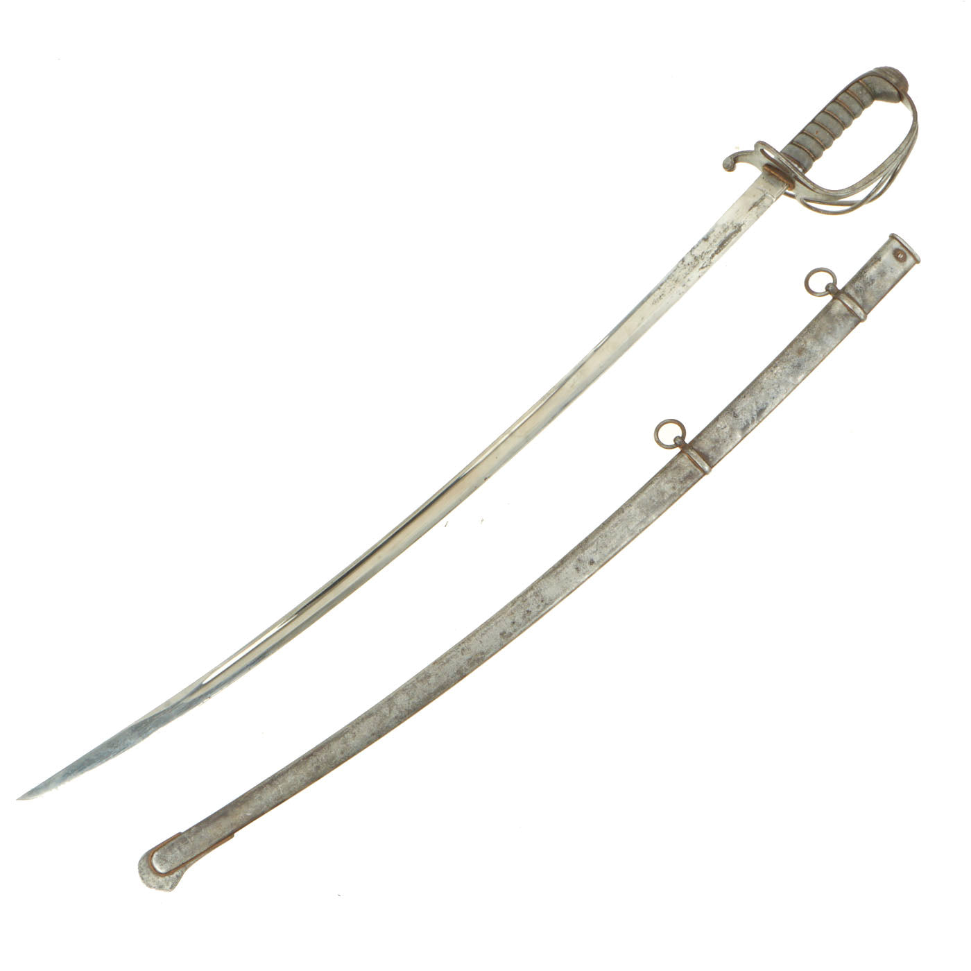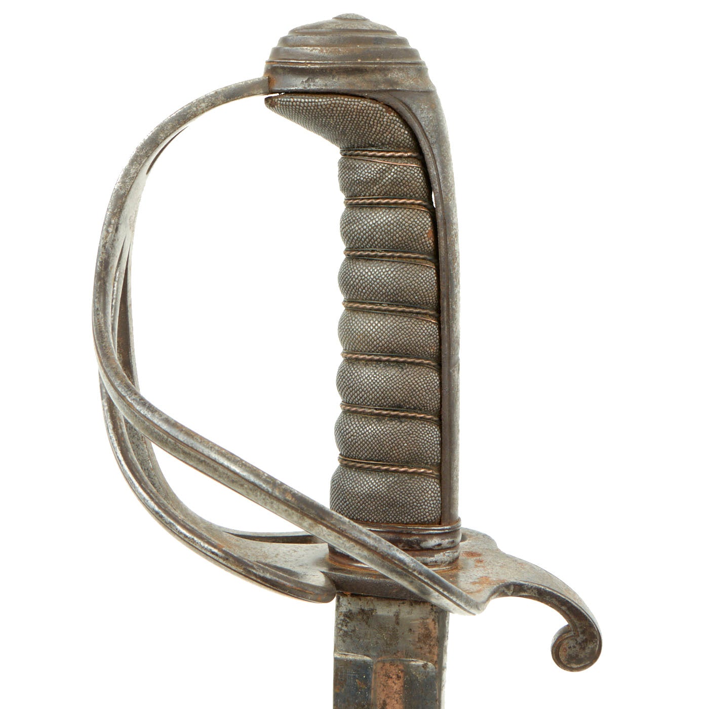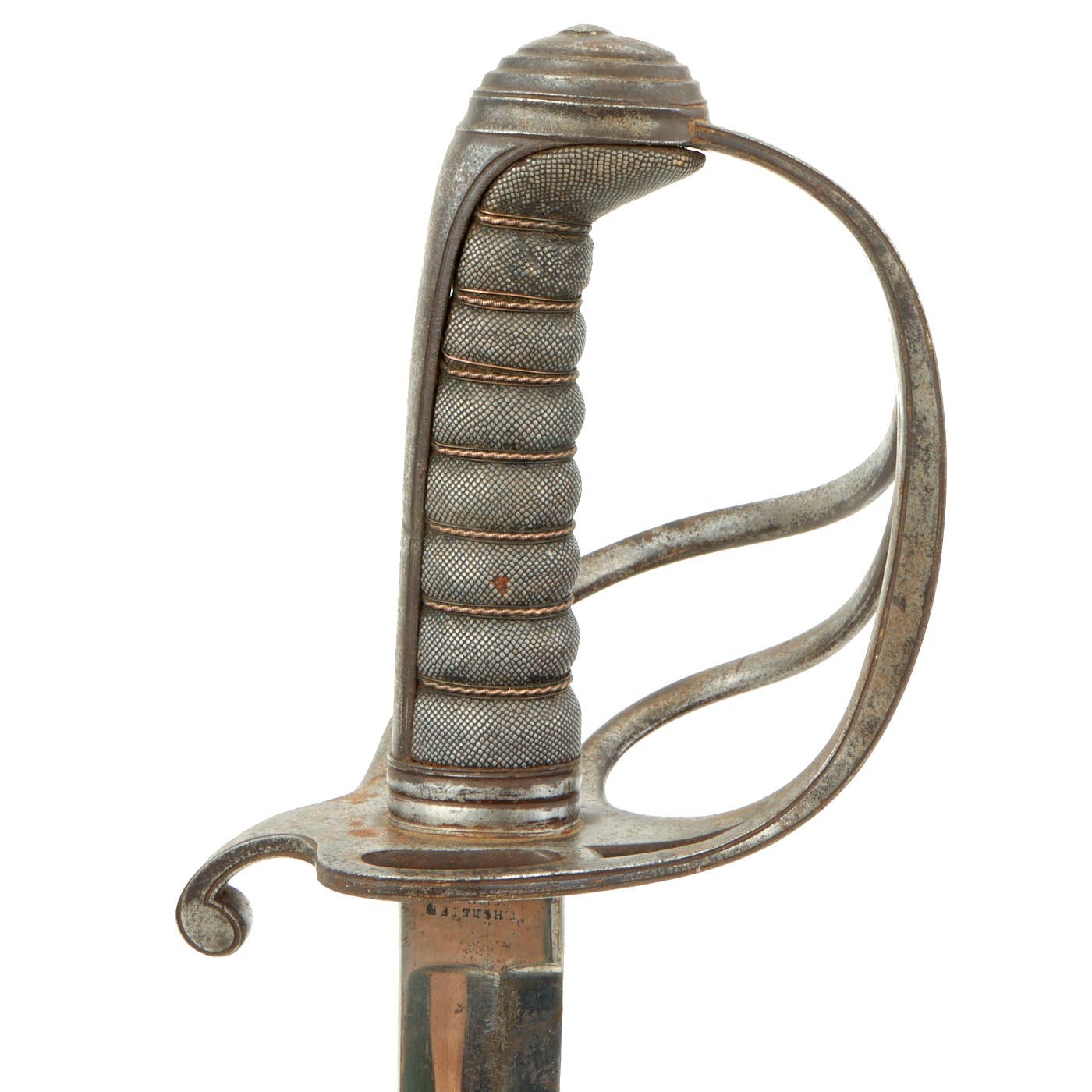 Original Item: Only One Available. Well this is something that we don't see every often! This is a very nice "Private Purchase" Non-Regulation Model 1860 Light Cavalry Saber, the principal cavalry saber used in the U.S. Civil War of 1860-1865. It roughly conforms to the M1860 pattern, except for the hilt, which is a more European steel "Dove head" pattern, with a three branch guard. It also features a lovely contoured wooden grip covered with sharkskin shagreen, held in place by wire binding. The hilt is in great shape, with a lovely patina, and only light wear to the grip.