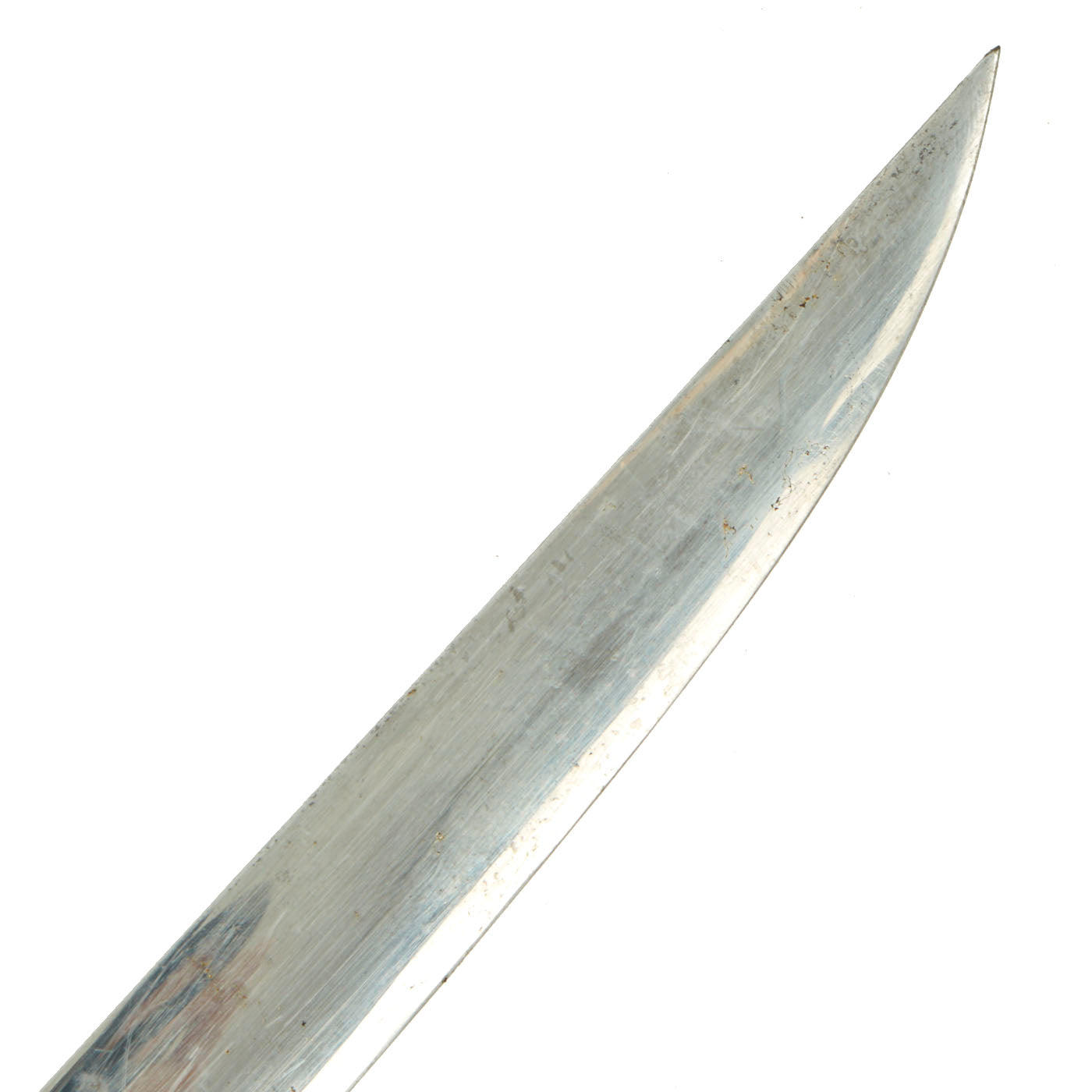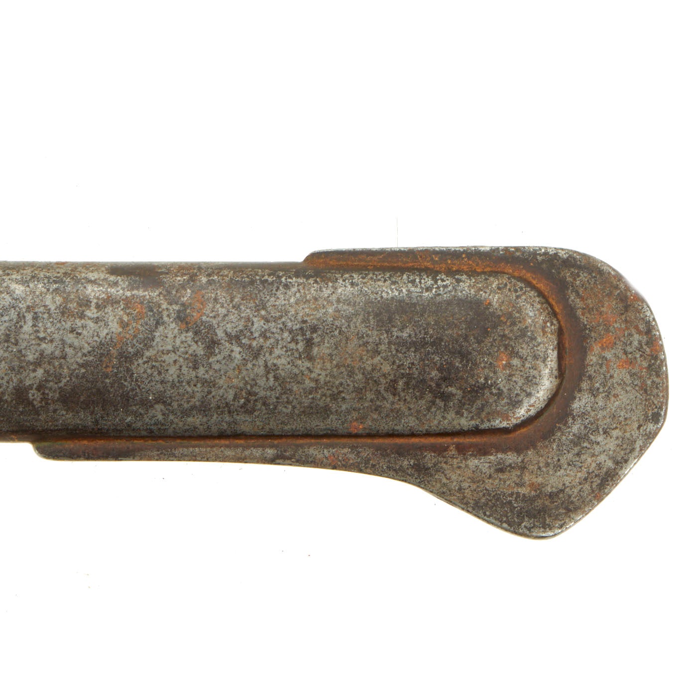 The saber comes with the original all steel-curved scabbard and complete with both mounting rings. Overall the finish does show staining and light peppering, but not any major rust scaling or damage. It fits the blade well, and is pretty much free of dents.