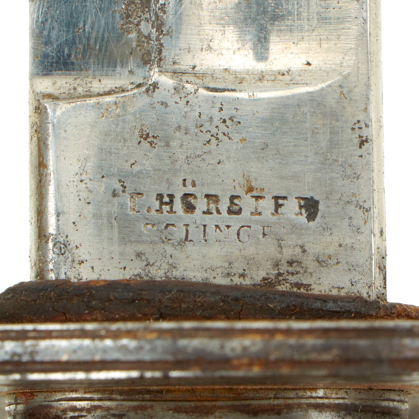 The curved 34 1/2 inch blade's ricasso is marked on one side with the F. Hörster address marking:-