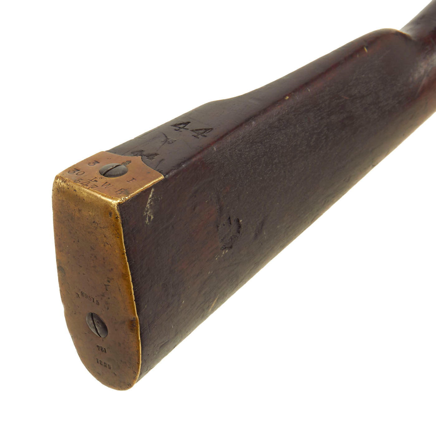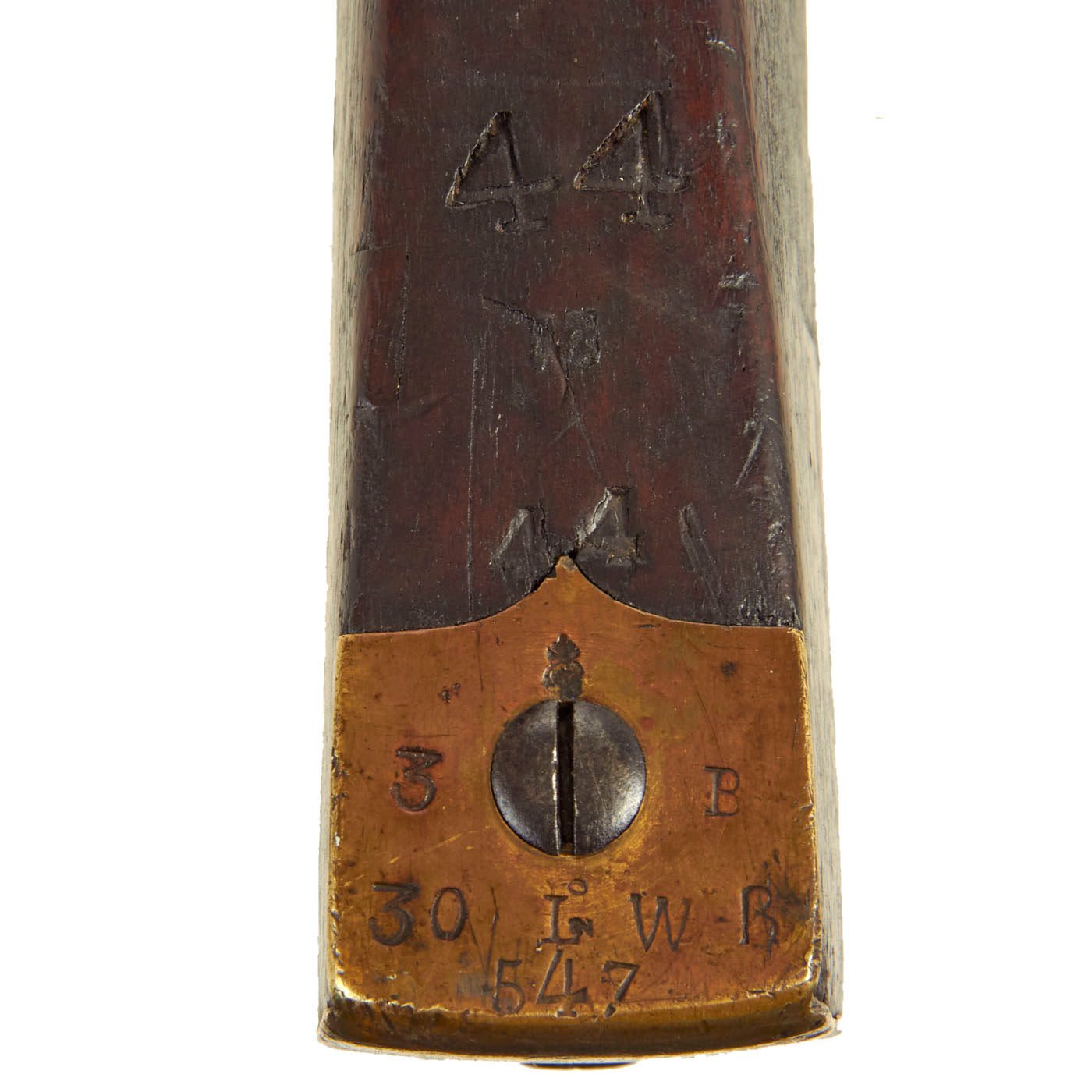The barrel nocks form also has a very faded FW monogram next to a date of 1829. The musket features a brass butt plate, which is regimentally marked 3 B / 30 L W R, for the 3rd Bataillon, 30th Landwehr Regiment. It is also marked with 547, matching the number on the barrel breech. The right side of the butt stock still retains a large CROWN / FW cartouche as well. The robust lock still functions correctly, holding at half cock and firing at full. All the brass fittings wear a mellow mustard patina. Finials of the trigger guard and the toe of the butt plate terminate in distinct three-pointed ends, correct for this model.