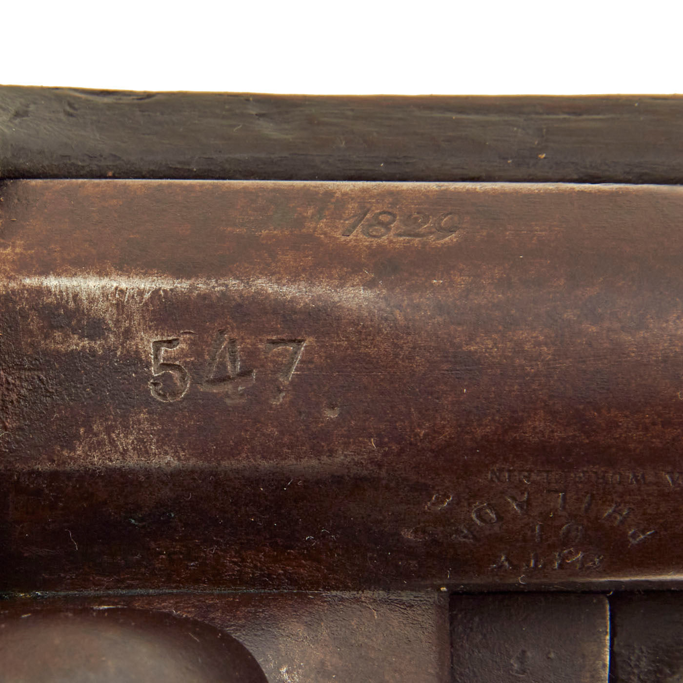 This indicates that the rifle was certainly converted and sold for use in the United States. This type of marking indicates it was issued to the Philadelphia City Guard during the U.S. Civil War. "A. Wurfflein" was a gunsmith and inspector for the city, who stamped weapons confirmed to be serviceable. His stamp is also seen on percussion converted U.S. made muskets as well, so this is definitely not a German marking, just a German last name. During the conflict it was always possible that the Rebel forces might make it that far into Union territory. There was also the possibility of civilian incursions, so local guard units were deployed in many cities. Number 547 is stamped on the barrel nocks form, which may be the rack number for use in the city.