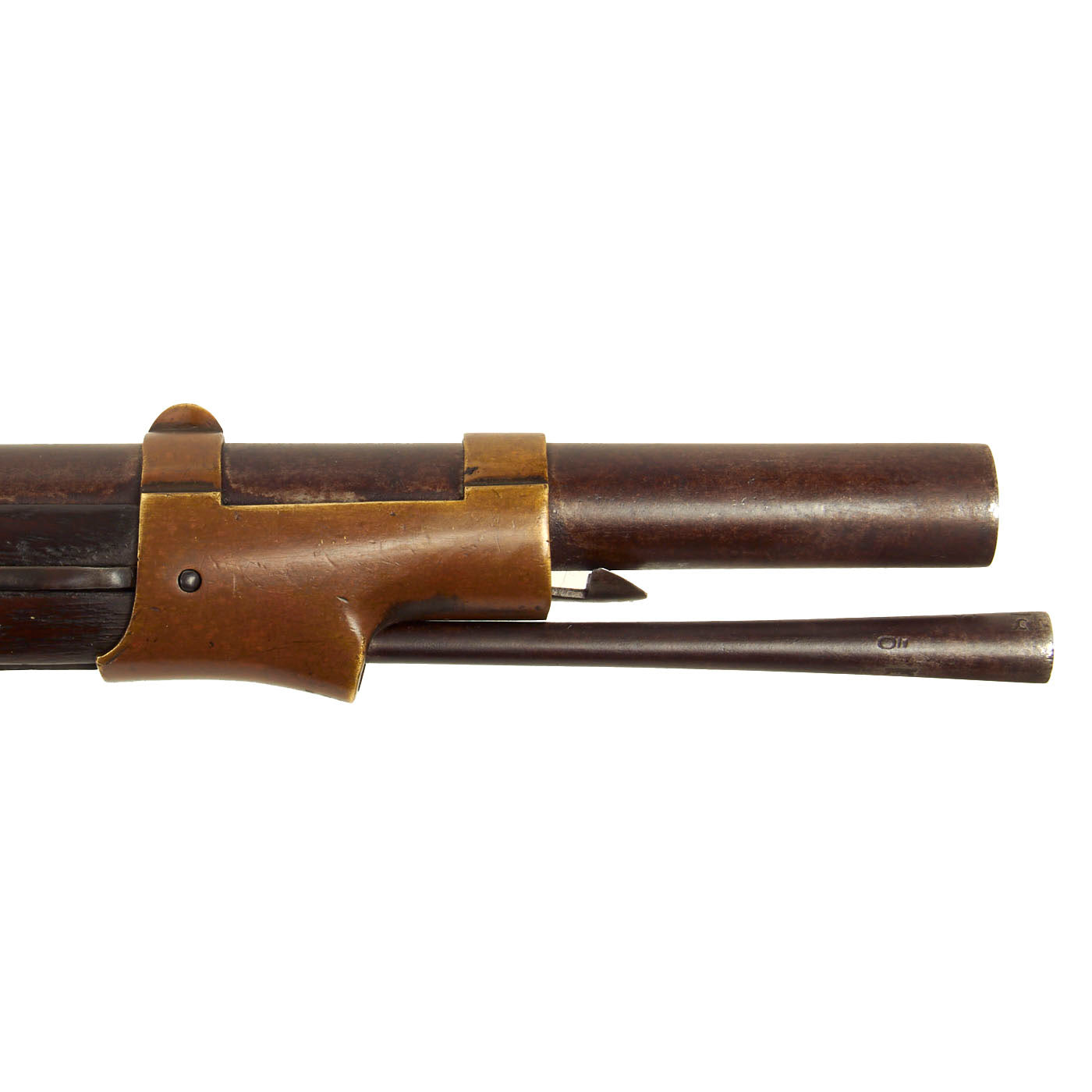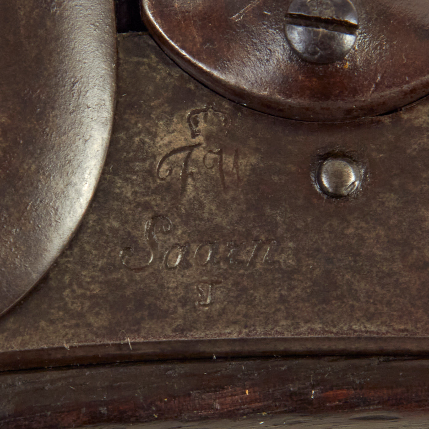 The lockplate surface has a lovely lightly oxidized patina, and has a curved tail that terminates into a small teat that differentiates it from the later 1839 model. Markings are standard with none found behind the hammer. Forward of the hammer, the markings are mostly clear and feature a Prussian Crown over FW monogram, for Prussian King Frederick William III, who reigned 1797 - 1840. The lock plate is also marked Saarn / T, and with a faint CROWN / S at the top under the hammer for the arsenal found in the Rhineland which had at one time been a Monastery.