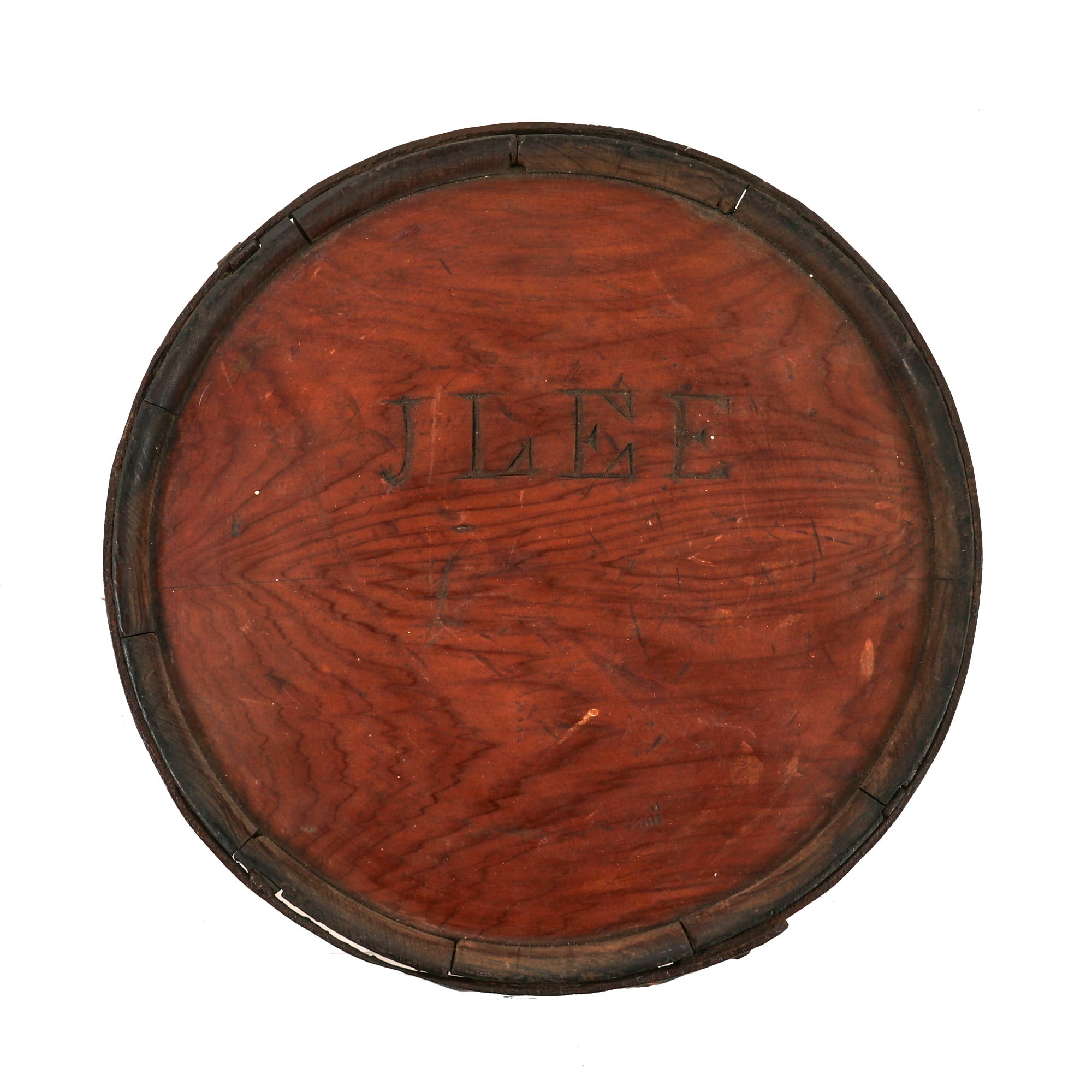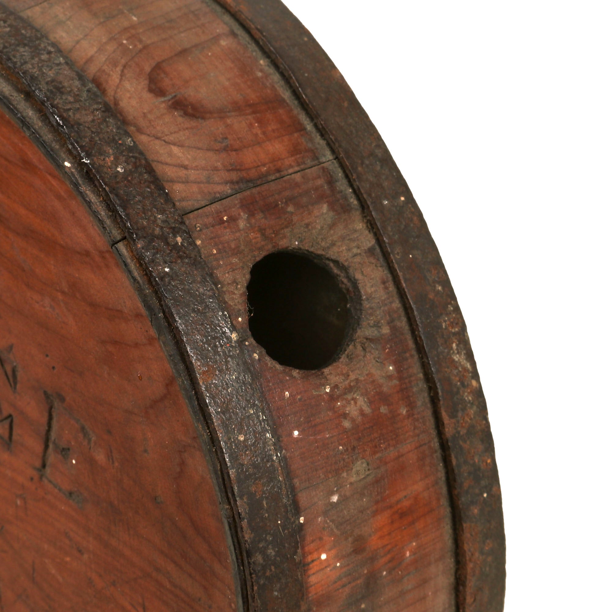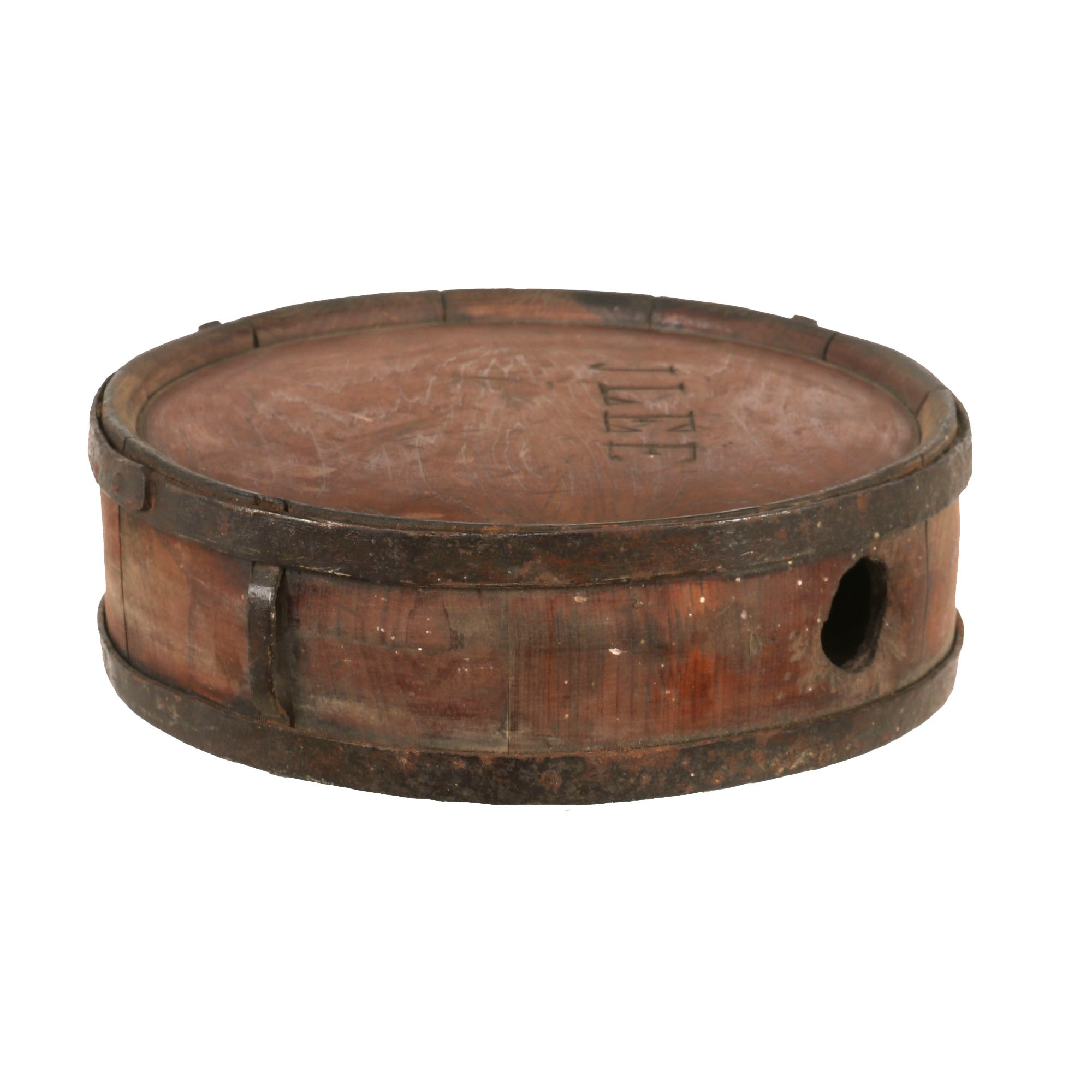 This is a lovely example of a Civil War, Confederate States of America manufactured wooden drum canteen. It measures almost 7 1/2" in diameter and is 2 3/8" wide. We believe the wood species used for construction is cherry wood, and has an overall dark cherry color over a majority of the surface. The circumference of the body consists of 11 tight fitting sections of wood, held firmly to the sides by two iron bands. The bands are 3/8" wide and held in place by a single iron rivet. All three iron sling guides are still present. The bands and sling guides have a matching plum patina. The spout is missing, which is common with these canteens.