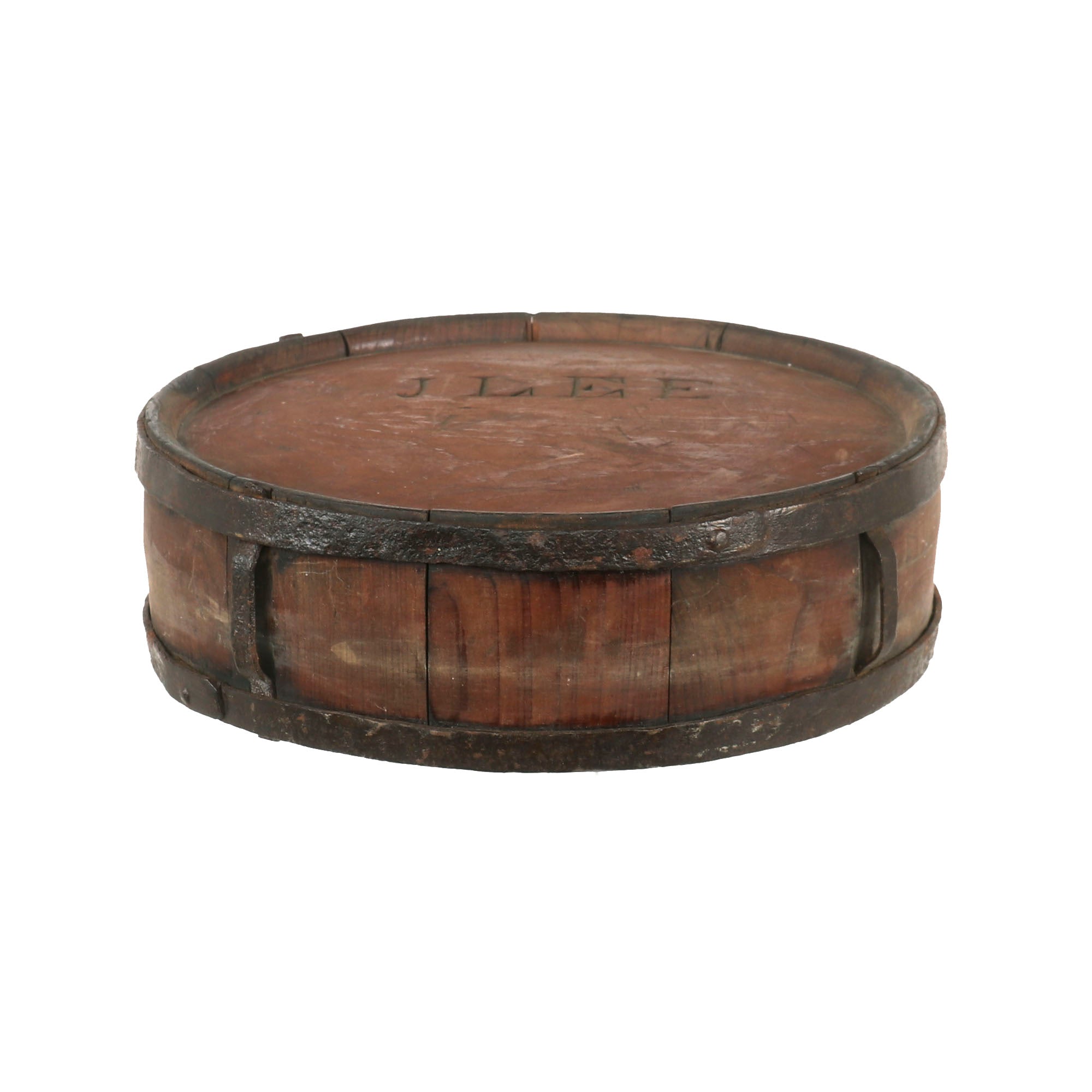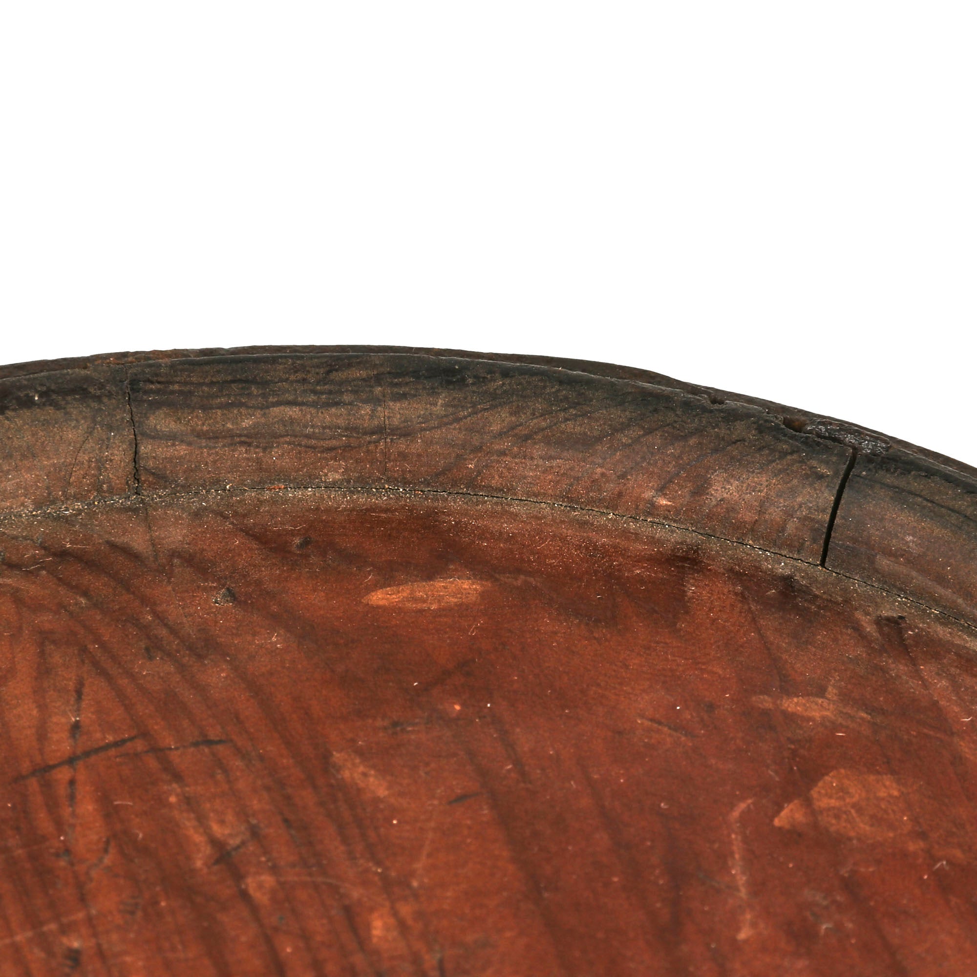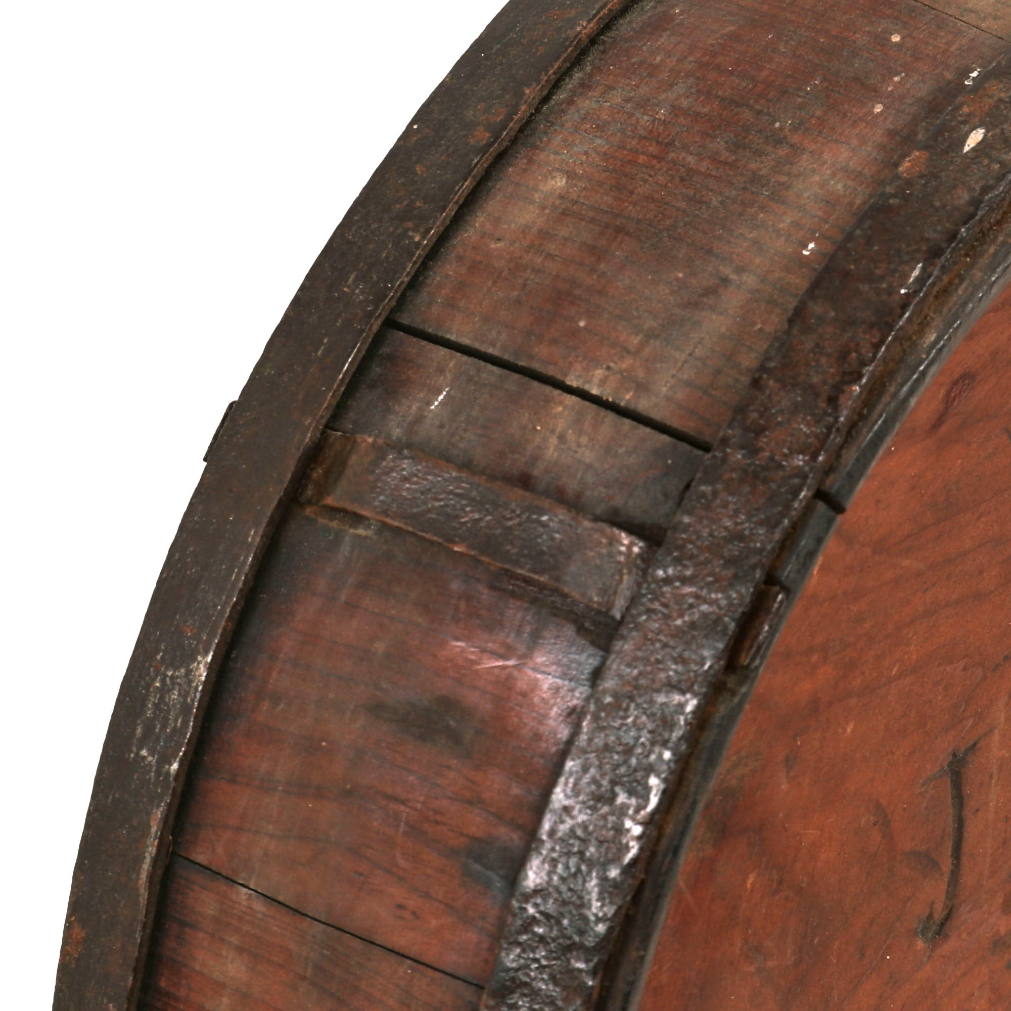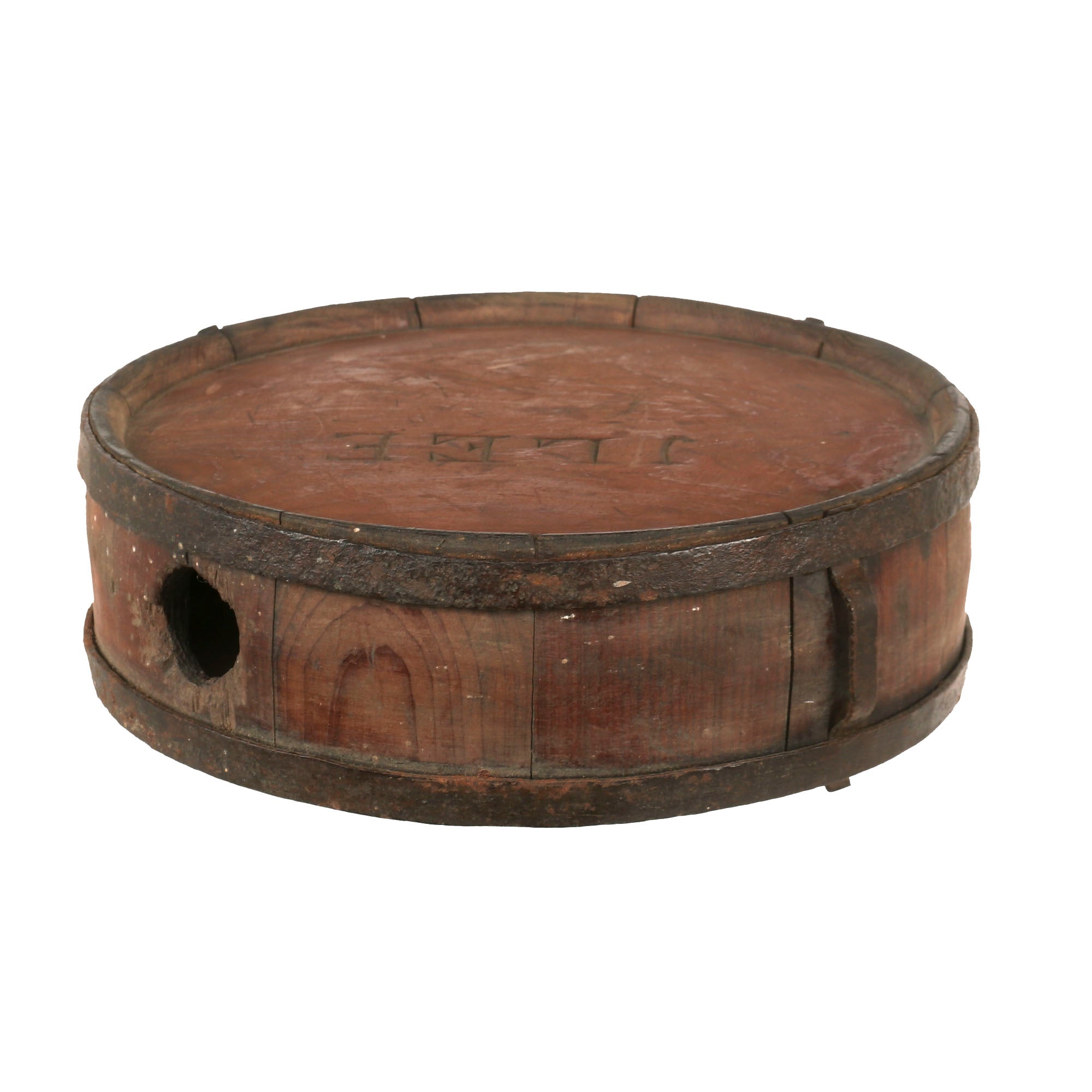 This is a lovely example of a Civil War, Confederate States of America manufactured wooden drum canteen. It measures almost 7 1/2" in diameter and is 2 3/8" wide. We believe the wood species used for construction is cherry wood, and has an overall dark cherry color over a majority of the surface. The circumference of the body consists of 11 tight fitting sections of wood, held firmly to the sides by two iron bands. The bands are 3/8" wide and held in place by a single iron rivet. All three iron sling guides are still present. The bands and sling guides have a matching plum patina. The spout is missing, which is common with these canteens.