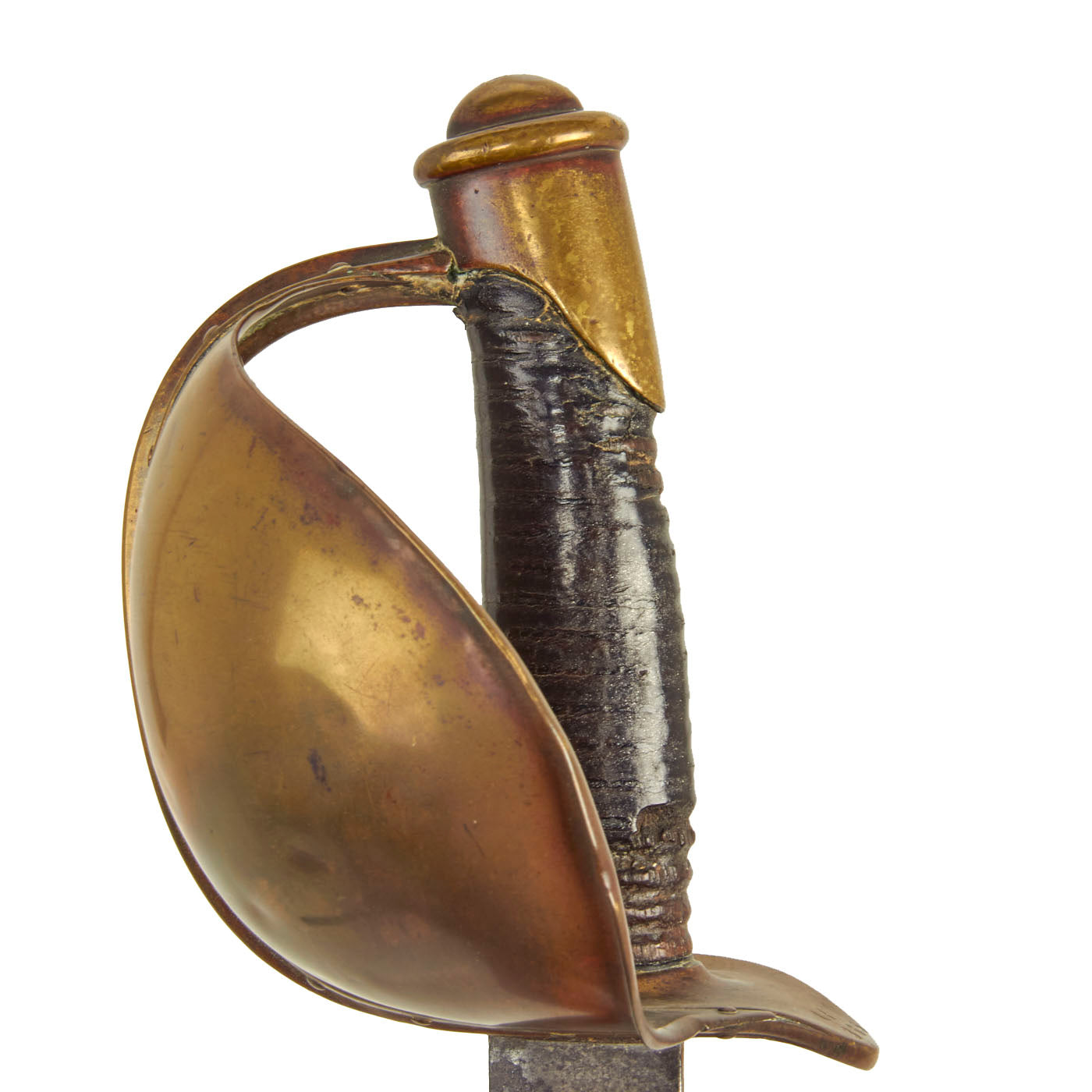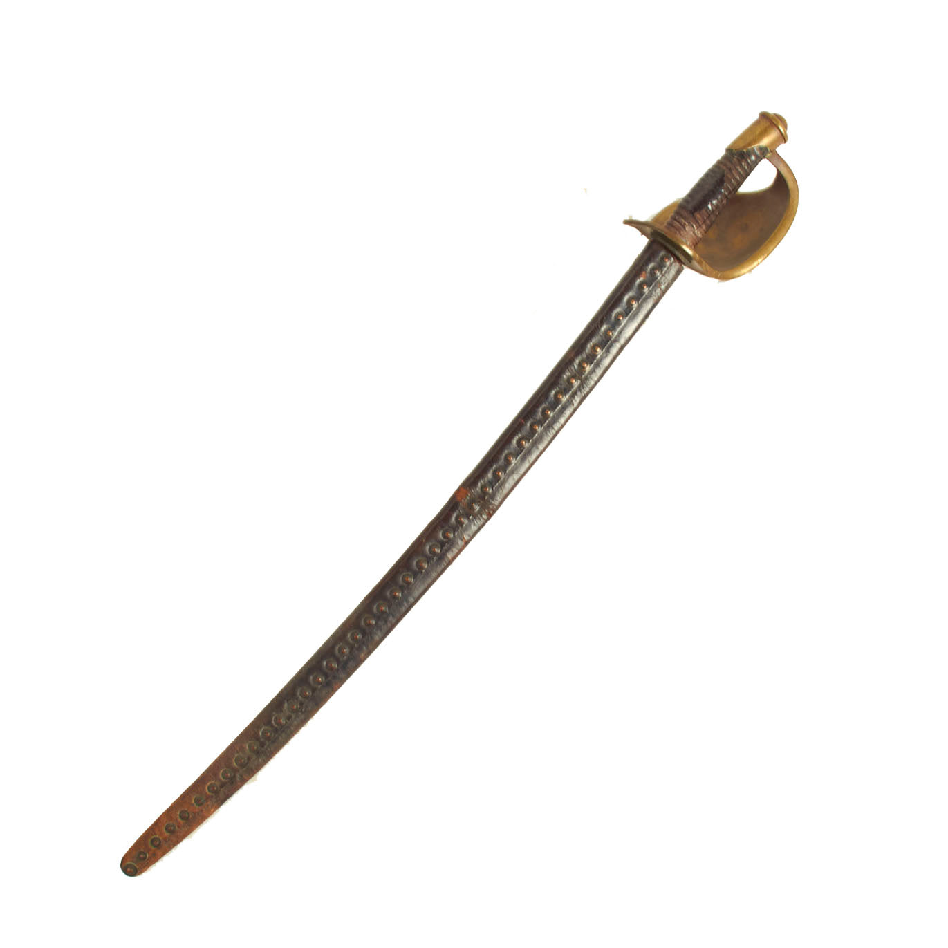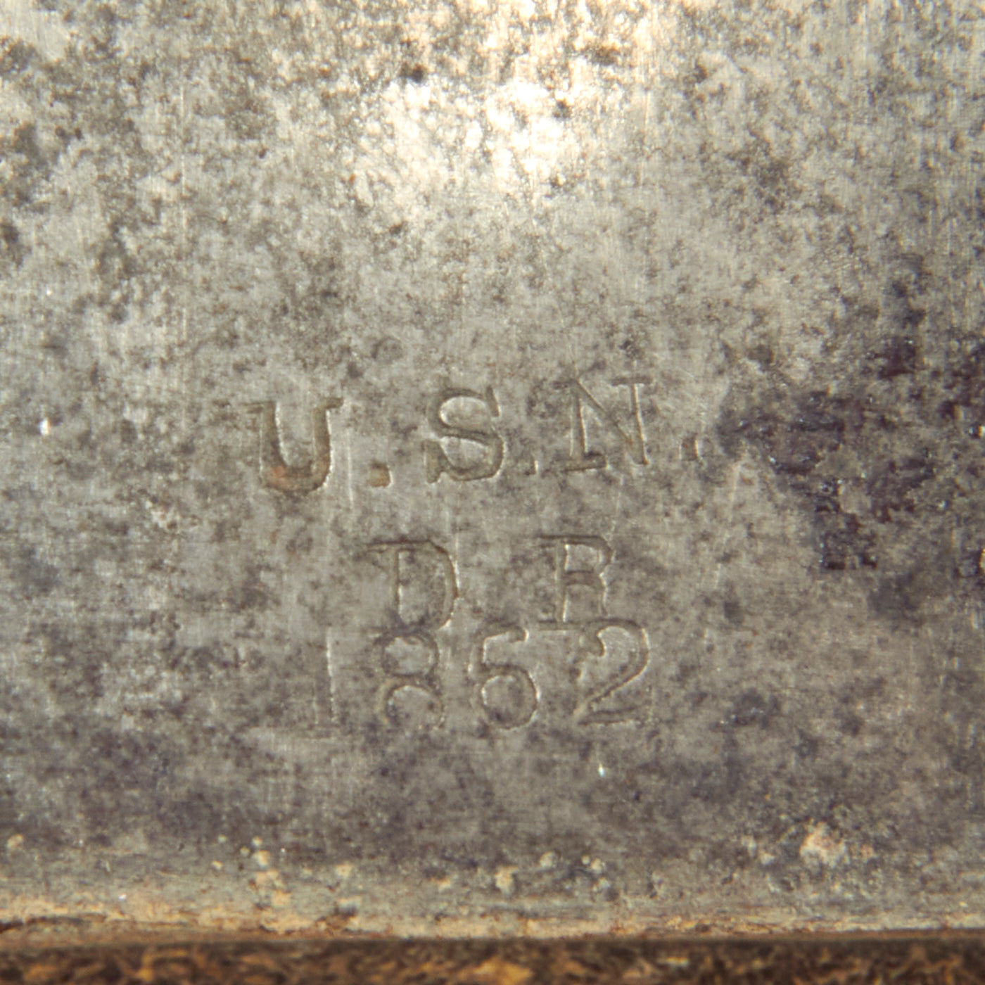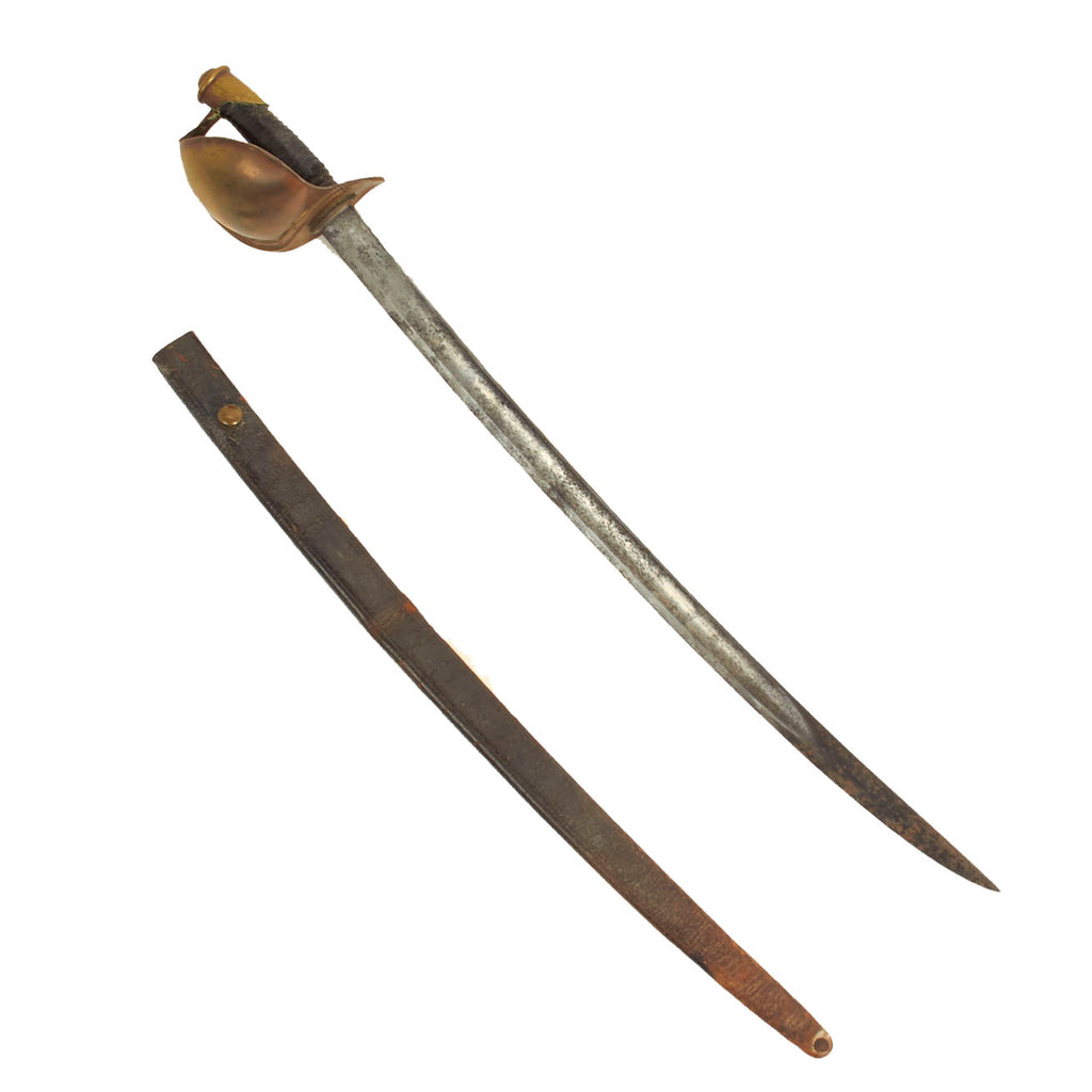 Original Item: Only One Available. Now this is a rare bird! This is a very nice example of the rarely seen U.S. Naval Model 1860 Boarding Cutlass, as used from 1860-1865. The boarding cutlass was derived from the French pattern of 1833, often referred to as a “cullere a pot,” or more commonly called the “soup ladle” weapon. It features all brass mounts and a wood groop with almost all of the original leather missing. These were NEVER bound in brass wire even though there are grooves. It comes with a mostly completely original scabbard, which is more rare than the cutlass!