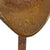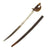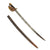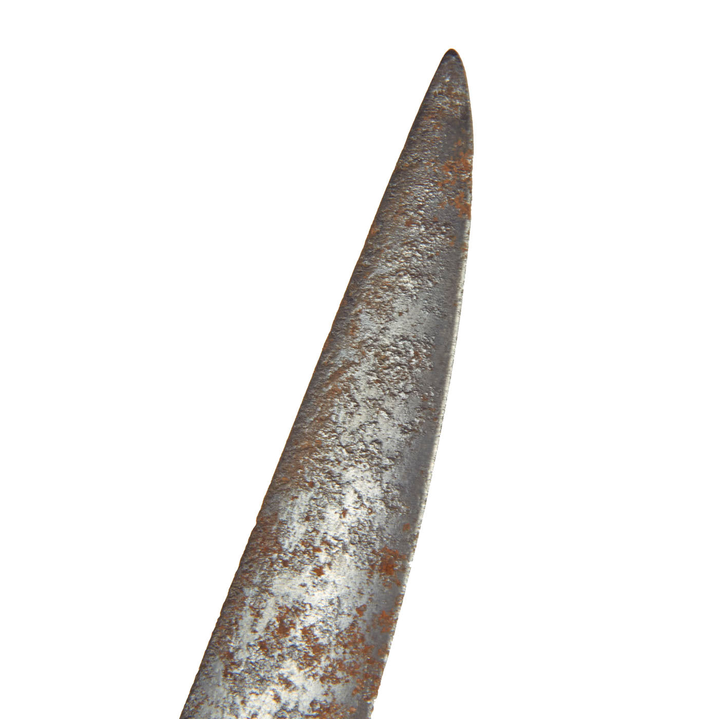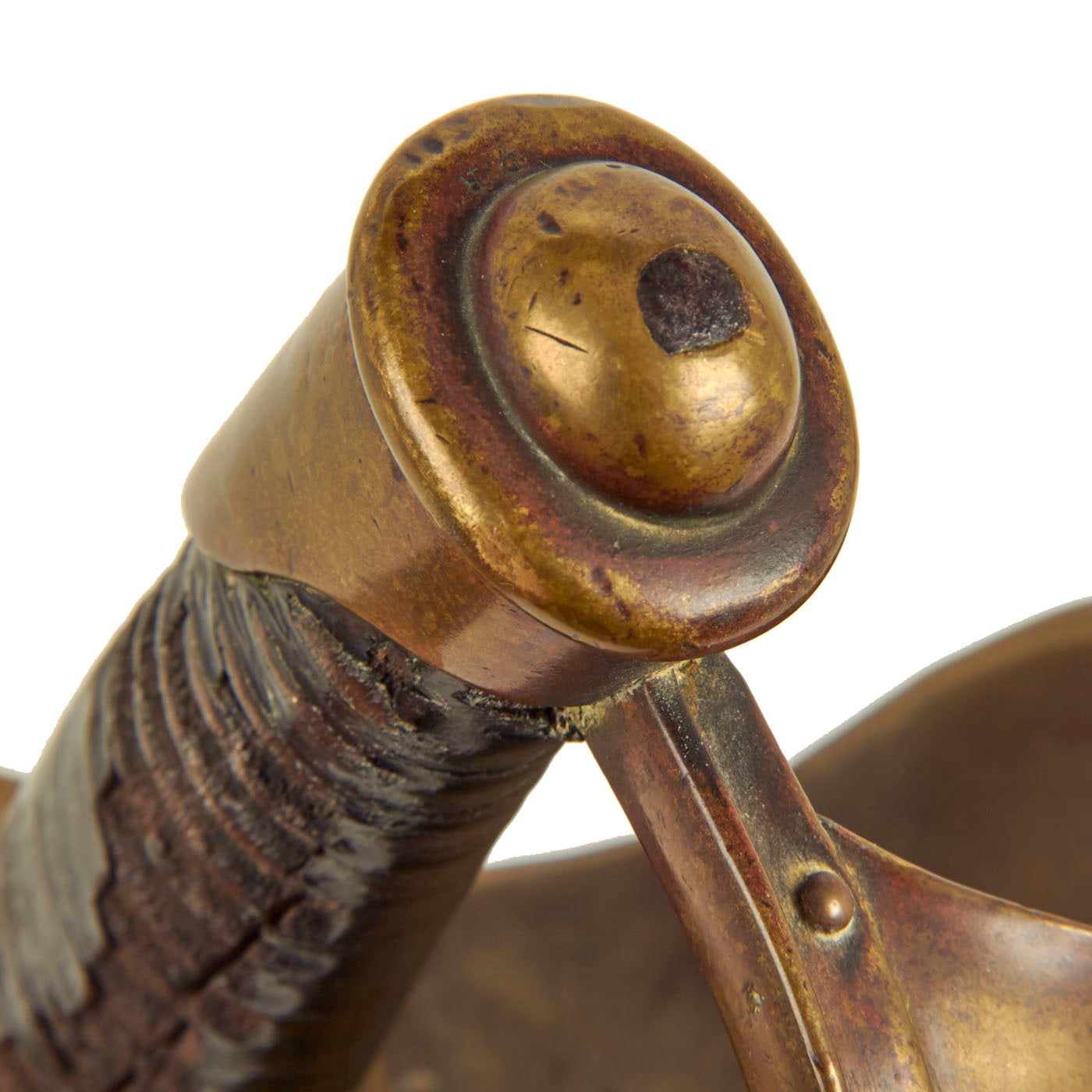 The 26 inch blade is in very good condition, with a bright finish with just a bit of oxidation staining in places. The edge is a bit rough due to some light denting. Brass bowl hand guard showing signs of its very rare ORIGINAL tin plating, surrounding the grooved wooden grip. The guard has a lovely mustard patina.