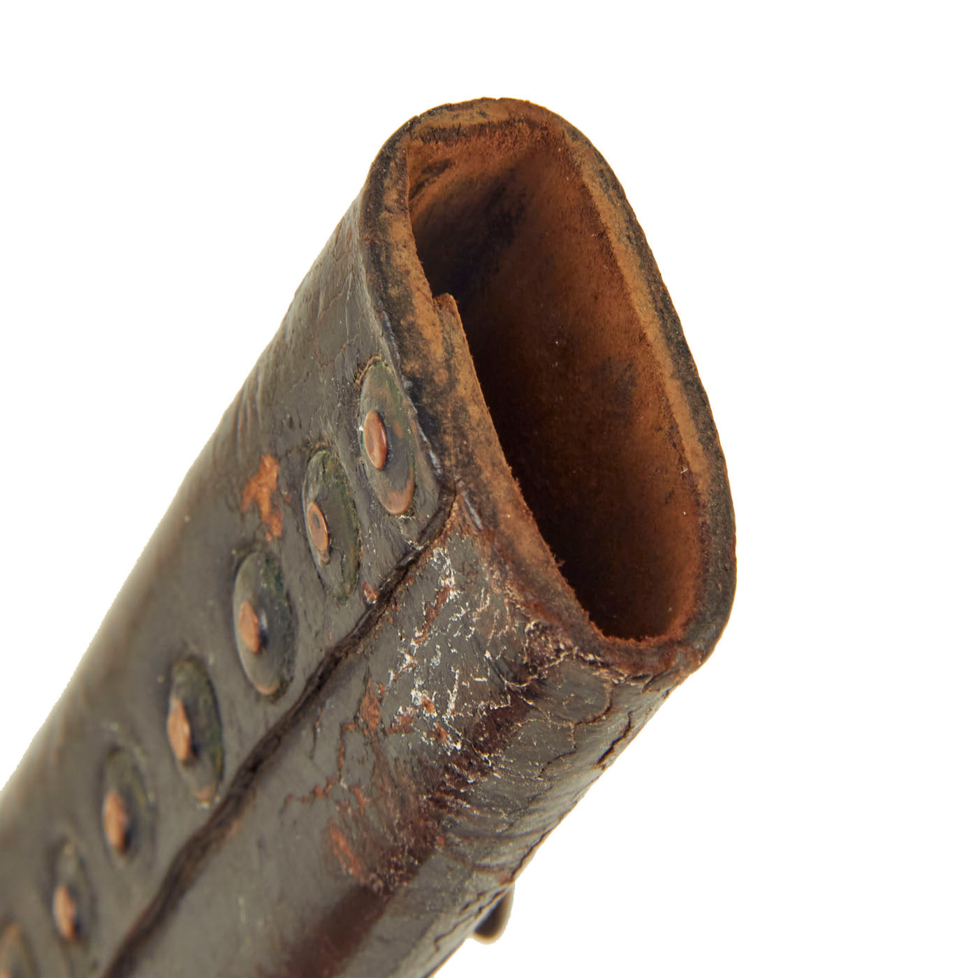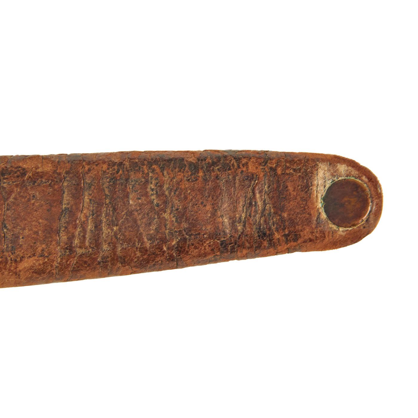 This classic cutlass comes complete with its rare original early style heavy leather scabbard secured at rear by a series of brass/copper washer rivets covering its full length. There never were bottom or throat mounts to these scabbards. Only a brass stud mounted in the leather about 3" down from the top of the scabbard which was intended for use with a large leather belt frog also of leather.