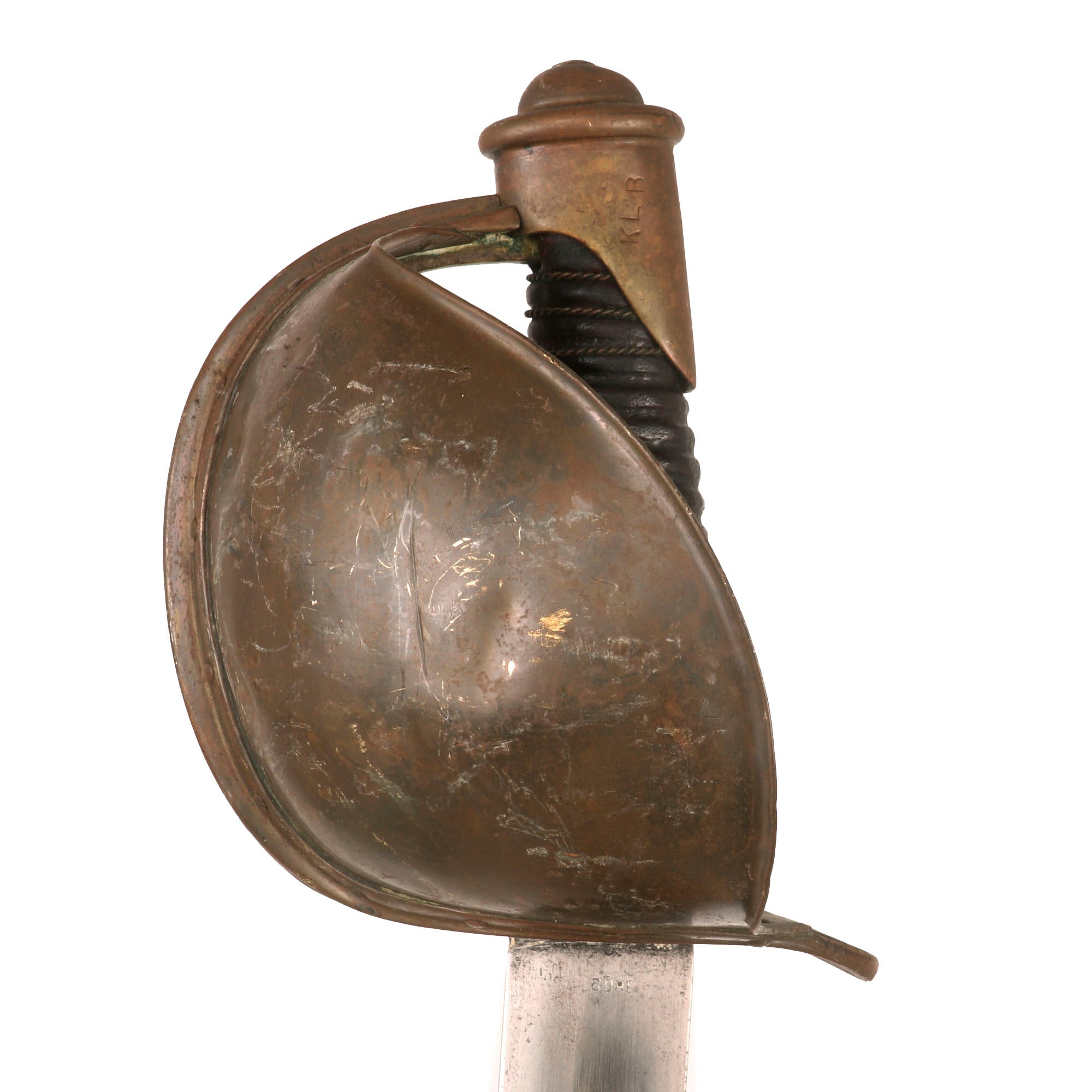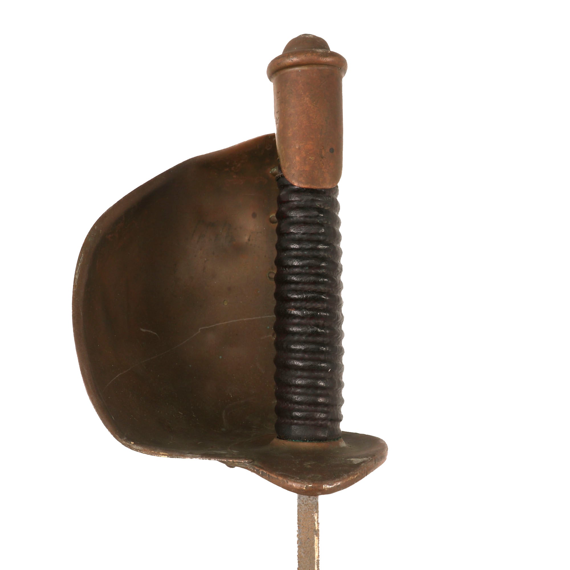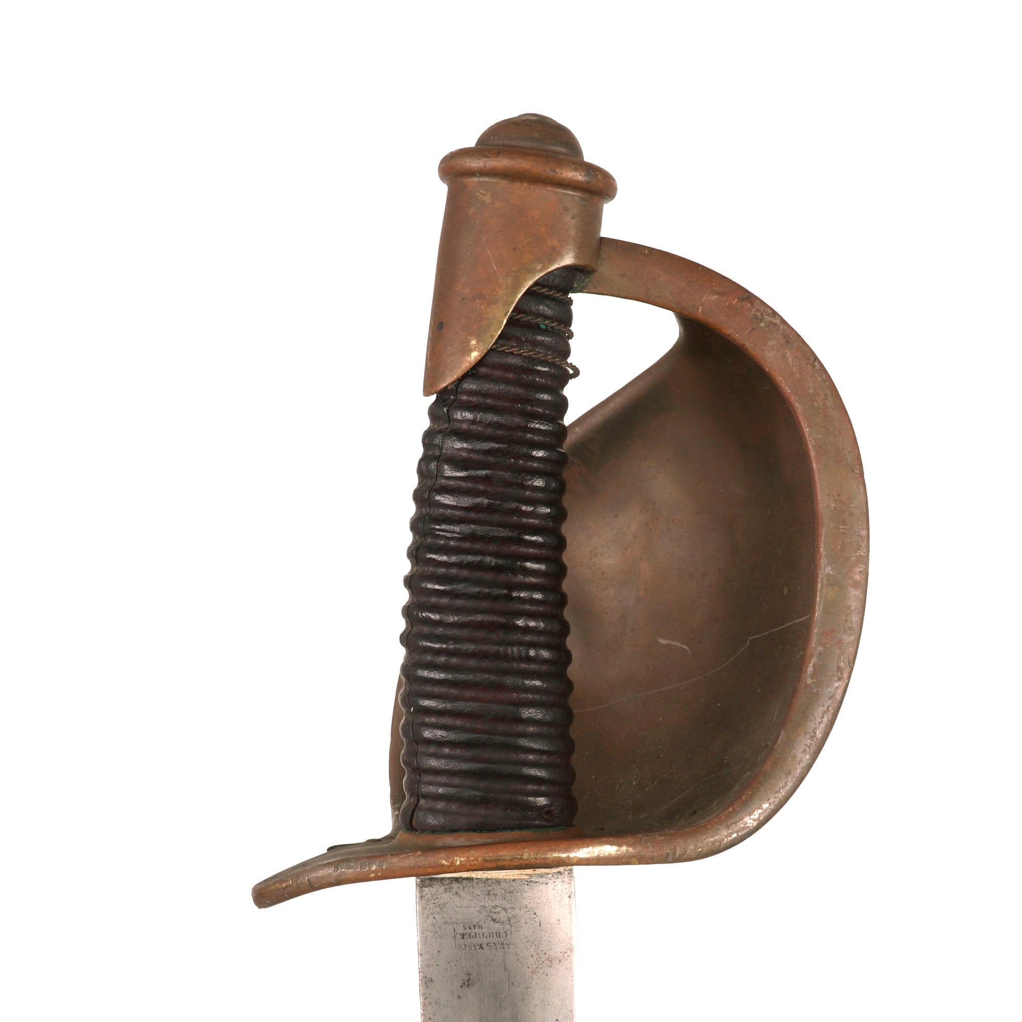 Original Item: Only One Available. This is a fair example of the rarely seen U.S. Naval Cutlass, as used from 1860-1865. The boarding cutlass was derived from the French pattern of 1833, often referred to as a “cullere a pot,” or more commonly called the “soup ladle” weapon. It features all brass mounts and a leather-wrapped wooden sword grip. These were never bound in brass wire even though there are grooves.The curved 26 inch blade's ricasso is marked on one side with the banner style address, which is partially faded-MADE BYAMES MFGCHICOPEEMASSOne the other side it is well marked with-1862The blade is in fair shape, however it has some heavy oxidation which has been cleaned in spots, but there are some areas of heavy pitting. There is an inspector marking stamped on the pommel, KLB, although we couldn’t find an inspector with these initials, so this could be the sailor’s initials. The serial number 9M/521 is stamped under the crossguard.The handle is in great shape with some small cracks and loss of leather but nothing too serious. There are some remnants of the original wire wrap near the pommel, but only about three strands are retained.Offered in fair but gorgeous condition, original Civil War Naval Cutlasses are getting harder and harder to find every year! Ready for further research and display!Specifications:Blade Length: 24"Blade Style: Curved Single Edge w/ FullerOverall length: 29 7/8“Basket dimensions: 4 1/2" width x 5” length