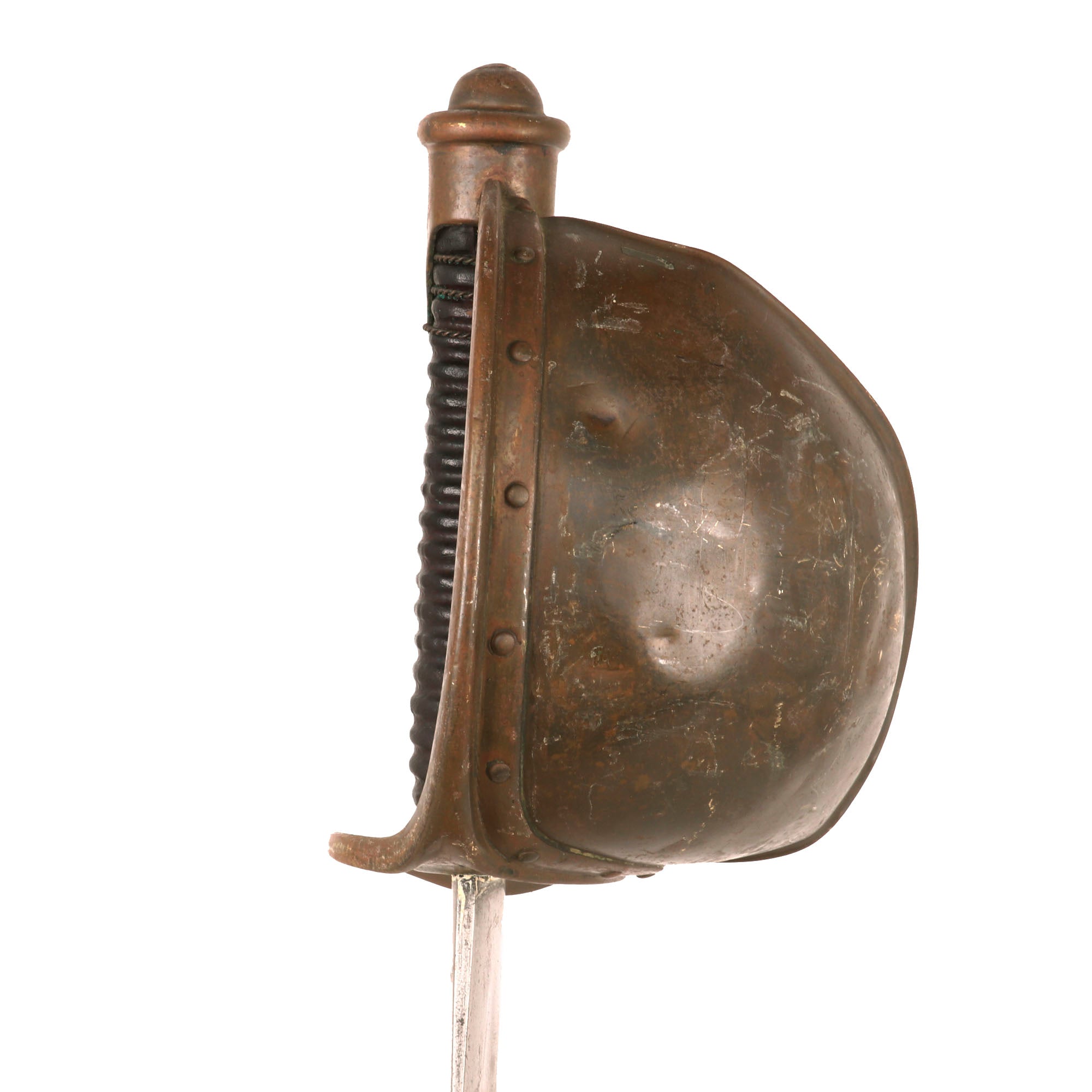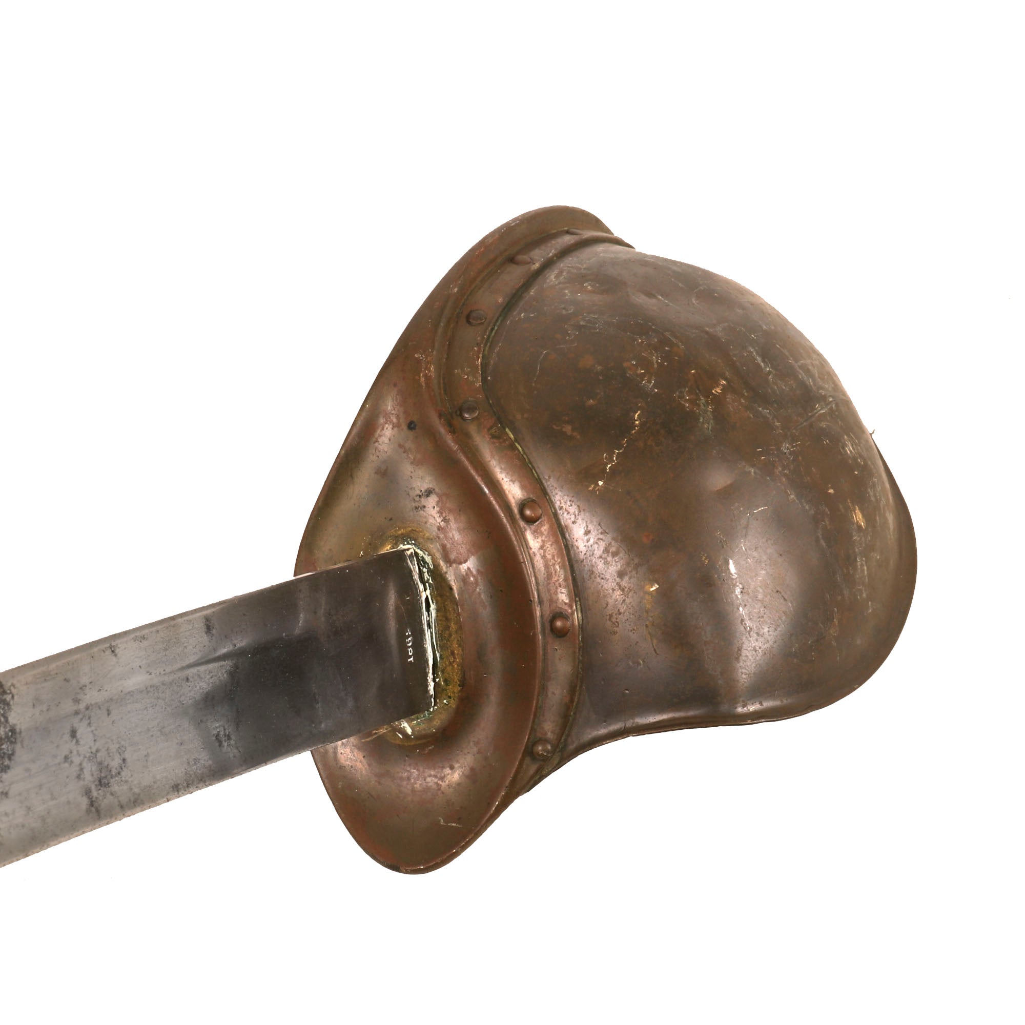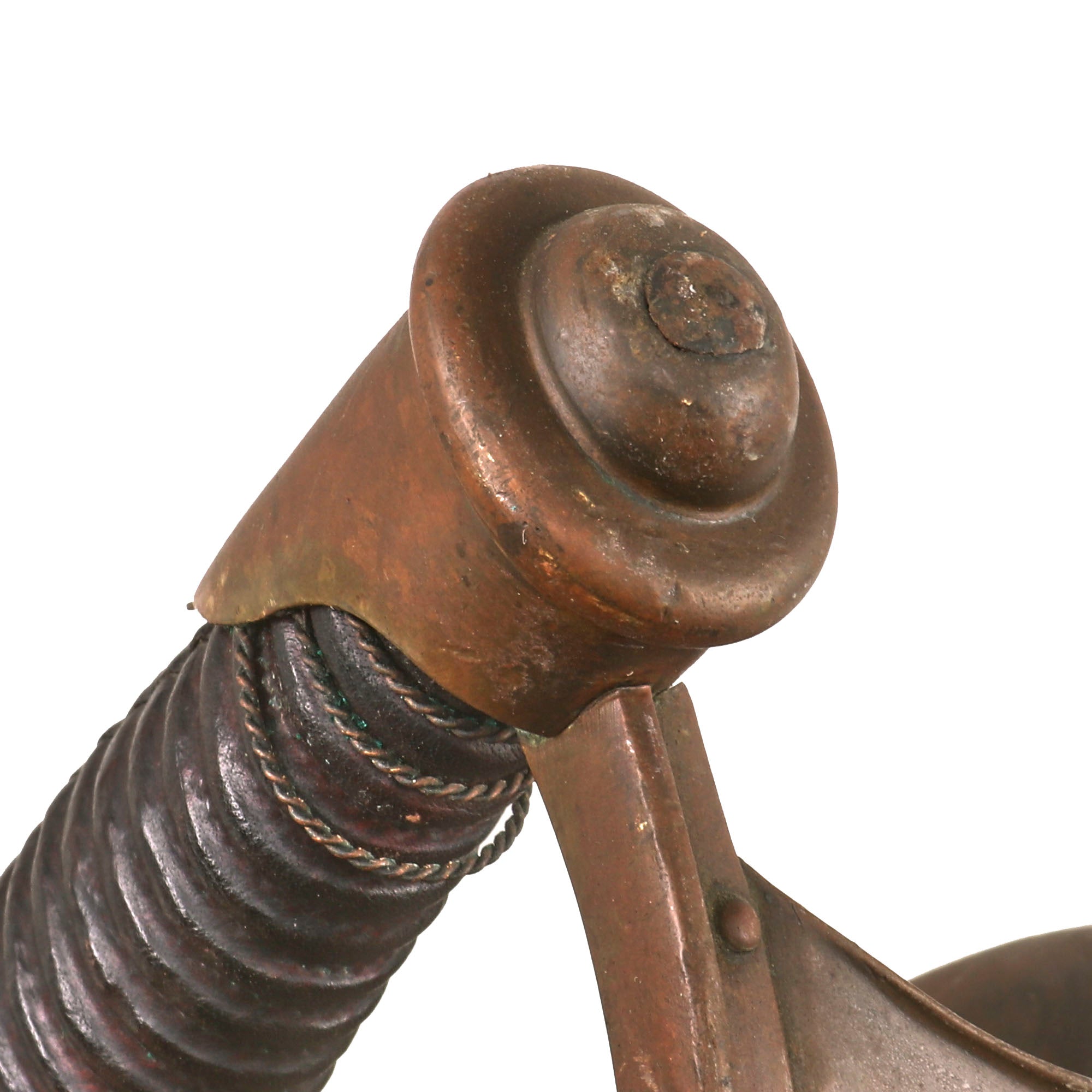 Original Item: Only One Available. This is a fair example of the rarely seen U.S. Naval Cutlass, as used from 1860-1865. The boarding cutlass was derived from the French pattern of 1833, often referred to as a “cullere a pot,” or more commonly called the “soup ladle” weapon. It features all brass mounts and a leather-wrapped wooden sword grip. These were never bound in brass wire even though there are grooves.The curved 26 inch blade's ricasso is marked on one side with the banner style address, which is partially faded-MADE BYAMES MFGCHICOPEEMASSOne the other side it is well marked with-1862The blade is in fair shape, however it has some heavy oxidation which has been cleaned in spots, but there are some areas of heavy pitting. There is an inspector marking stamped on the pommel, KLB, although we couldn’t find an inspector with these initials, so this could be the sailor’s initials. The serial number 9M/521 is stamped under the crossguard.The handle is in great shape with some small cracks and loss of leather but nothing too serious. There are some remnants of the original wire wrap near the pommel, but only about three strands are retained.Offered in fair but gorgeous condition, original Civil War Naval Cutlasses are getting harder and harder to find every year! Ready for further research and display!Specifications:Blade Length: 24"Blade Style: Curved Single Edge w/ FullerOverall length: 29 7/8“Basket dimensions: 4 1/2" width x 5” length