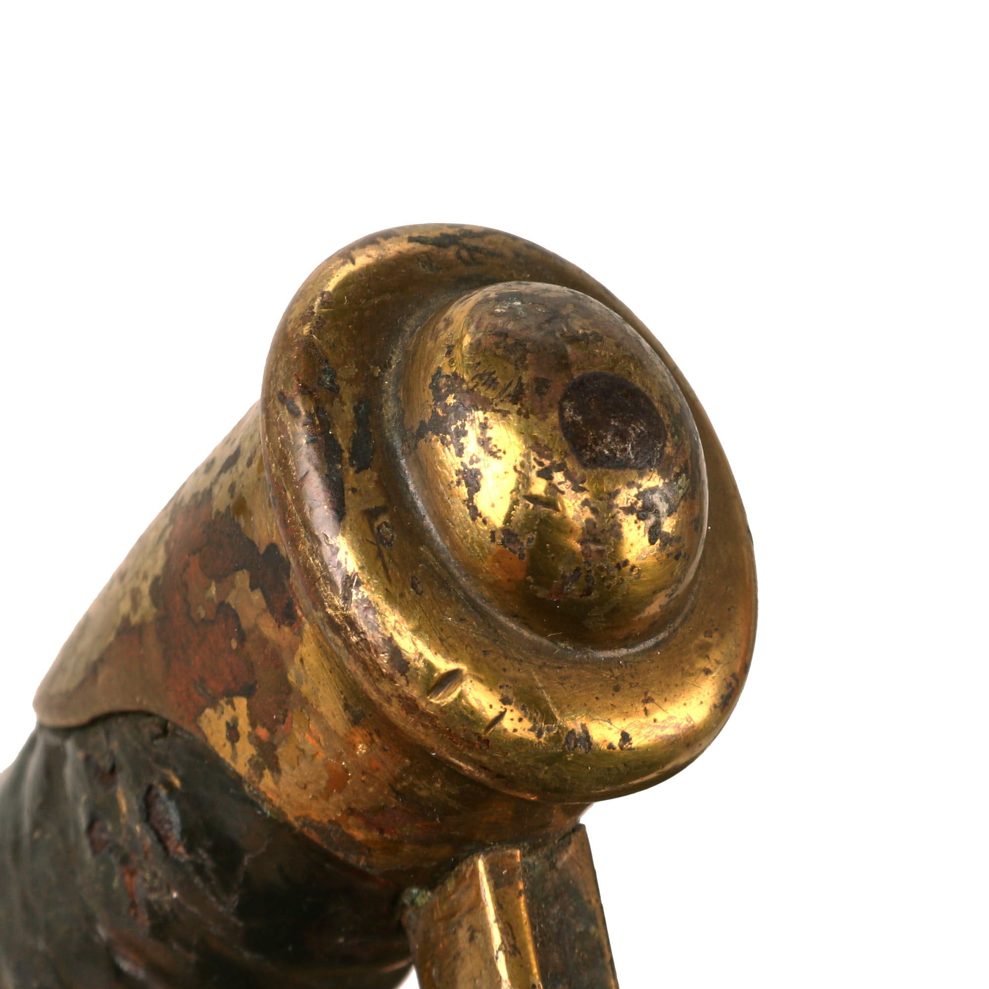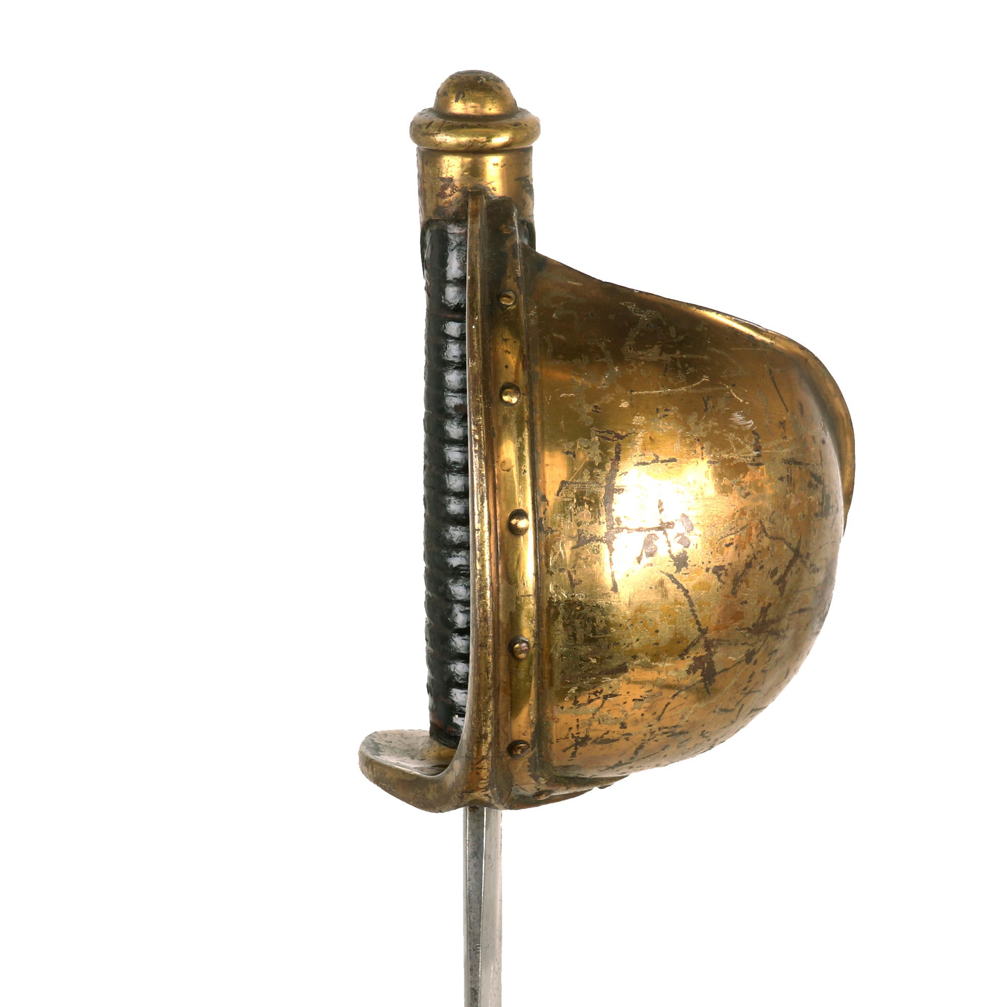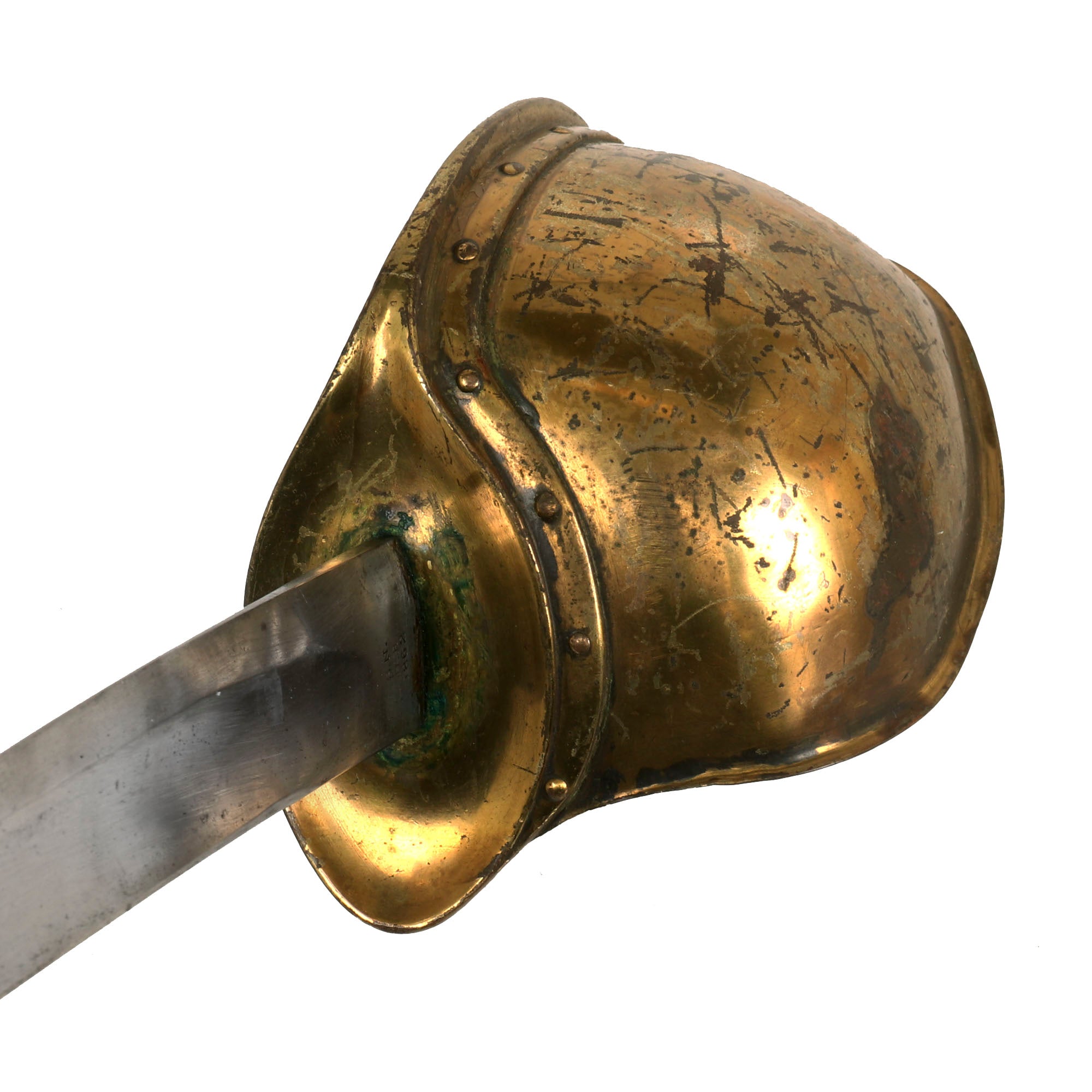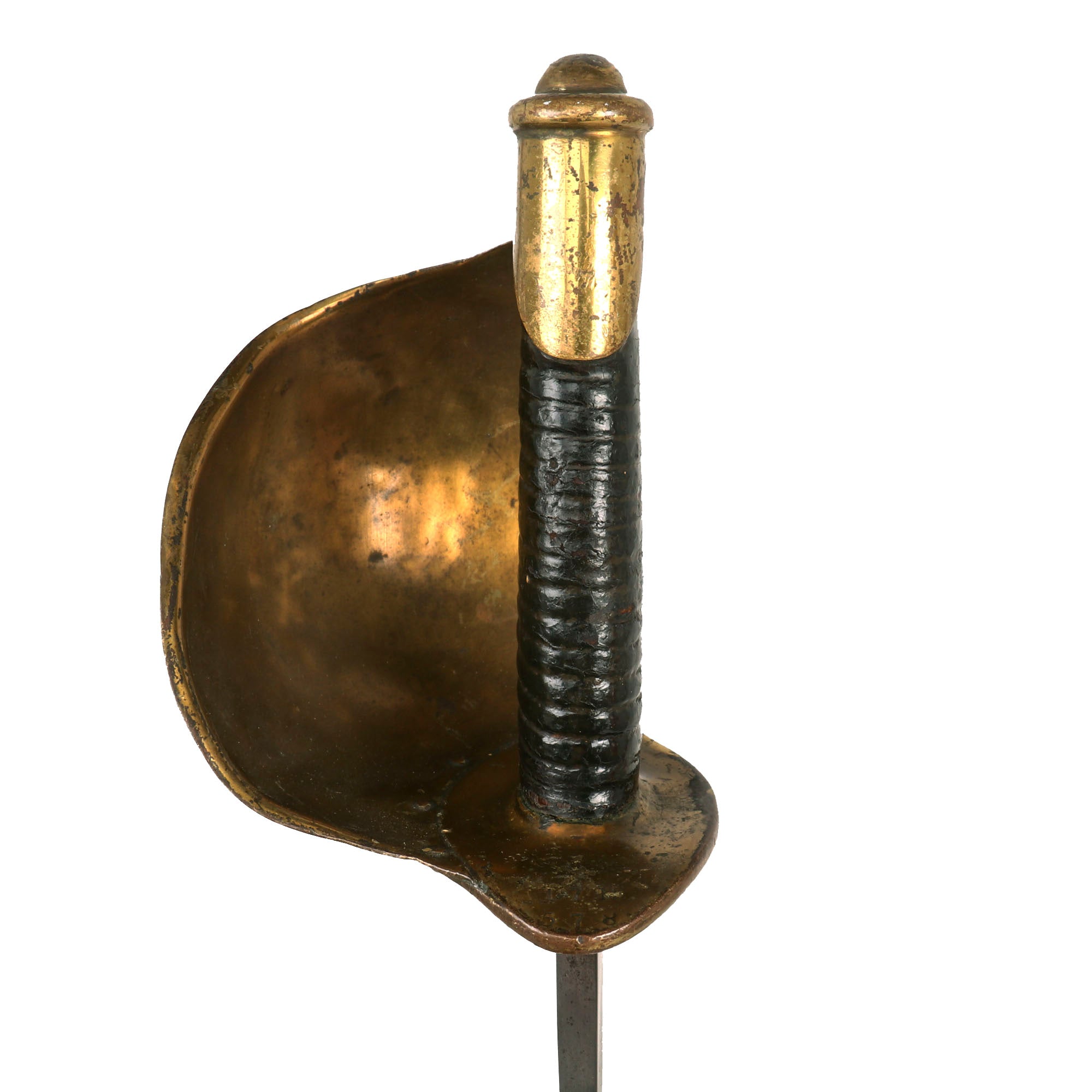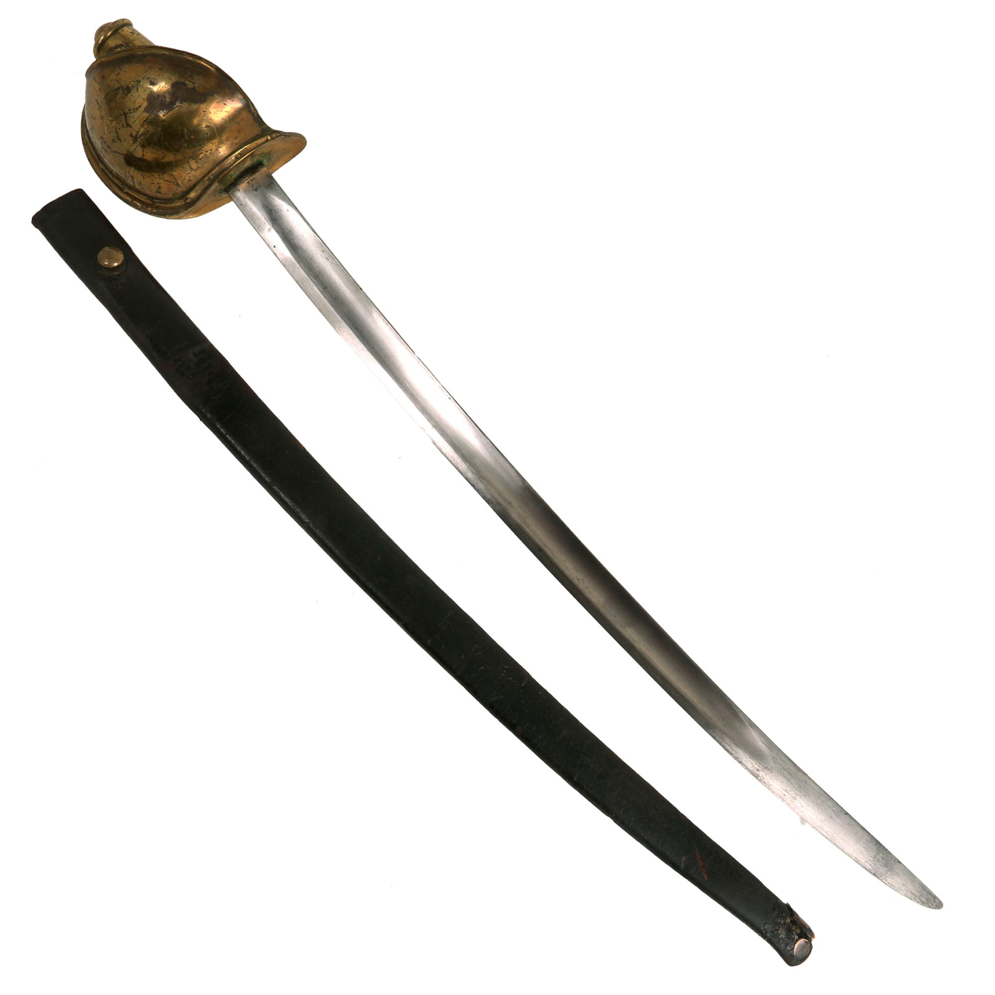 Original Item: Only One Available. Now this is a rare bird! This is a very nice example of the rarely seen U.S. Naval Cutlass, as used from 1860-1865. The boarding cutlass was derived from the French pattern of 1833, often referred to as a “cullere a pot,” or more commonly called the “soup ladle” weapon. It features all brass mounts, a wood with cord and leather wrapped sword grip, and a nice brass-fitted leather scabbard. The leather is in very good shape, looking to have had a protective coating applied in the past, and the leather blade buffer is present too. These were NEVER bound in brass wire even though there are grooves.