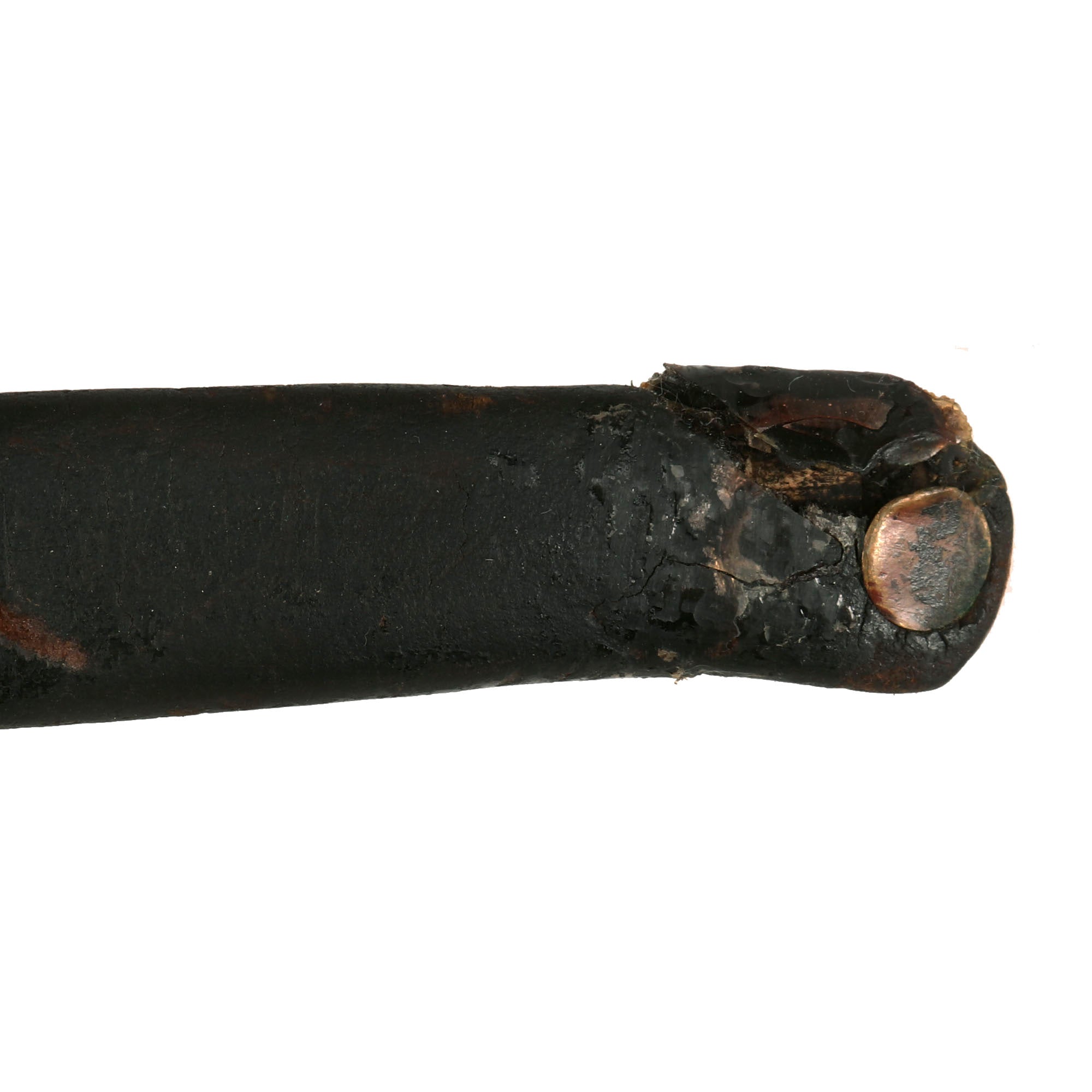 The included leather scabbard is in very nice condition, with the expected wear from service and age. It has the correct row of brass rivets down the left side of the scabbard, with one on the right side. These are all intact, however the leather is torn a bit at the bottom, and it looks like the tear was partly glued back together. It still has much of the original black finish, though it is cracking and flaking in places, and the brass fittings are oxidized. The scabbards usually rotted away and are very seldom seen, making this a prime example.