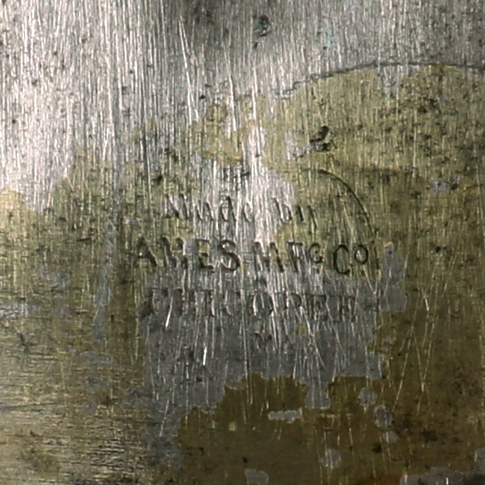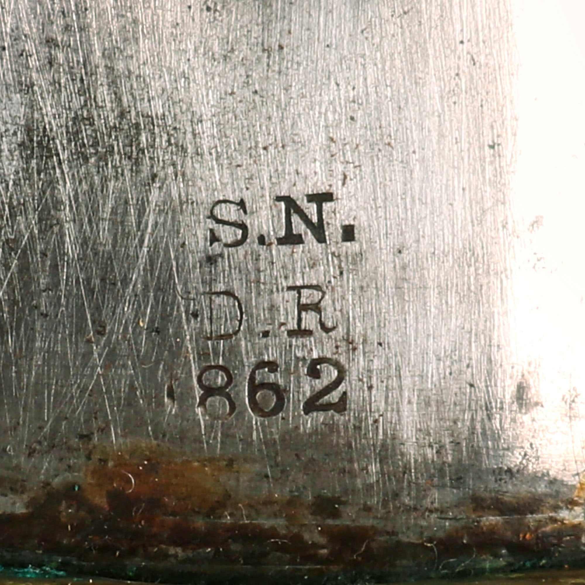 The blade is in very good condition, showing a mostly bright finish, showing some wear and past pitting. It does show signs of cleaning and probably sharpening, and is now about 3/4" shorter than when originally made, with the tip being a bit rounded off. There is an additional inspector D.R. mark on the pommel, indicating inspection by Daniel Reynolds, one of many inspectors working at Ames during the U.S. Civil War. The underside of the guard is marked with rack number 1 7 M / 5 7 8. The guard as a whole was cleaned and lacquered long ago, which has now yellowed and chipped in areas. Some is even on the blade as well.