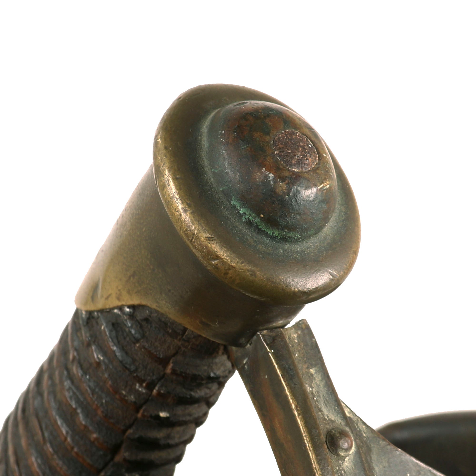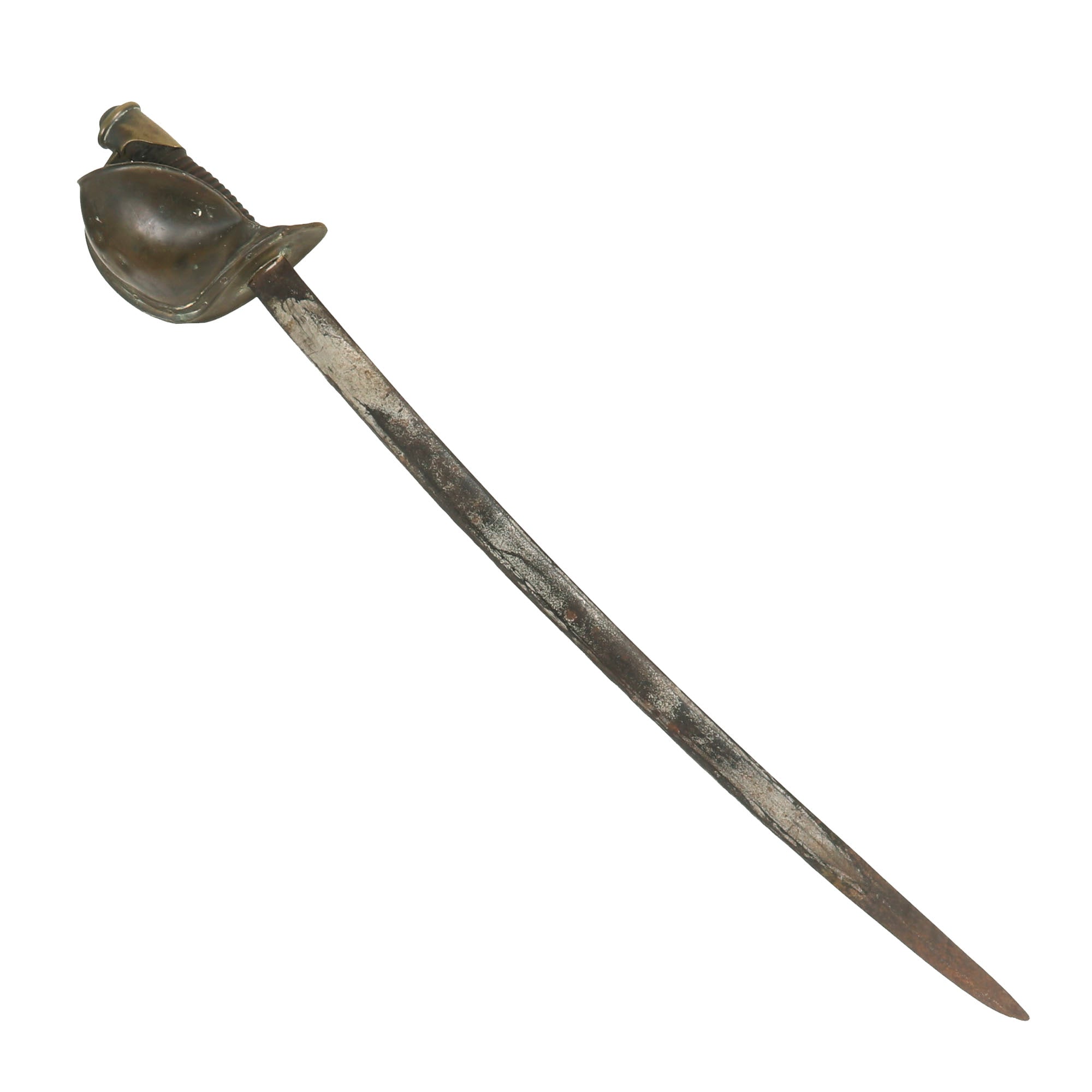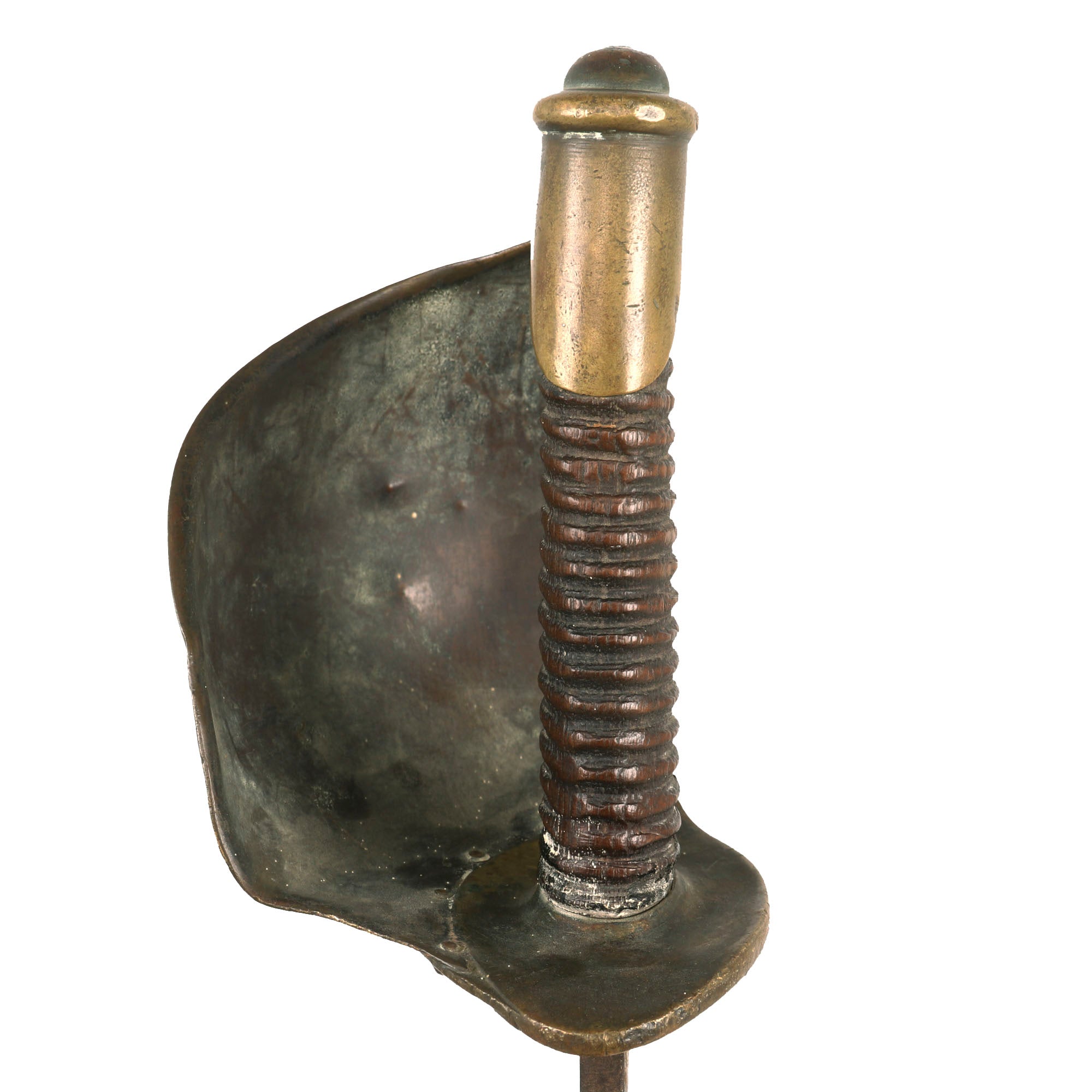 Original Item: Only One Available. This is a fair example of the rarely seen U.S. Naval Cutlass, as used from 1860-1865. The boarding cutlass was derived from the French pattern of 1833, often referred to as a “cullere a pot,” or more commonly called the “soup ladle” weapon. It features all brass mounts and a leather-wrapped wooden sword grip. These were never bound in brass wire even though there are grooves. There are 2 cracks in the handle which make a piece of the grip loose.