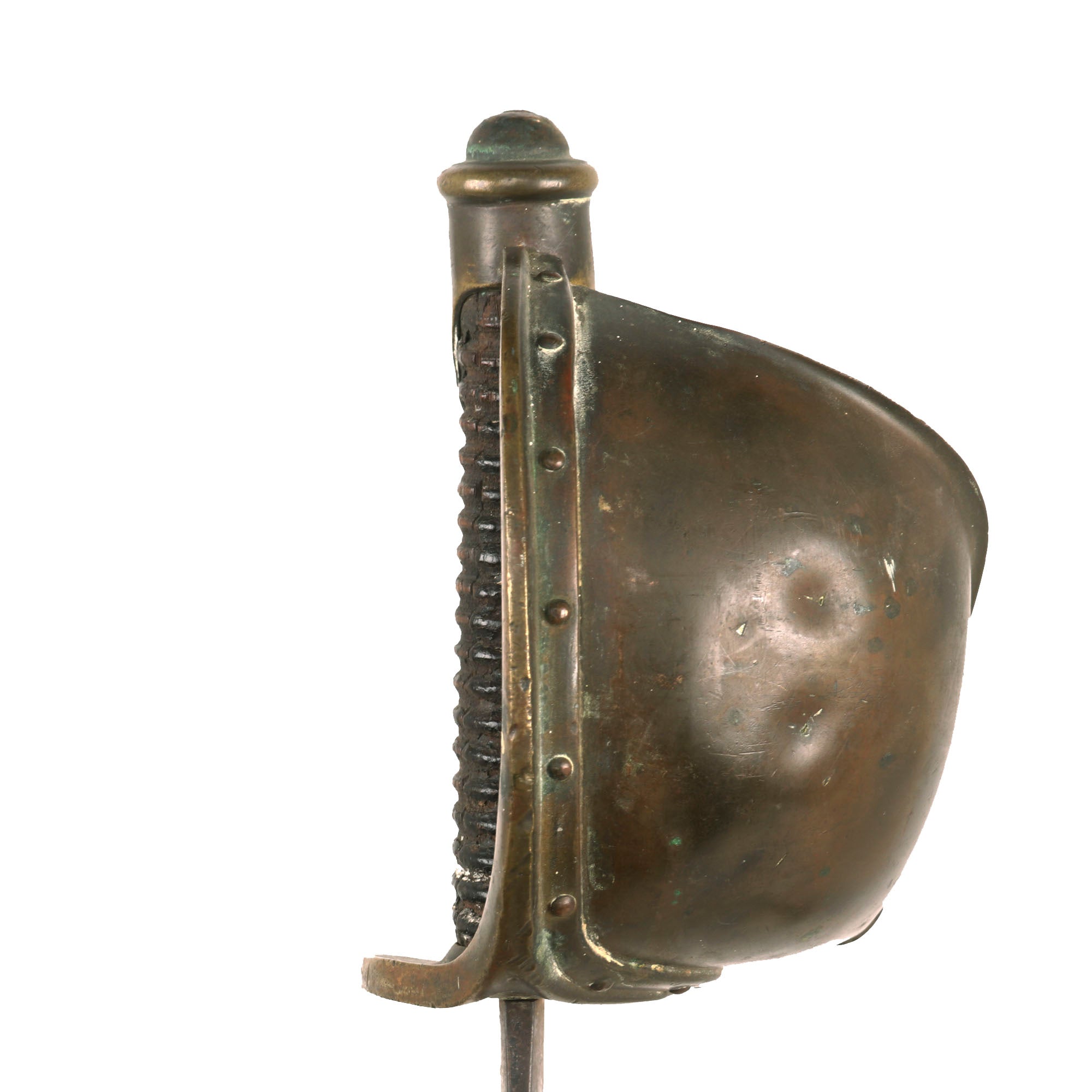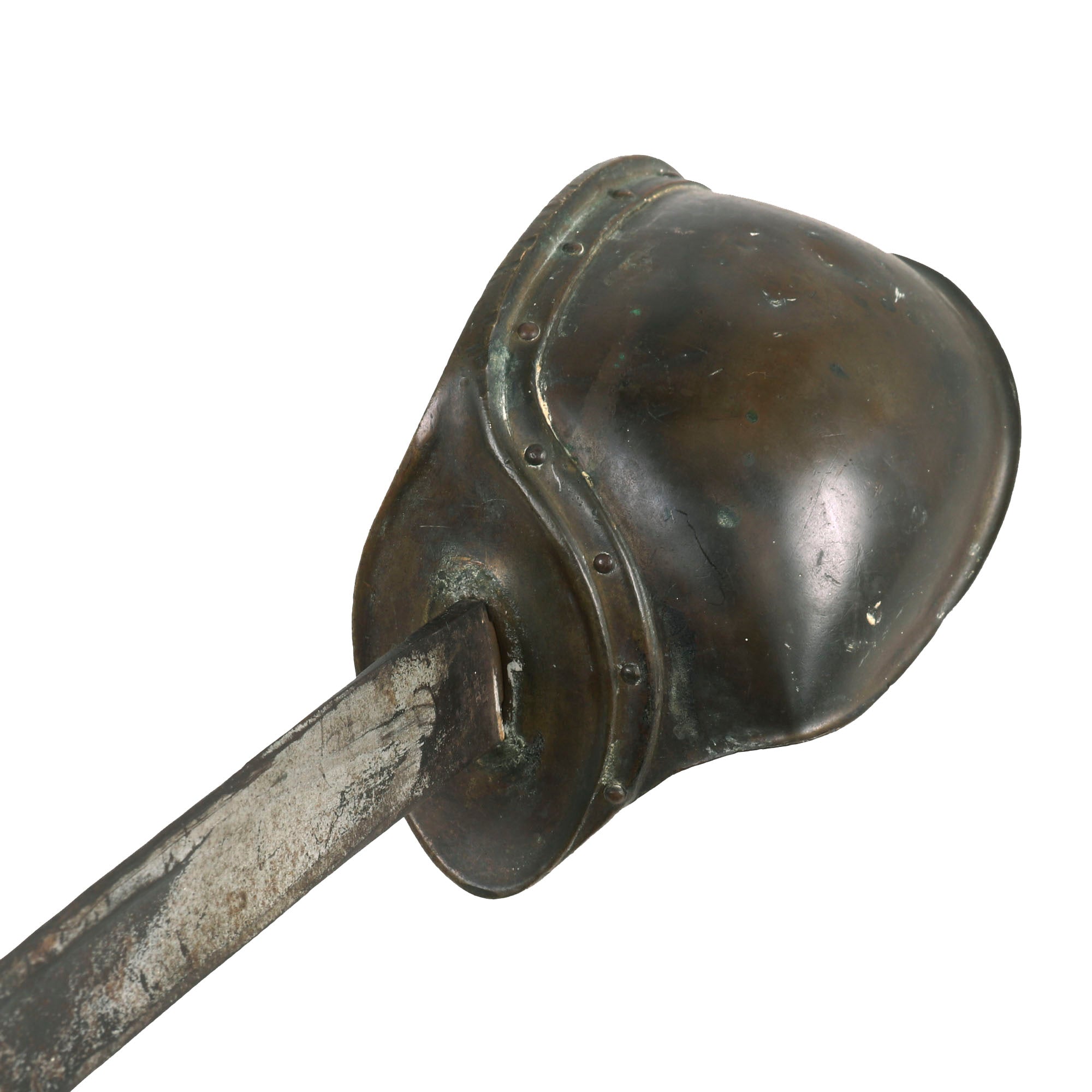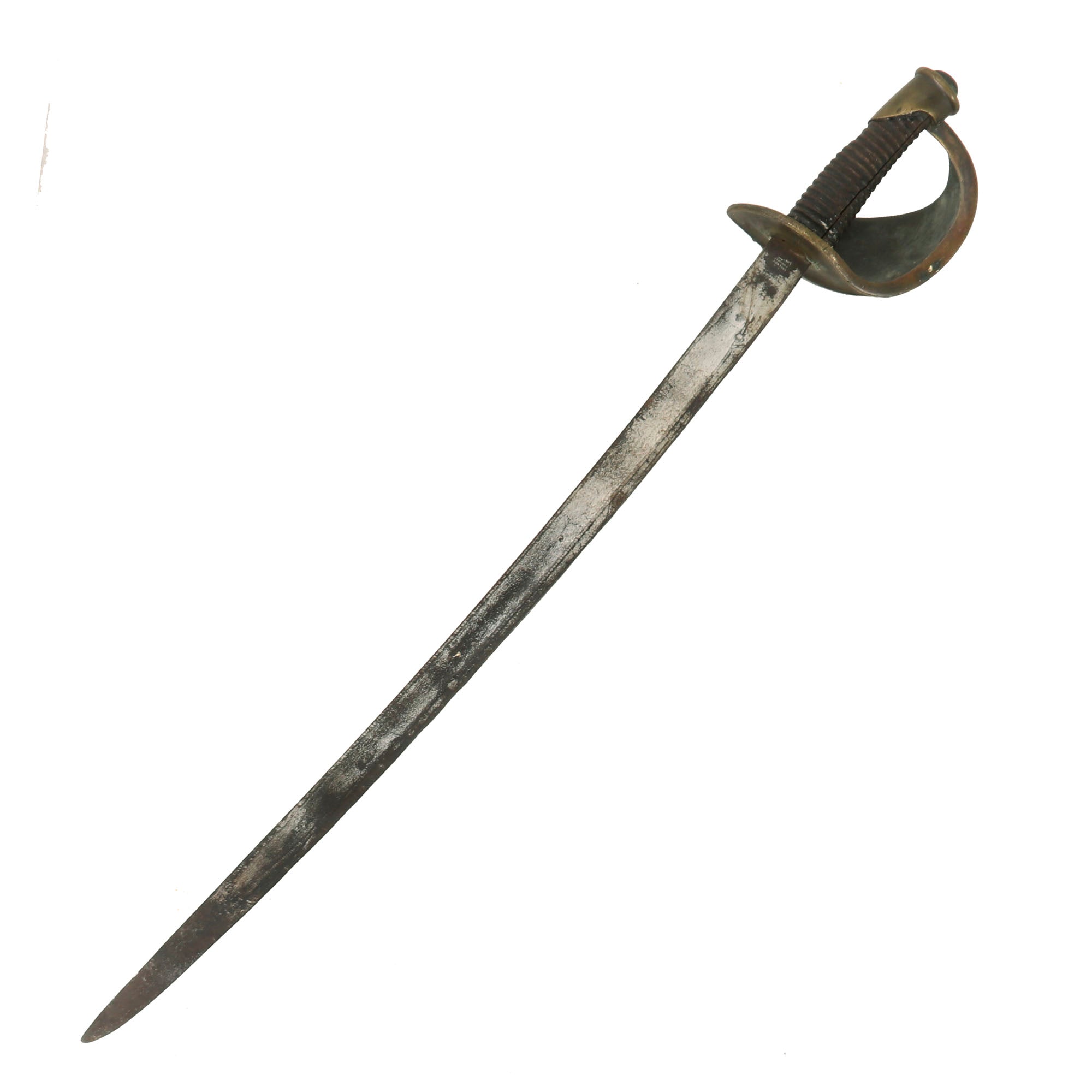 Original Item: Only One Available. This is a fair example of the rarely seen U.S. Naval Cutlass, as used from 1860-1865. The boarding cutlass was derived from the French pattern of 1833, often referred to as a “cullere a pot,” or more commonly called the “soup ladle” weapon. It features all brass mounts and a leather-wrapped wooden sword grip. These were never bound in brass wire even though there are grooves. There are 2 cracks in the handle which make a piece of the grip loose.