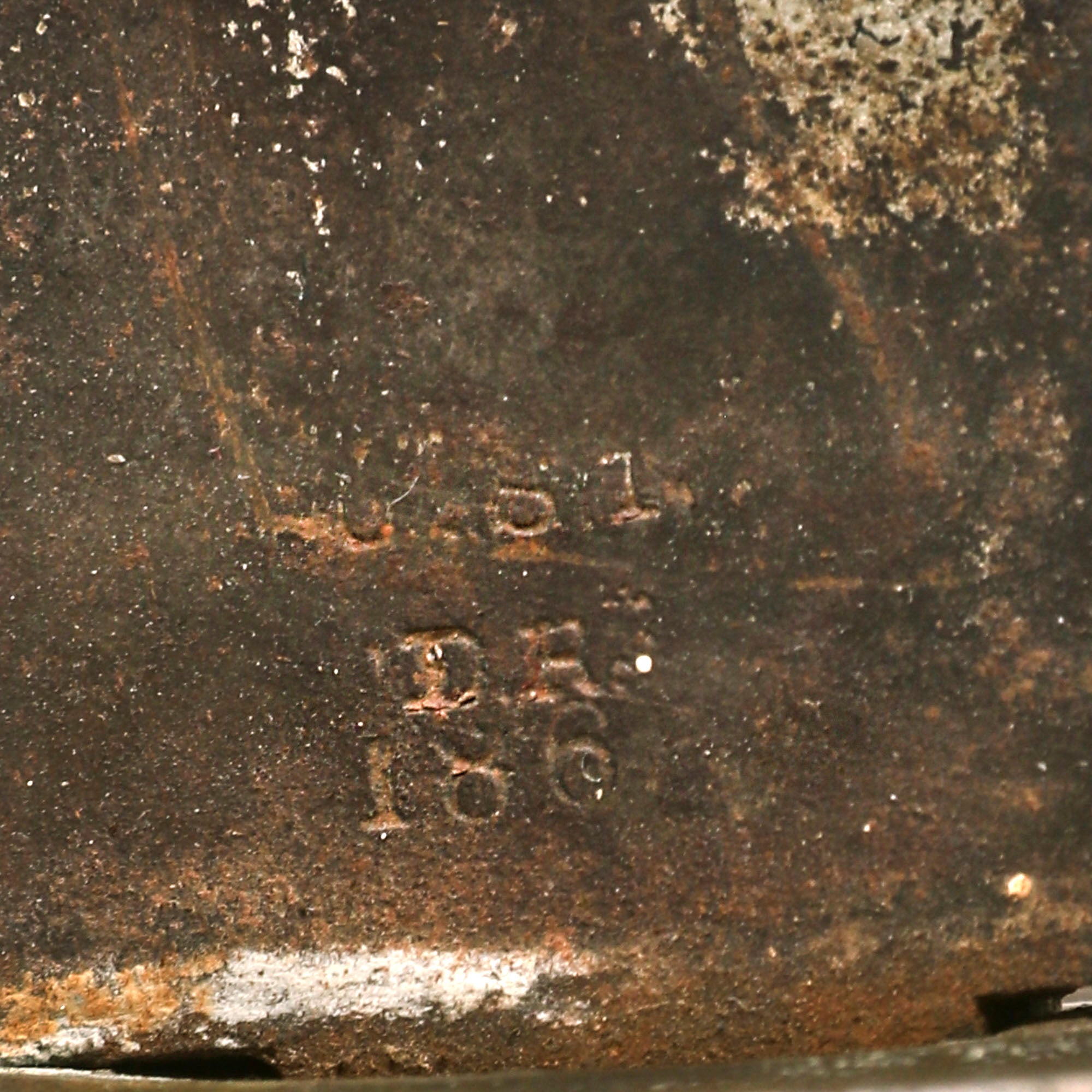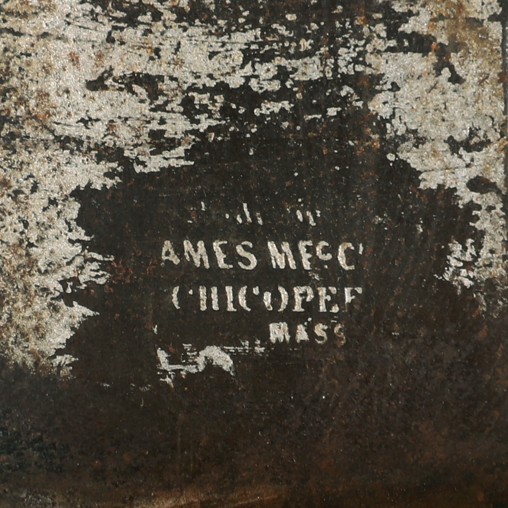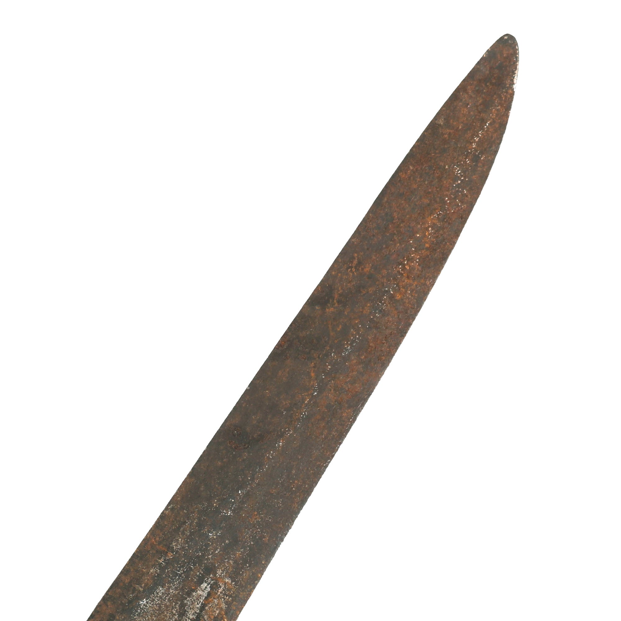The blade, having been without its scabbard for so long, is in very rough shape with oxidation and heavy wear, as well as multiple dents across. This heavy wear does give the cutlass a great patina that makes it look as old as it is. There is an inspector D.R. mark on the ricasso, indicating inspection by Daniel Reynolds, one of many inspectors working at Ames during the U.S. Civil War. The blade is still tightly connected to the hilt which itself has a great worn patina. The only real issue with the hilt is the cracks in the leather-covered wooden grip as previously mentioned. The leather is almost all gone but some remnants can be seen.
