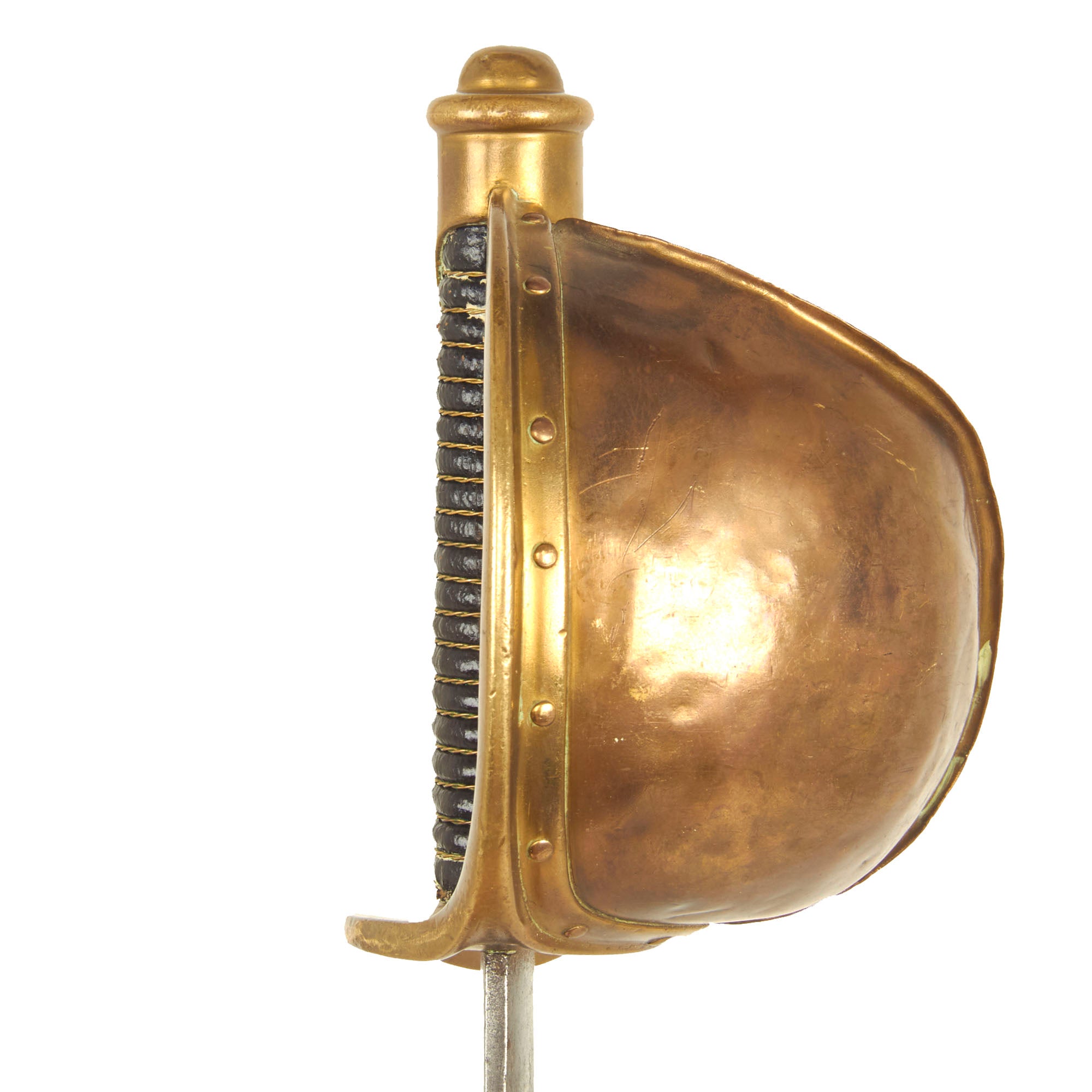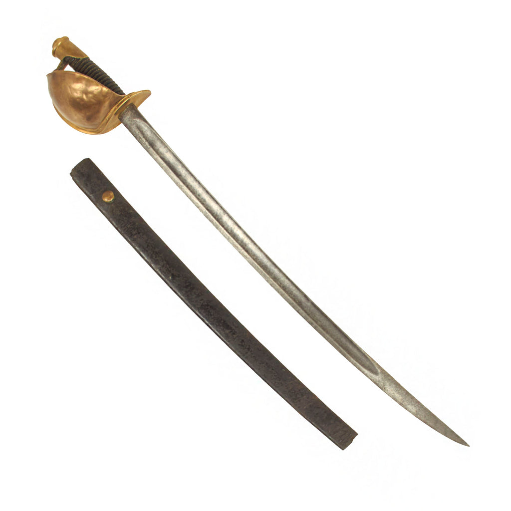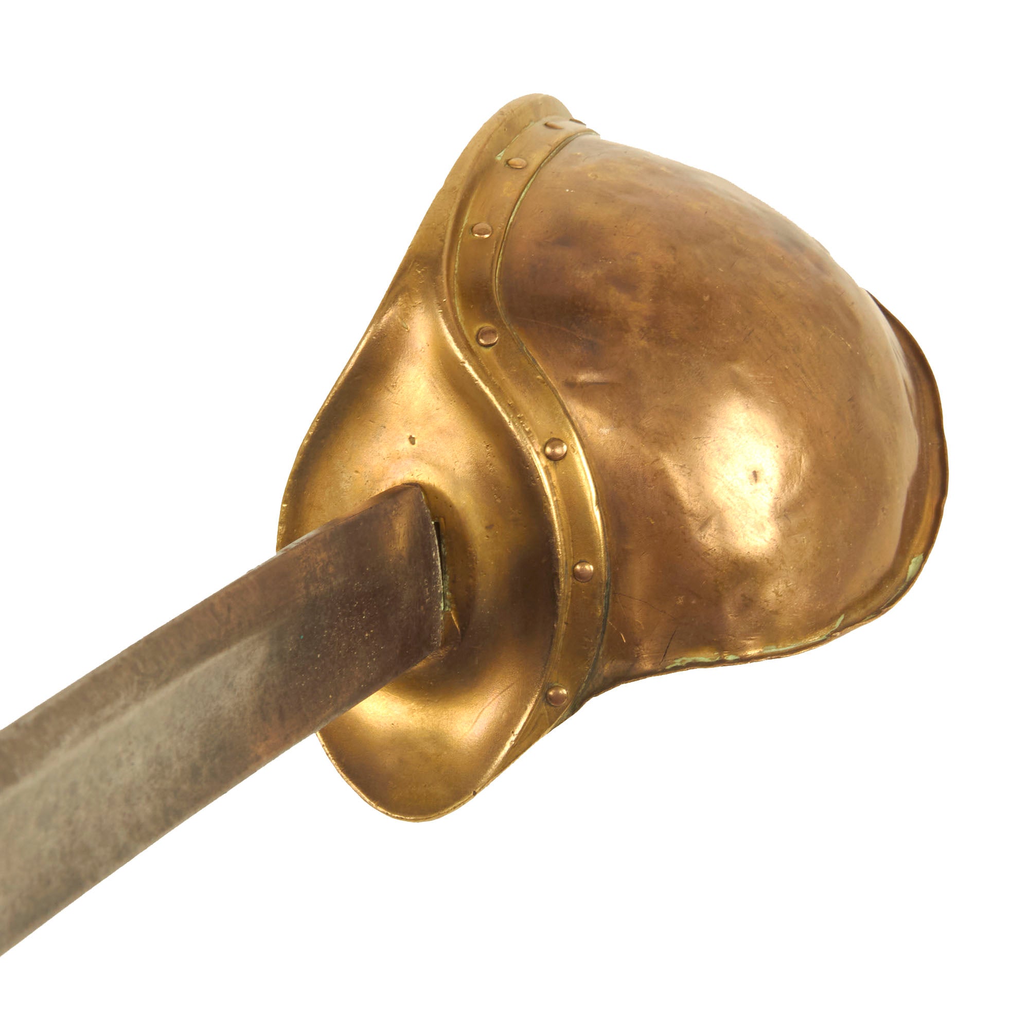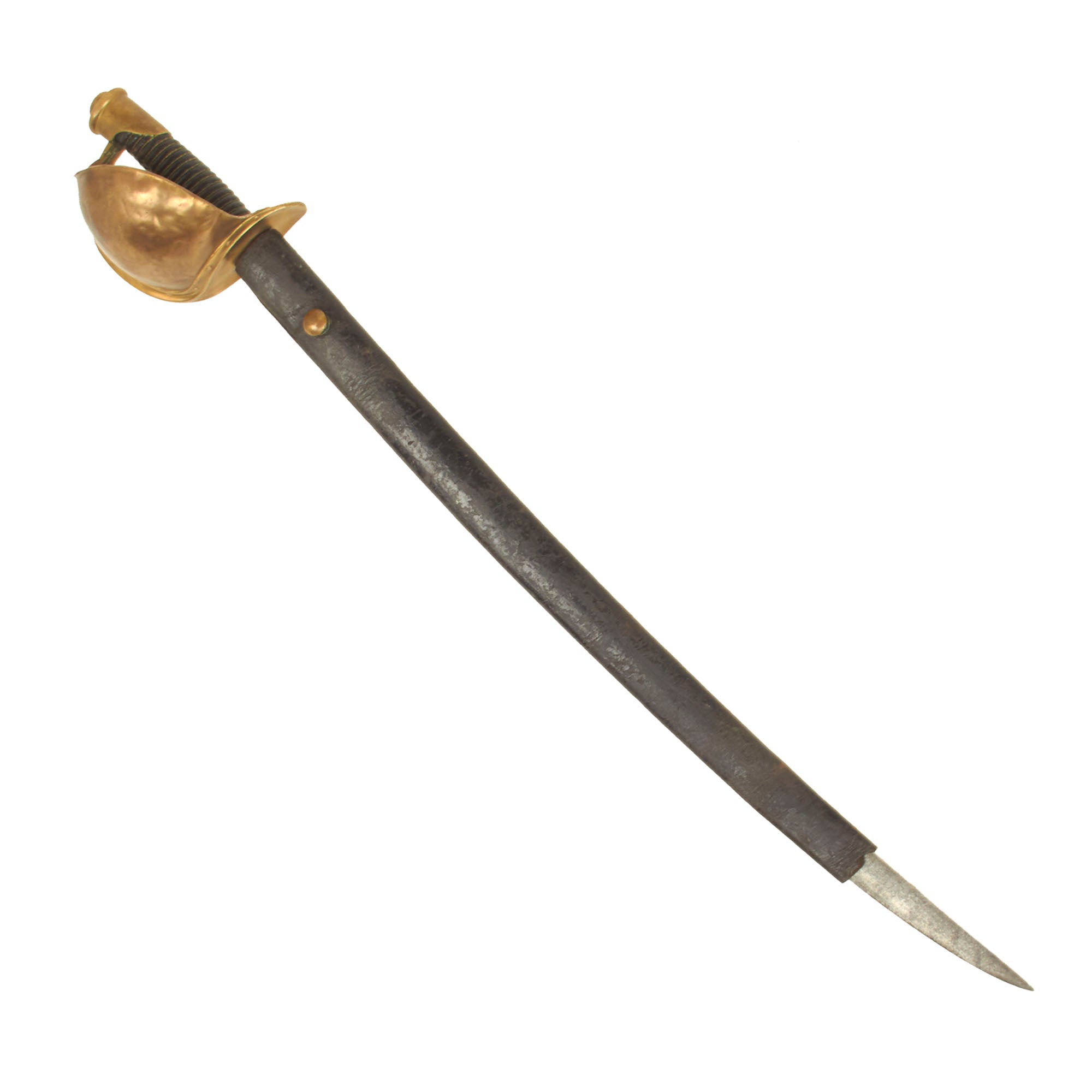 Original Item: Only One Available. Now this is a rare bird! This is a very nice example of the rarely seen U.S. Naval Cutlass, as used from 1860-1865. The boarding cutlass was derived from the French pattern of 1833, often referred to as a “cullere a pot,” or more commonly called the “soup ladle” weapon. It features all brass mounts, a wood with leather wrapped sword grip, and a nice brass-fitted leather scabbard. The leather of the grip is somewhat intact and nearly all of the wire wrap is missing.