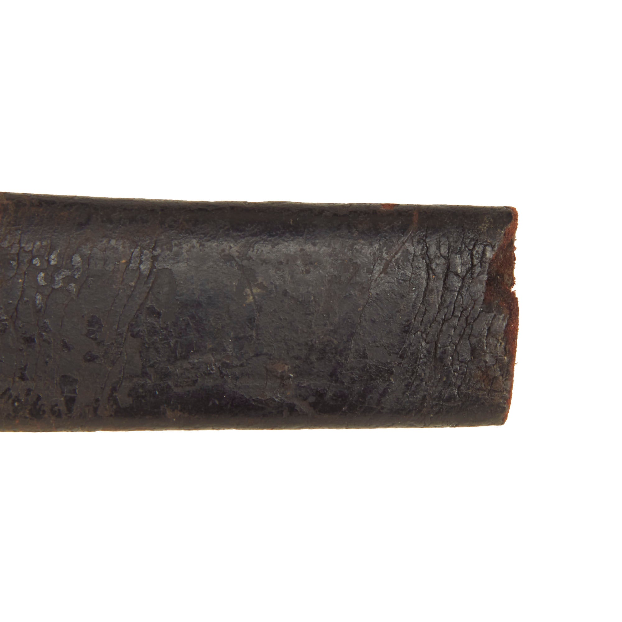 The included leather scabbard is in very nice condition, with the expected wear from service and age. It still has most of the original black finish, though it is cracking in places, and the brass fittings are oxidized, with light denting. The scabbards usually rotted away and are very seldom seen. This scabbard is certainly period manufactured and is the typical type seen with the Ames produced cutlass as it does have rivets down the back side.