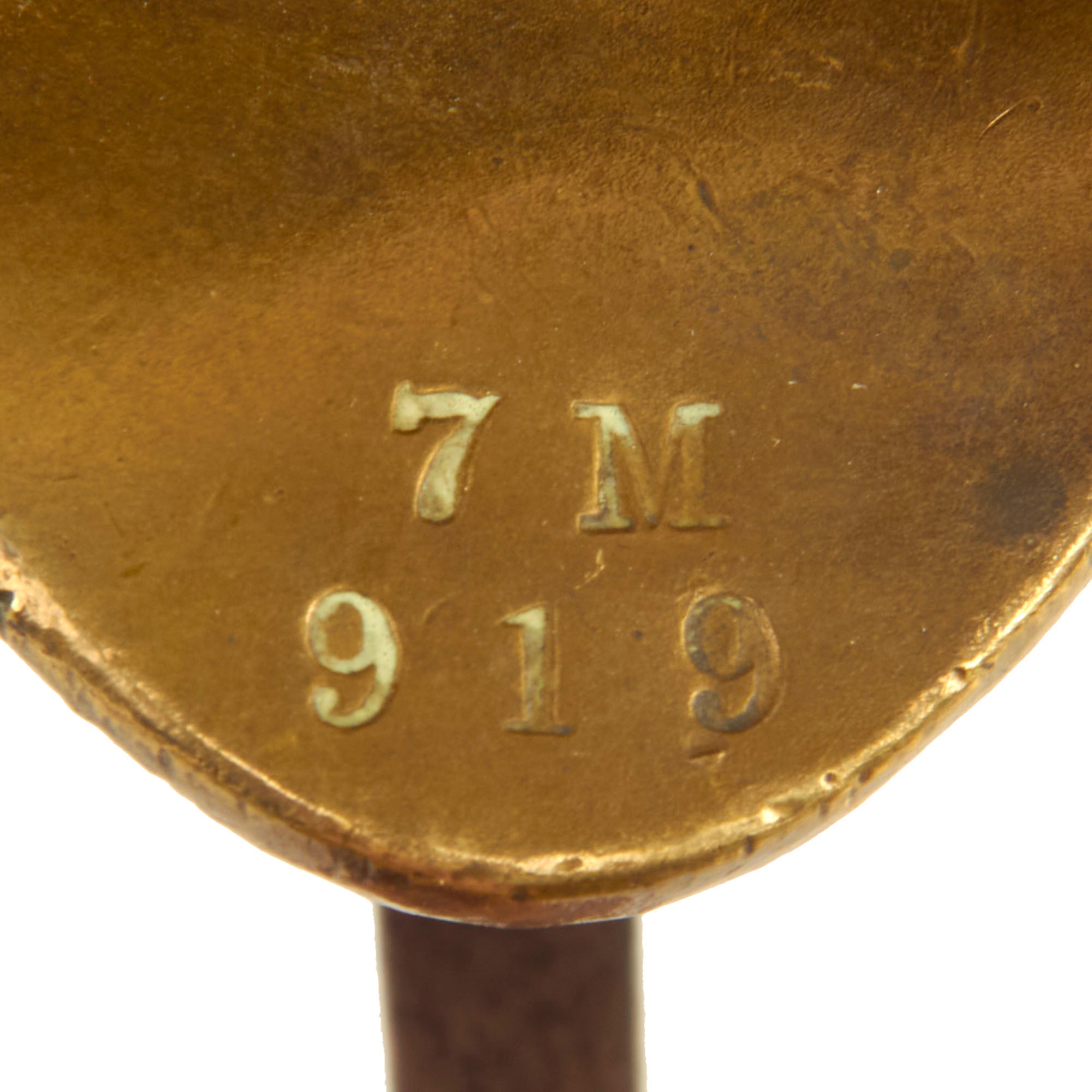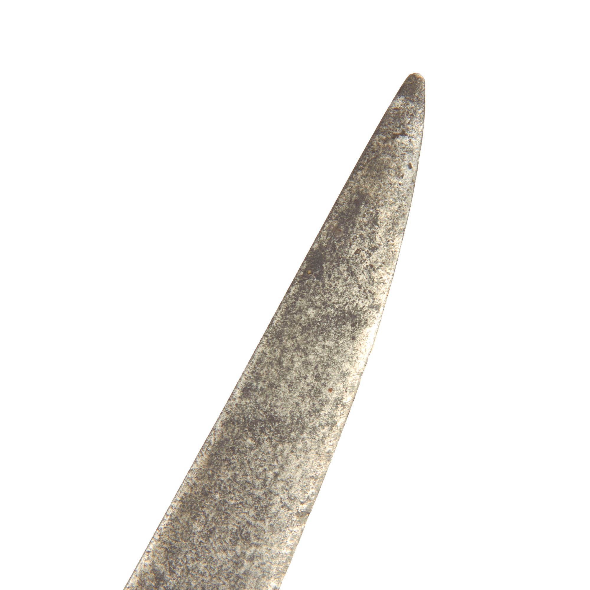 The curved 25 1/2 inch blade's ricasso no longer has any solid markings visible that we can find other than an extremely faint 1862 date. Ames was notorious for stamping their items very lightly and even brand new some were difficult to read. Now we do not know this is an Ames example, it does share the same characteristics as them.