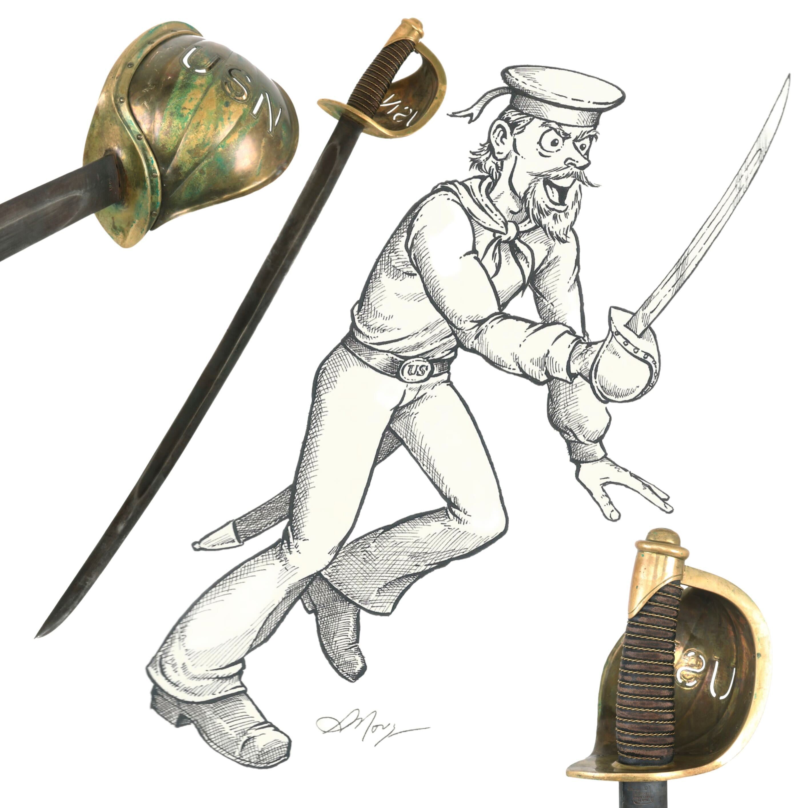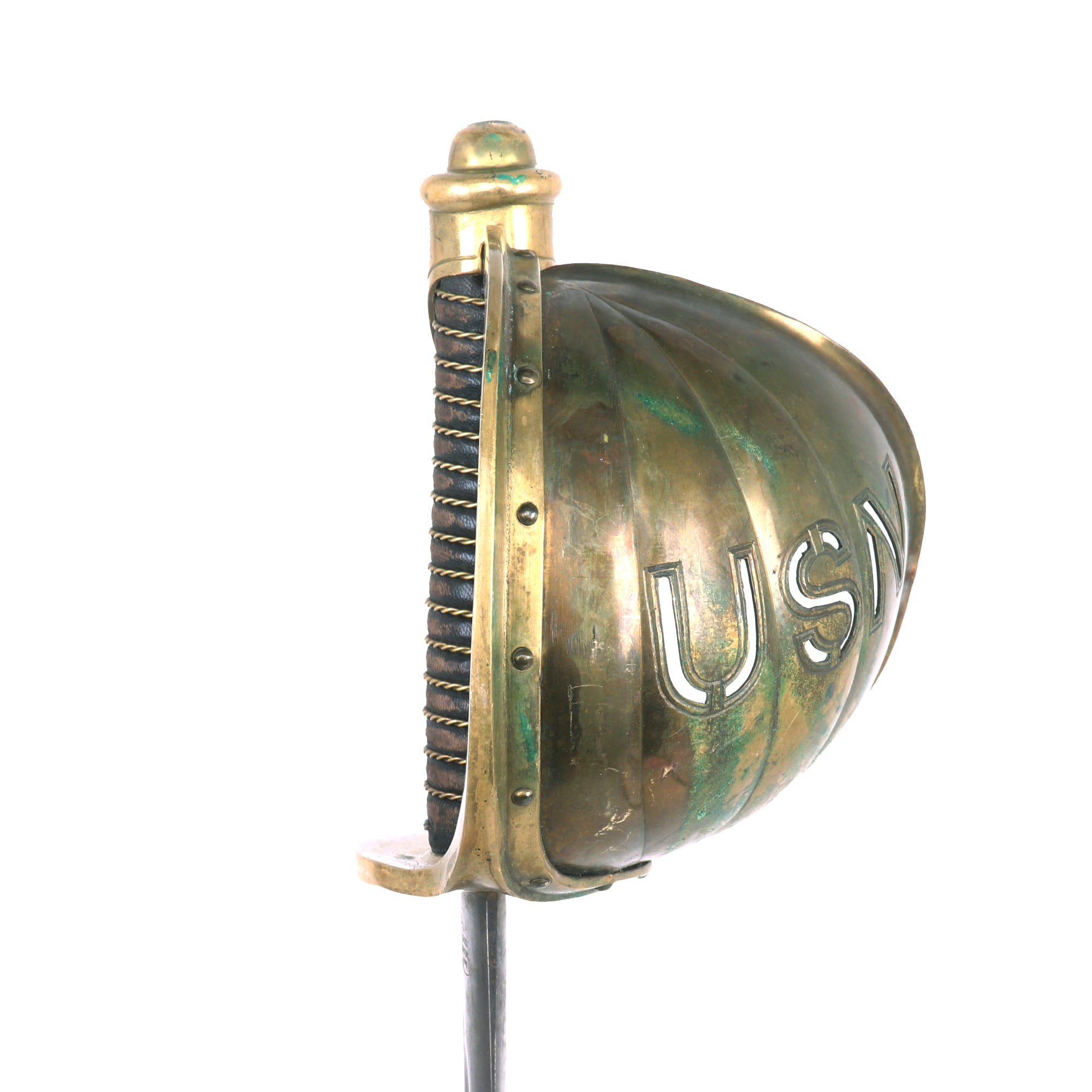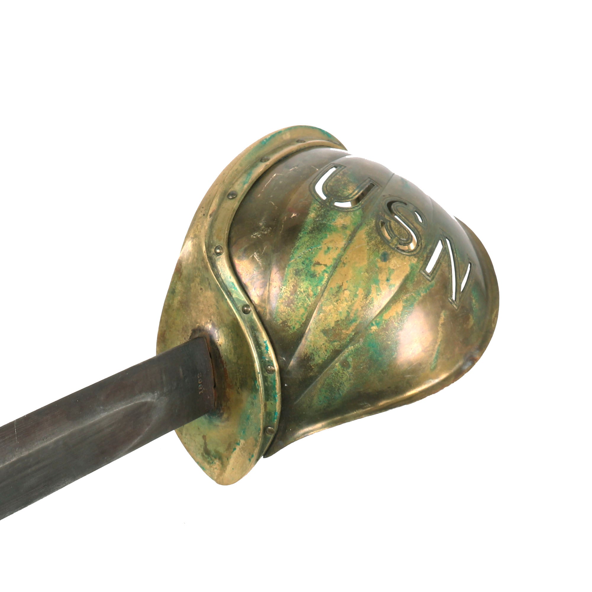 Original Item. Only One Available. In addition to the standard Model 1860 seaman’s cutlasses, the US Navy acquired a very small number of cutlasses for “officers”. These differed from the standard cutlass in that the brass basket was gilt, with the letters USN die cut out of its face. The “officer’s” version of the cutlass was further enhanced with some simple border line engraving around the edges of the guard.