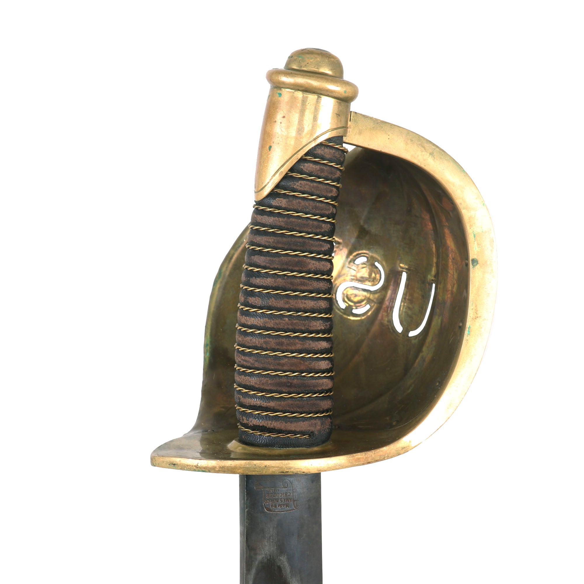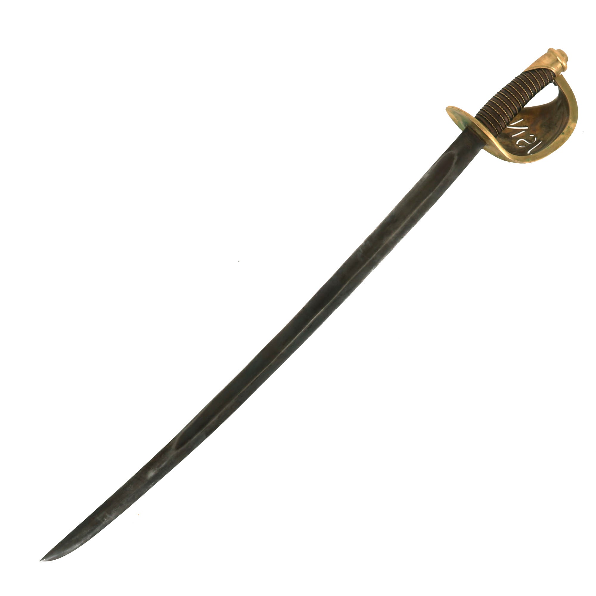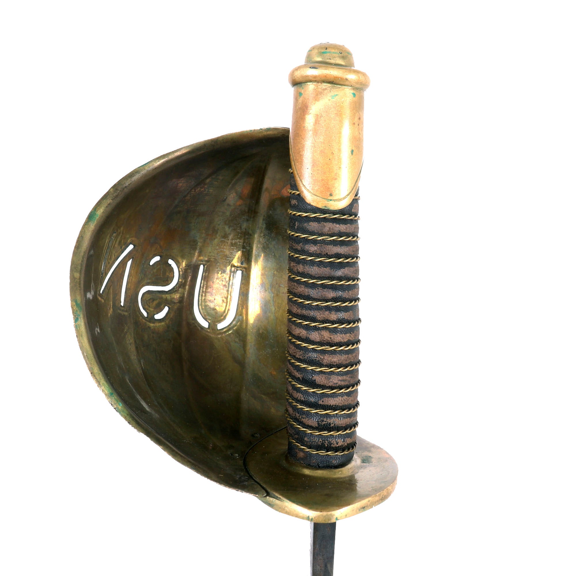 Original Item. Only One Available. In addition to the standard Model 1860 seaman’s cutlasses, the US Navy acquired a very small number of cutlasses for “officers”. These differed from the standard cutlass in that the brass basket was gilt, with the letters USN die cut out of its face. The “officer’s” version of the cutlass was further enhanced with some simple border line engraving around the edges of the guard.