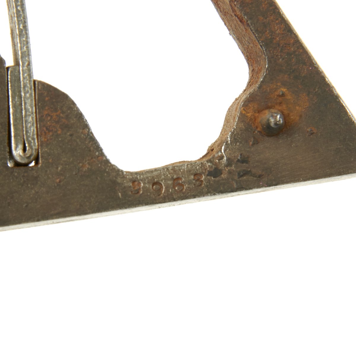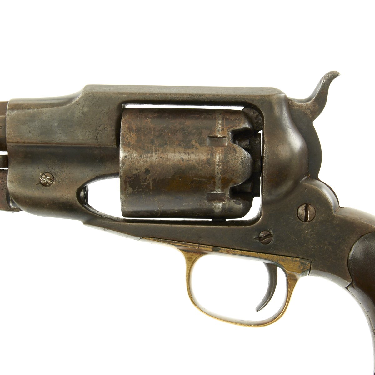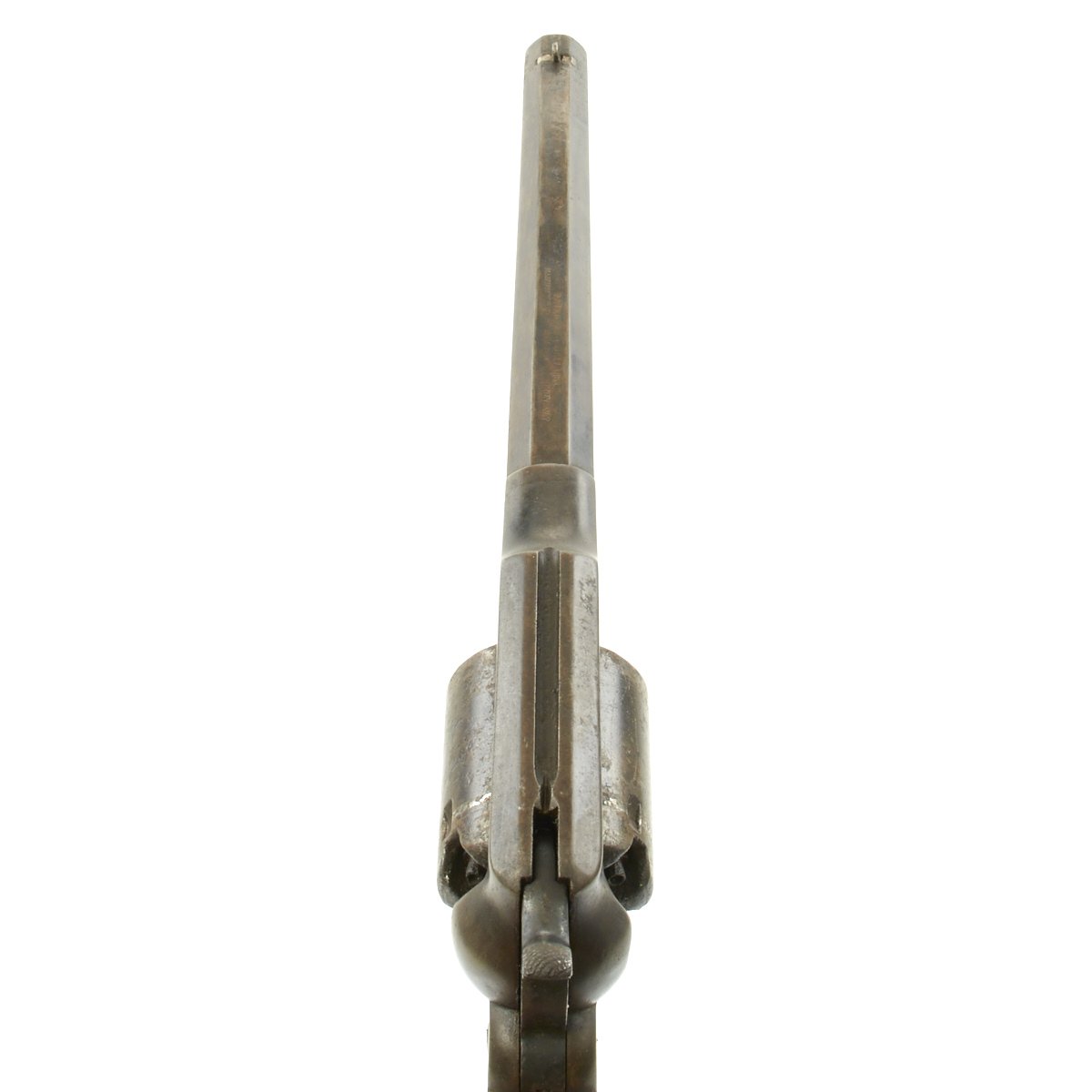 Overall condition is good with the original finish worn to a gray patina and light pitting around the frame and barrel area. The frame does show wear and some denting from age, indicating that this revolver was most likely in service after the war ended. Still bears walnut grips, though unfortunately the original cartouches are worn, and the left grip scale has a repaired crack. Both were varnished post-war. Revolver has a strong smooth action, with a good mainspring, and good cylinder lockup. As with any revolver this age, it can be finicky. Revolver has a good bore with strong lands and grooves, though the finish is dull with some corrosion. There are some inspection and assembly marks on the revolver, though many are worn. The cap nipples are original, however all are clogged and have surface corrosion from powder burn.