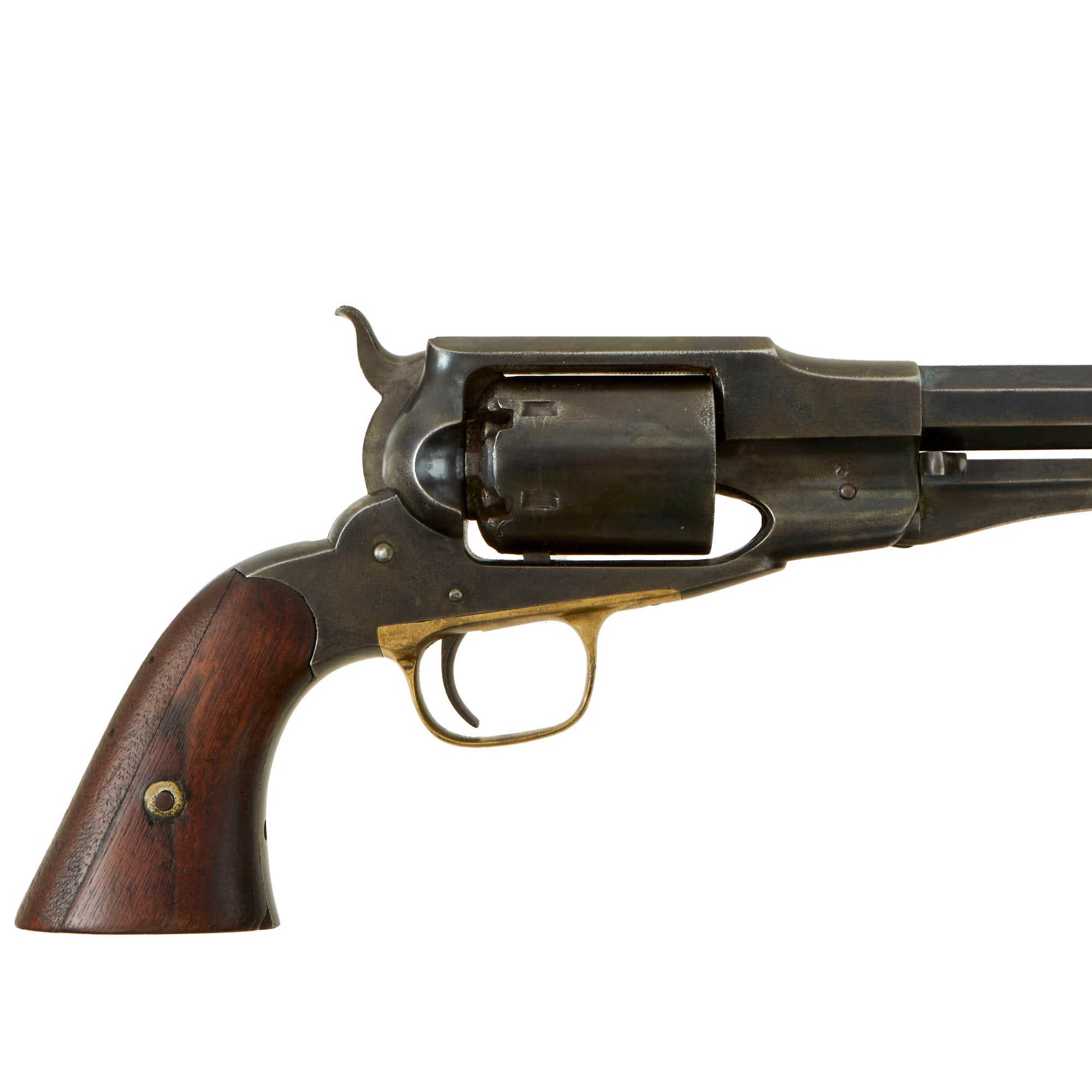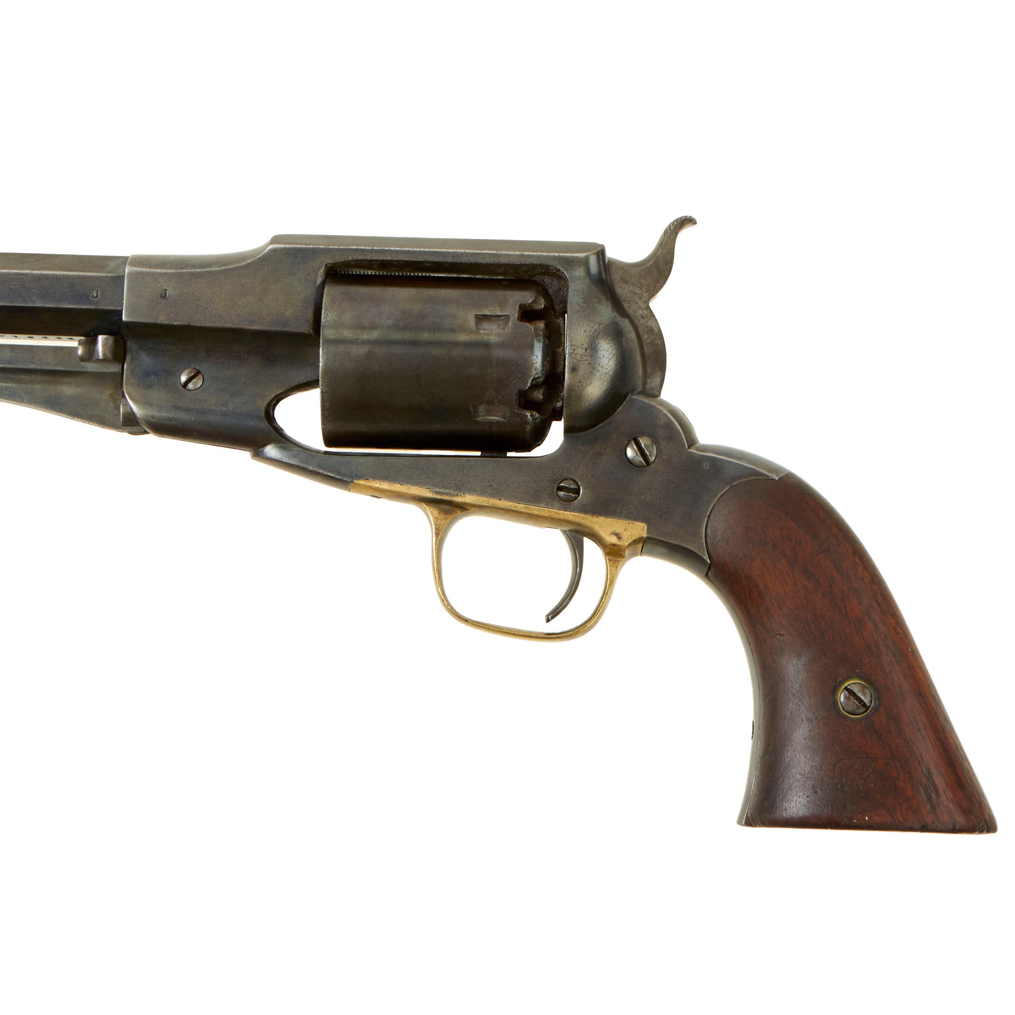 Overall condition is very good, with much of the original blued finish still remaining on the frame and barrel. There are a few areas of peppering and light rust, but this is definitely one of the best Remington Navy revolvers we have seen. The grips are in good shape, with a lovely color, and the left grip scale even still has a partially legible inspection cartouche! The right grip is in a bit worse shape, having cracked and and had a piece grafted onto the rear, making up about 1/4 of the grip.