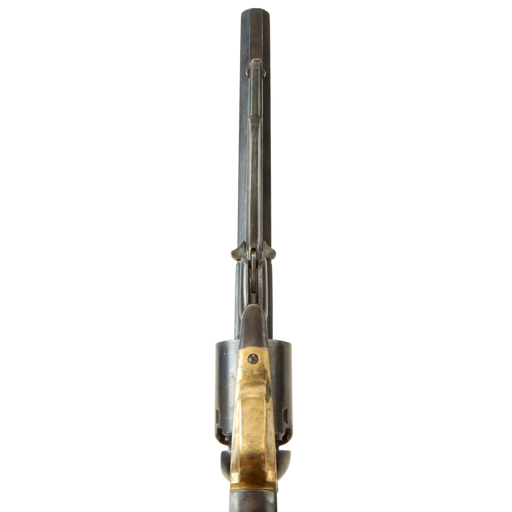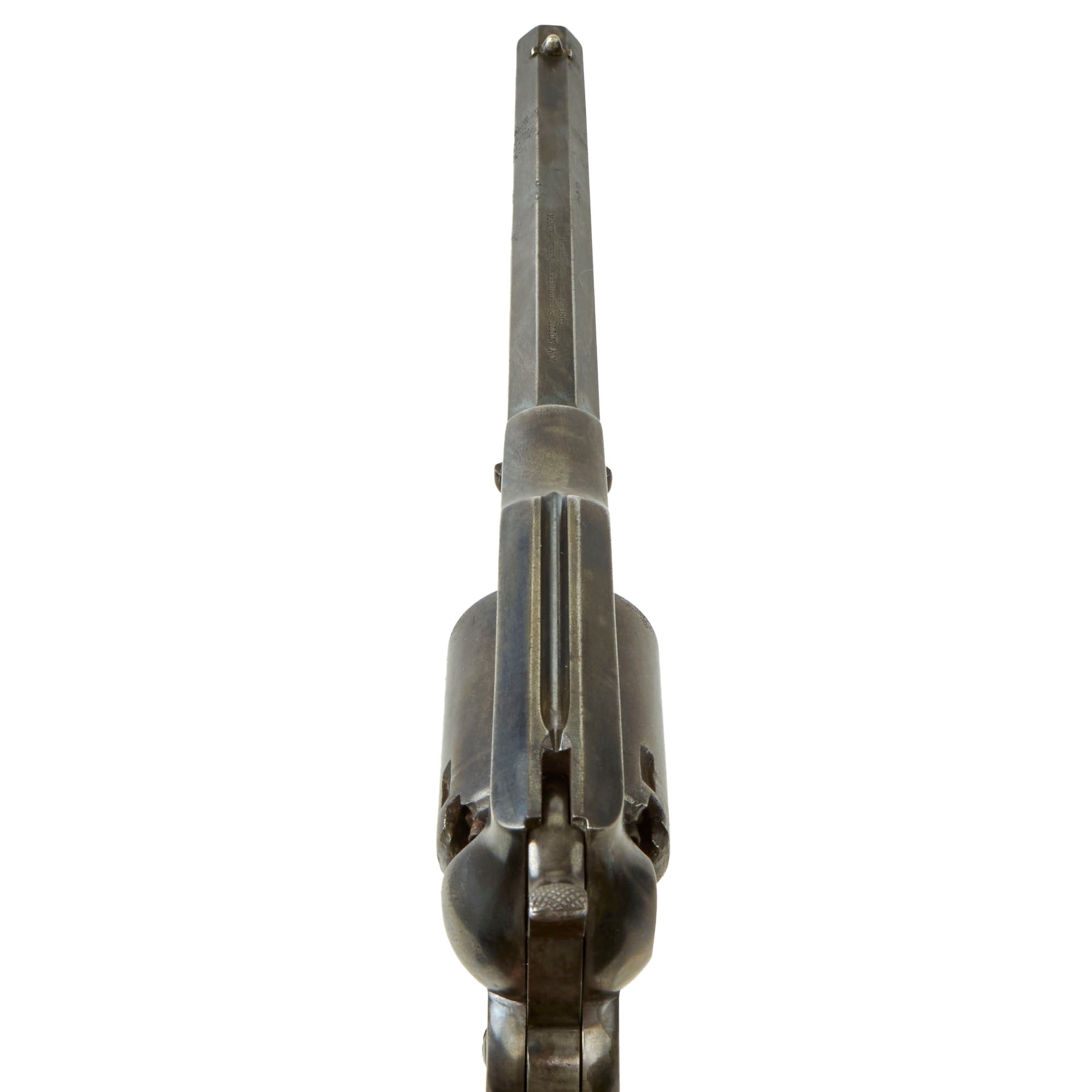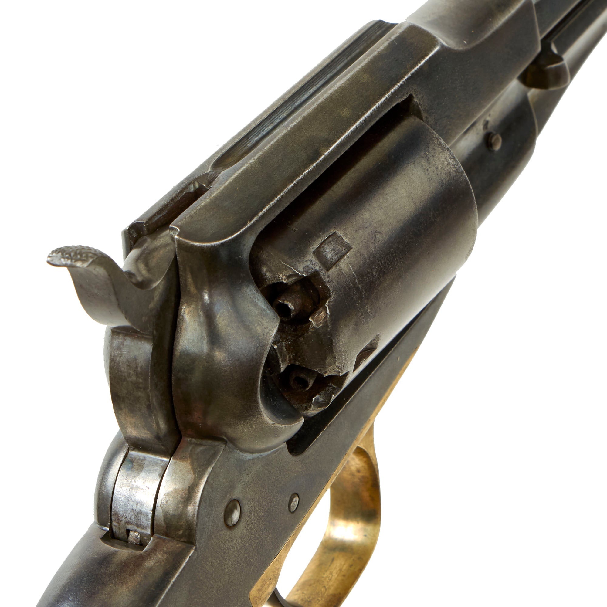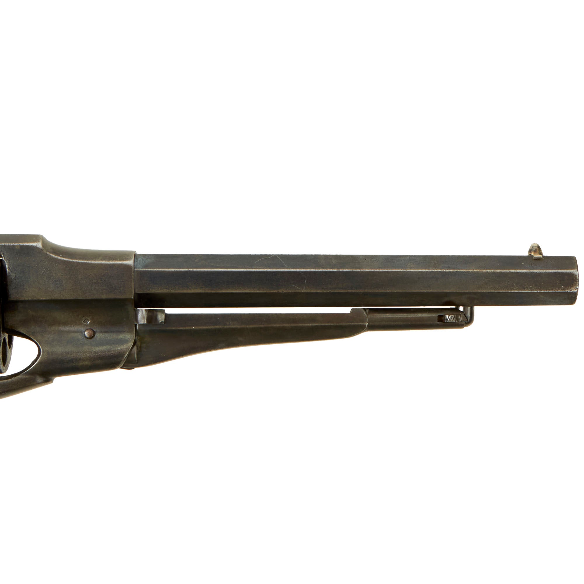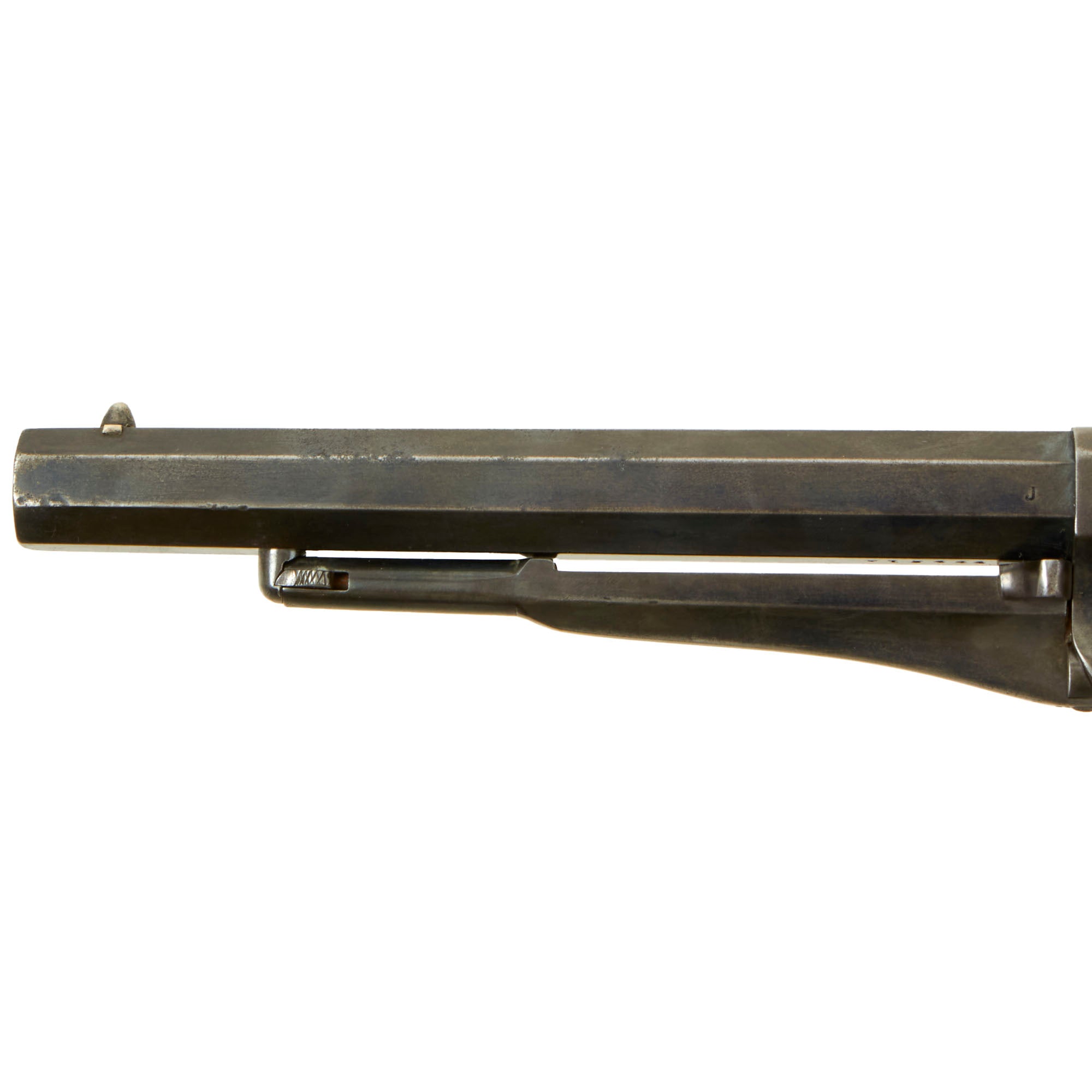 One of these was the "Safety Slots" milled between chambers on the cylinder. The milled slot positively secured the hammer between chambers for safe carry by placing the hammer's firing pin where it did not rest on a percussion cap, eliminating the risk of an accidental discharge if the gun was dropped or the hammer struck. This example does not have these, as it is an early example of the "Old Model" Navy. The changes to the revolvers were rolled out gradually, so features often overlap. It also has the correct "mortised" cone front sight, also seen on the early "New Model" Navy revolvers, but soon eliminated.