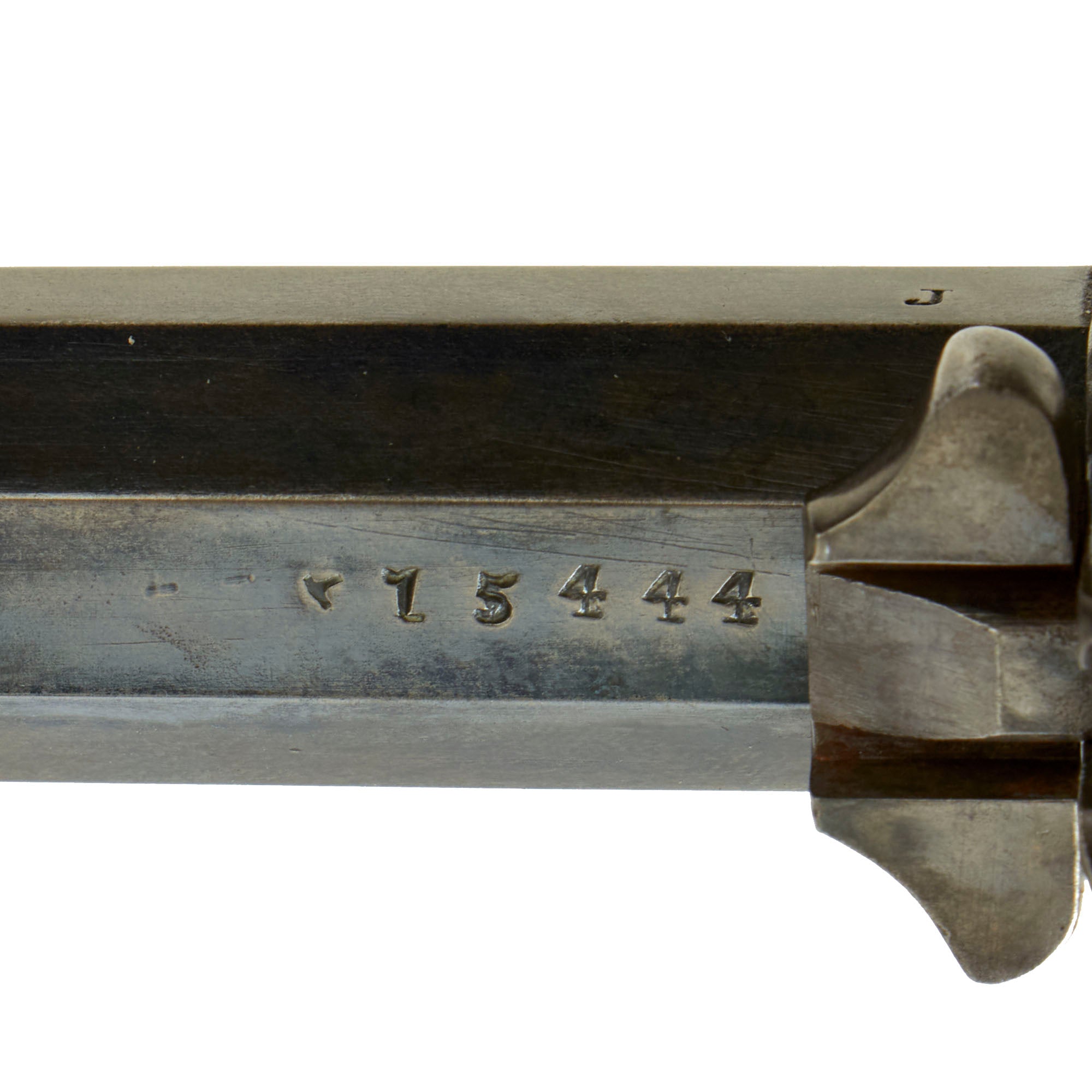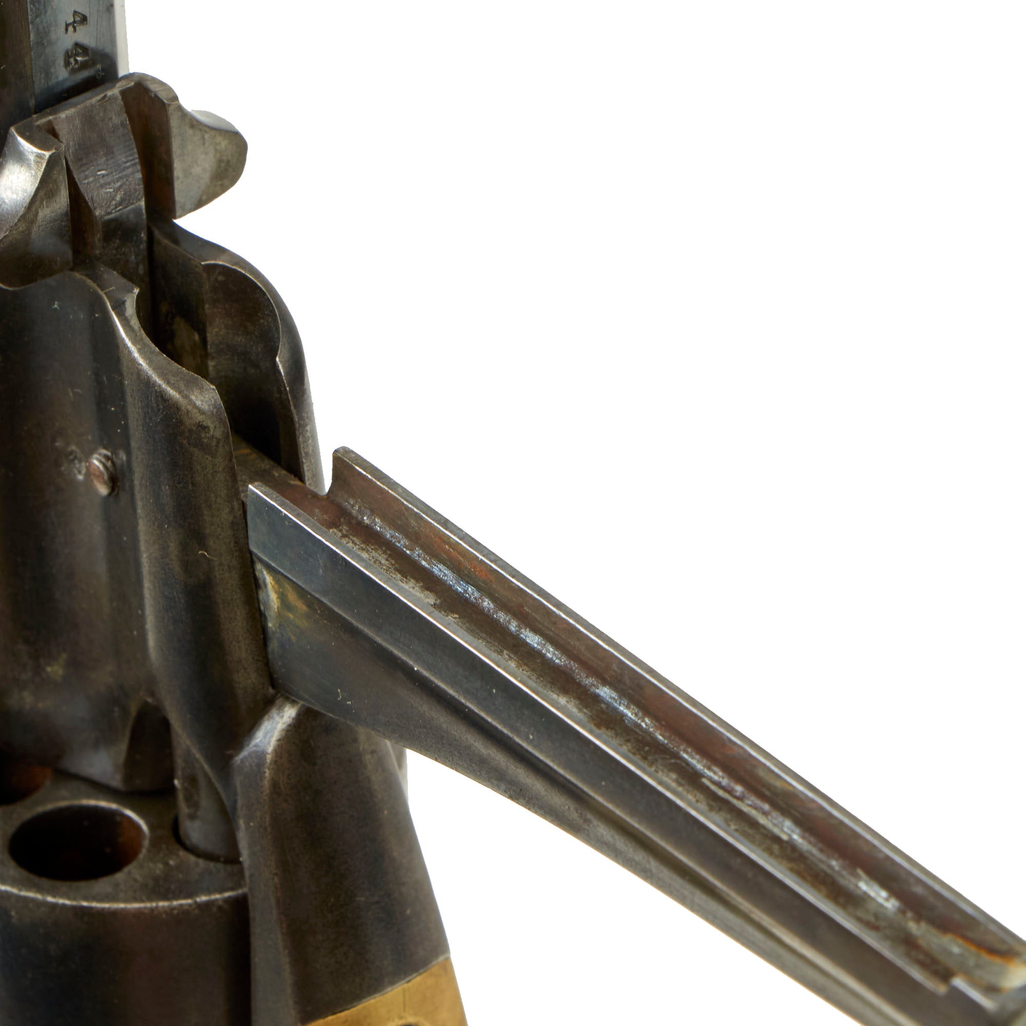 This revolver has partial matching serial numbers, with 15444 appearing on the underside of the barrel, and on the frame under the grip. We checked the cylinder, and unfortunately all markings have been worn away. The Remington Society of America indicates this serial number was most likely produced during July 1862, so this is a true civil war gun. Production of the Remington-Beals Navy went up to about serial number 14,500, so this is a relatively early example, and has all the correct features of an "Old Model" 1861 Navy.