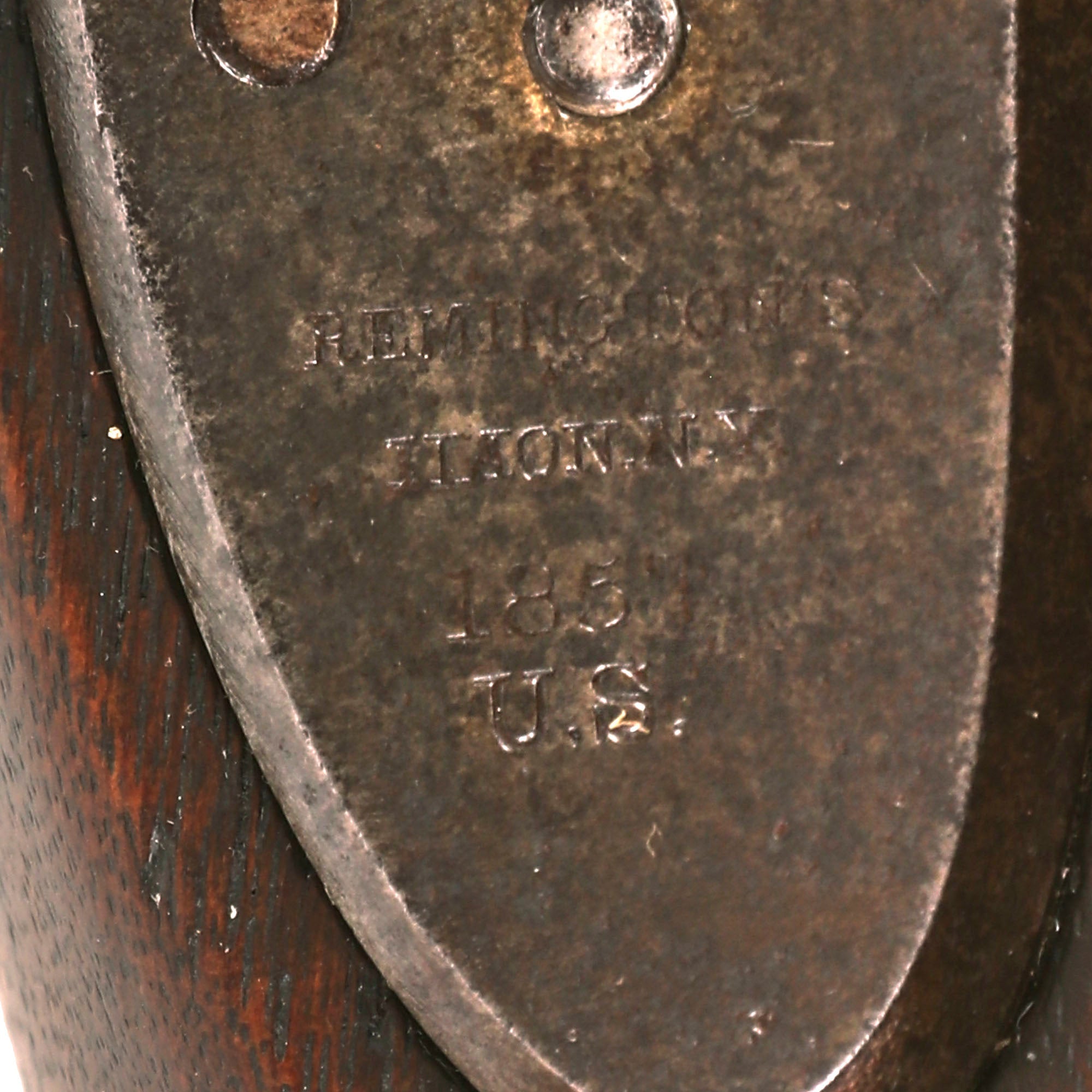The barrel tang is also dated 185?, and there is a faded inspection mark to the right of that. The left side of the breech is marked J.T. for inspector John Taylor, a Springfield Armory foreman who had supervised the manufacture of 6 pattern muskets for the alteration process. He was reassigned from inspection duties at Colt to the Remington factory to oversee and inspect the parts being made there. There are also some inspection marks stamped into some components, and the iron butt plate is stamped U.S.. The barrel is fitted with the standard ramp sight of the model 1855, which looks to have had the ladder and slider replaced, and is fully functional.