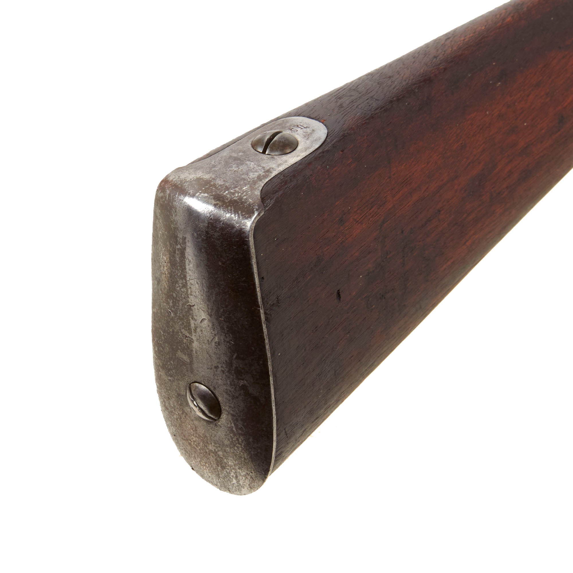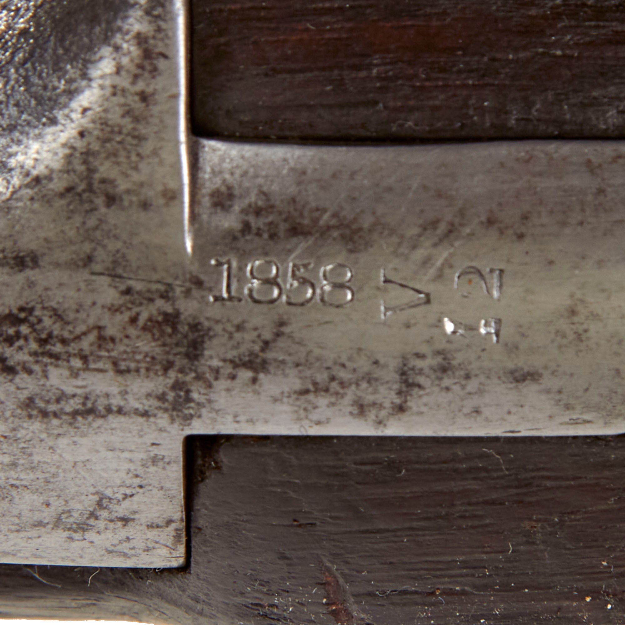 The musket's mounts are all of iron and have a lovely lightly oxidized patina over most parts. There is some powder burn around the original cap nipple on the barrel, so this musket did see some use once converted to percussion. However there is no major pitting, so it looks to have not been used once it was deemed obsolete. The original ramrod is still present, which looks to be a 1822 style. We checked the bore, and the three groove rifling is still clear, showing only light oxidation and fouling.